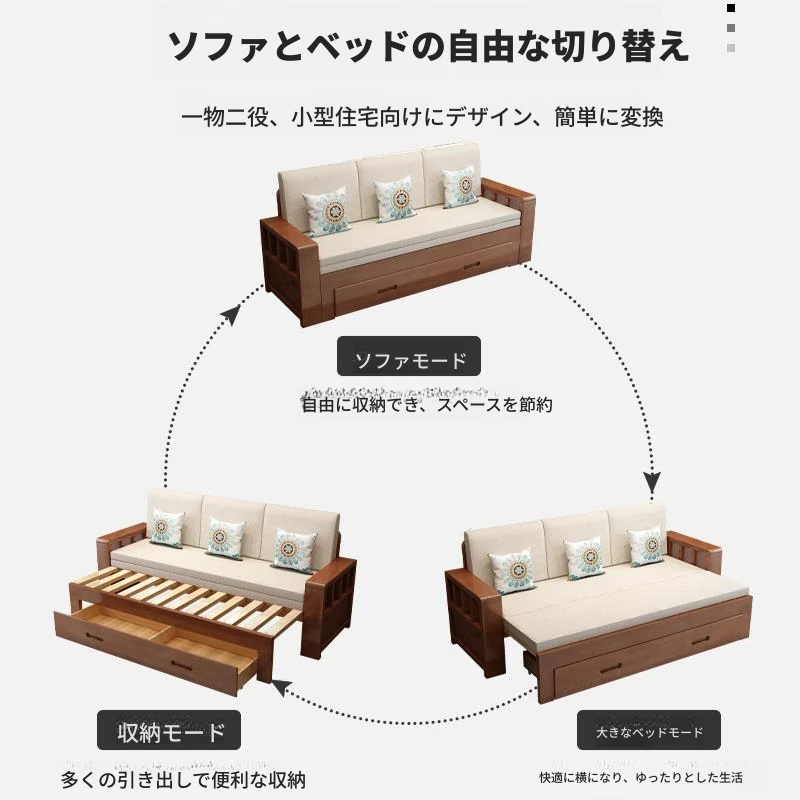 リビングにぴったり!多機能折りたたみ無垢材ソファベッド - プル式2WAYデザイン、小型住居に最適なトレンディなダブルサイズ!快適さとスタイルを両立させた新しい生活の提案。