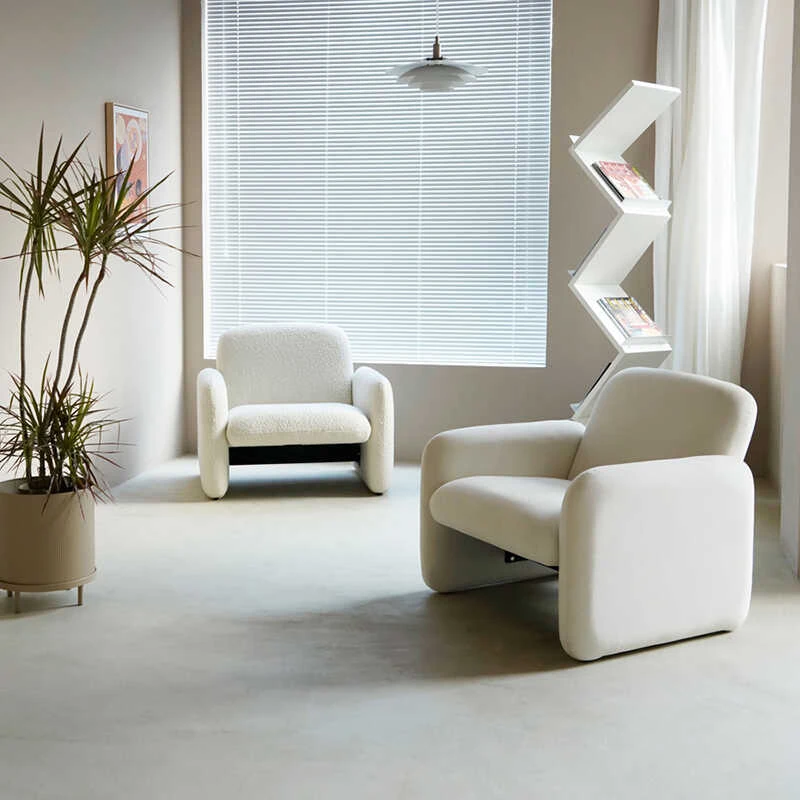 クリーミーな風合いの無垢材モダンリビング用一人掛けソファチェア|リラックスできるデザイン|羊毛フリースのバルコニー用ゲストチェア|宿泊施設にも最適!