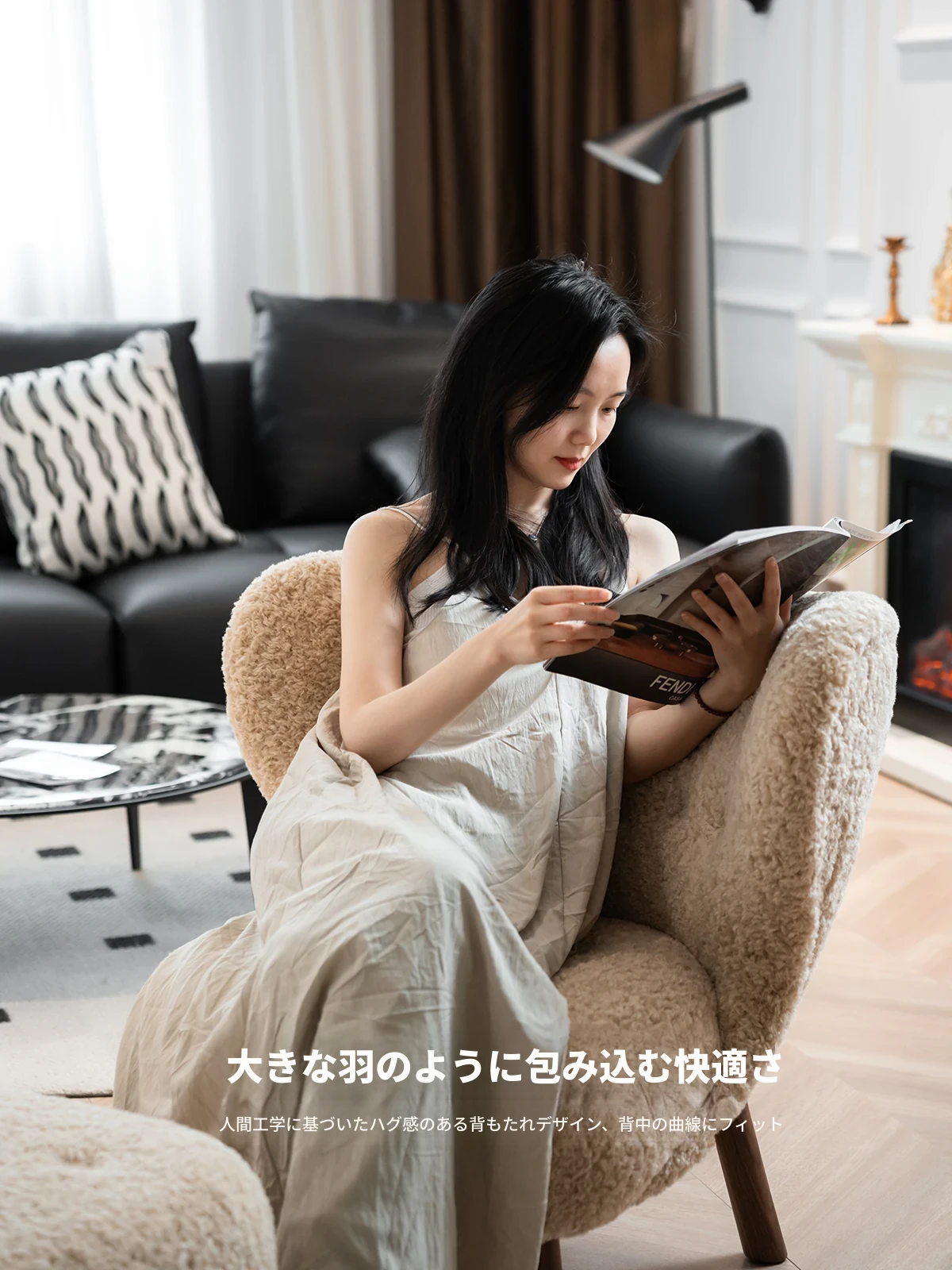 伝統的な侘寂スタイルのシンプルな無垢材とラムウールのデザイナー一人掛けリビングチェア - ウォールナット仕上げで、心地よいくつろぎを提供します。おしゃれで温かみのある空間を演出!