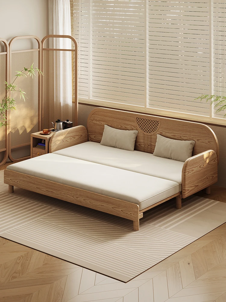 Multi-Functional White Ash Wood Sofa Bed - Pull-Out Storage Double Bed for Living Room & Study, Foldable and Expandable, Perfect for Year-Round Use in Winter & Summer
