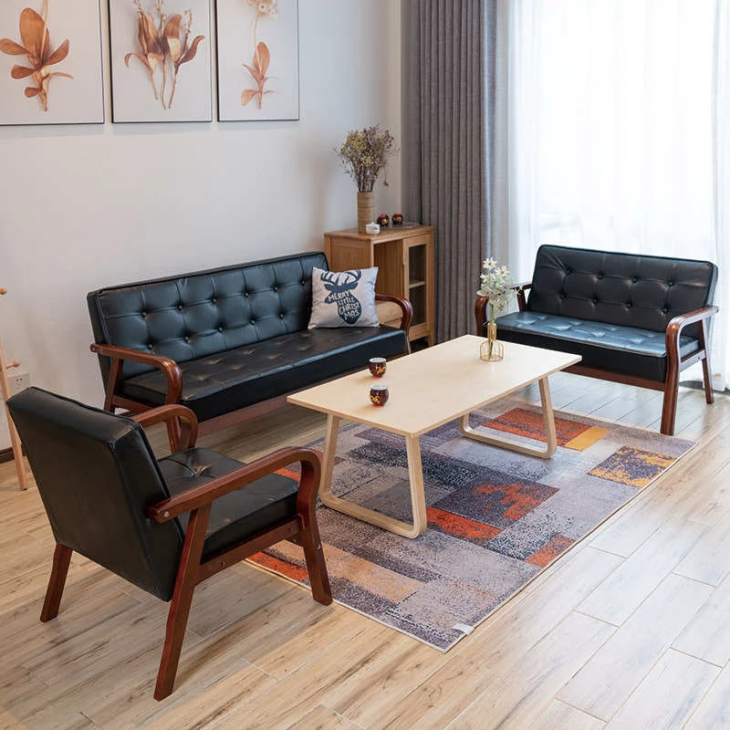 Nordic Retro Leather Sofa for Small Spaces - Curved Wooden Armrest, Available in Single, Double, and Three-Seater Options, Perfect for Stylish Living Rooms and Trendy Interiors