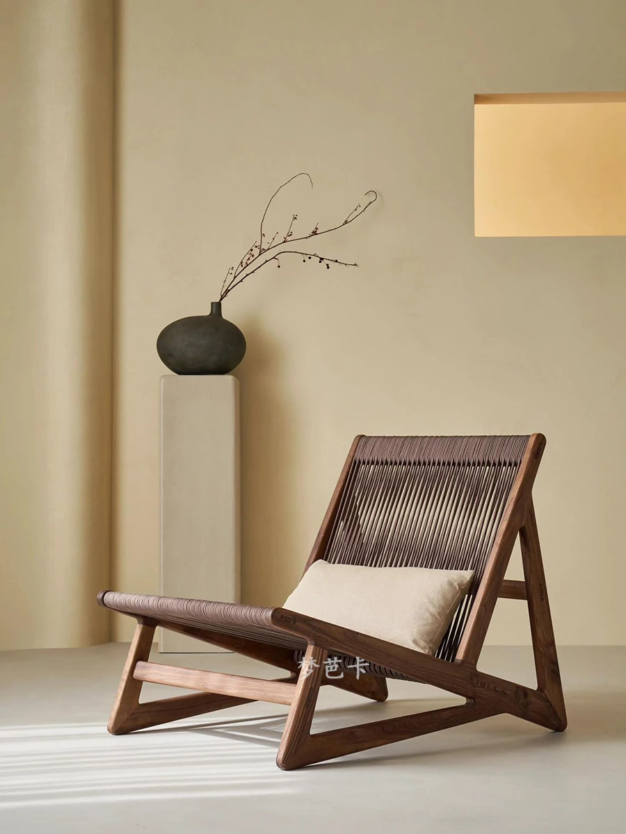 Solid Wood Rope-Woven Single Sofa Chair - Minimalist Leisure Recliner with Backrest, Vintage Chaise Lounge for Guesthouses, Embracing Wabi-Sabi Aesthetics in Relaxation