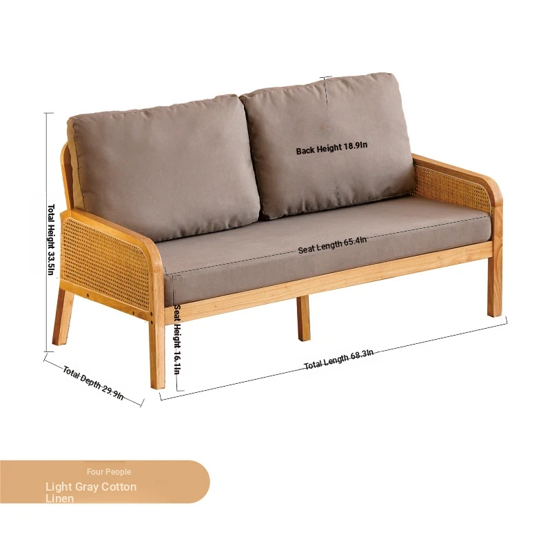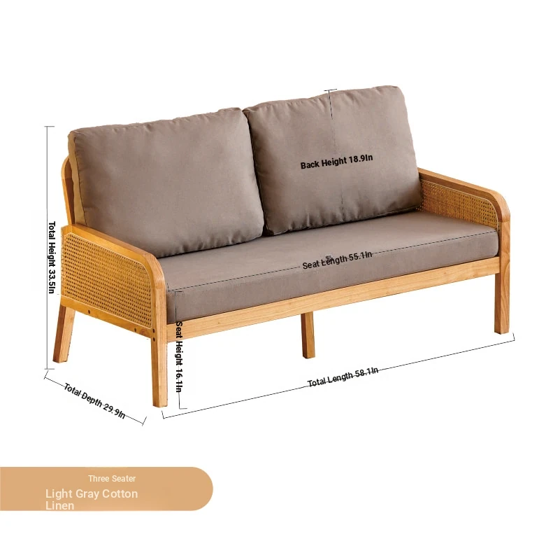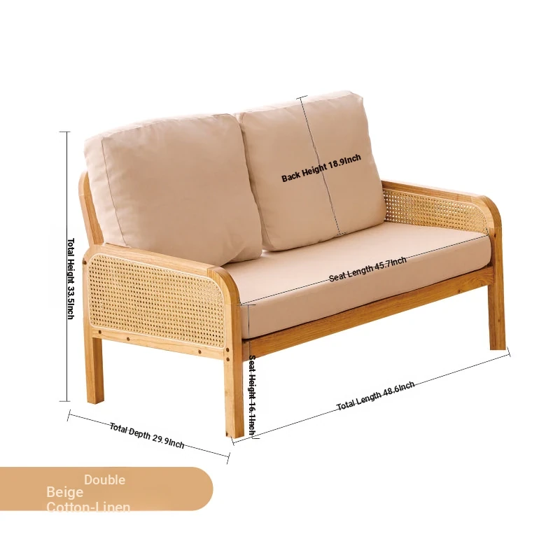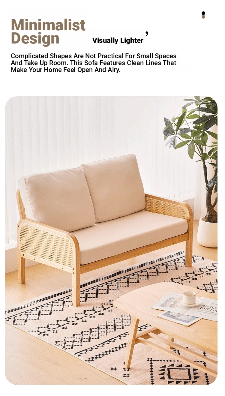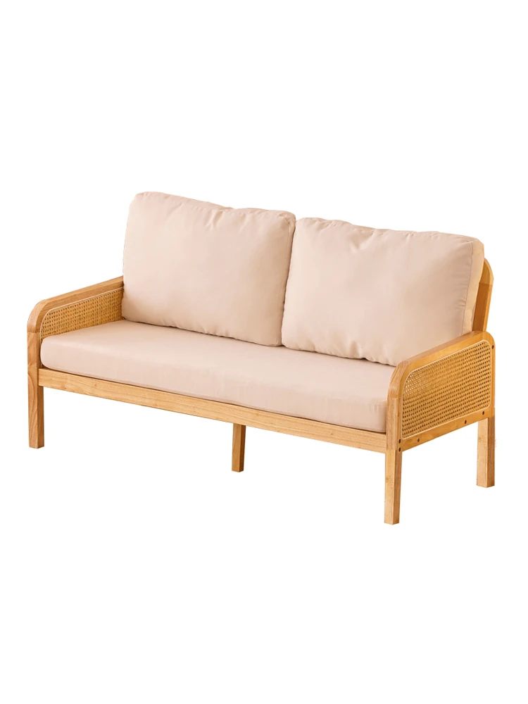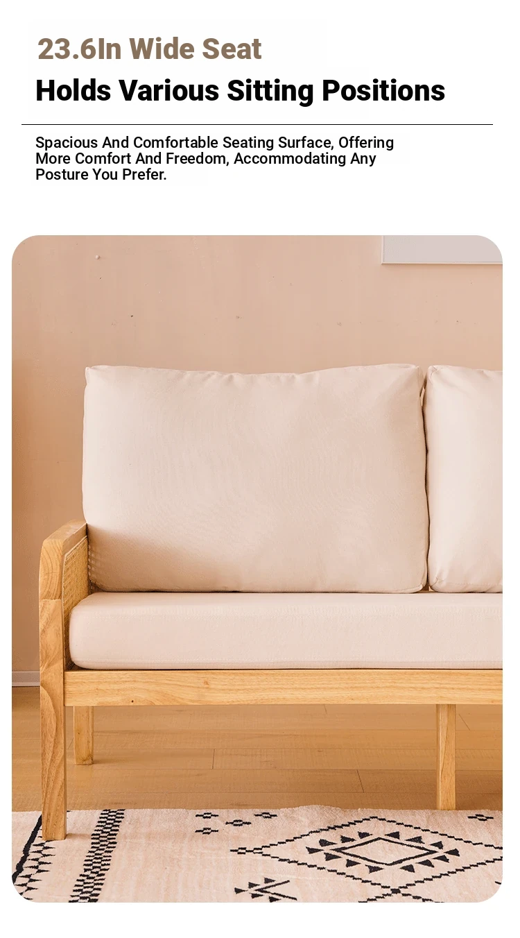 "Versatile Rattan Weave All-Season Solid Wood Sofa - Minimalist Fabric Small Space Design for Cozy Homes, Featuring Natural Wood Aesthetics and Spacious Double Three-Person Layout"