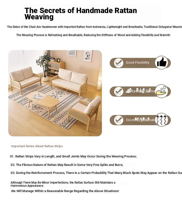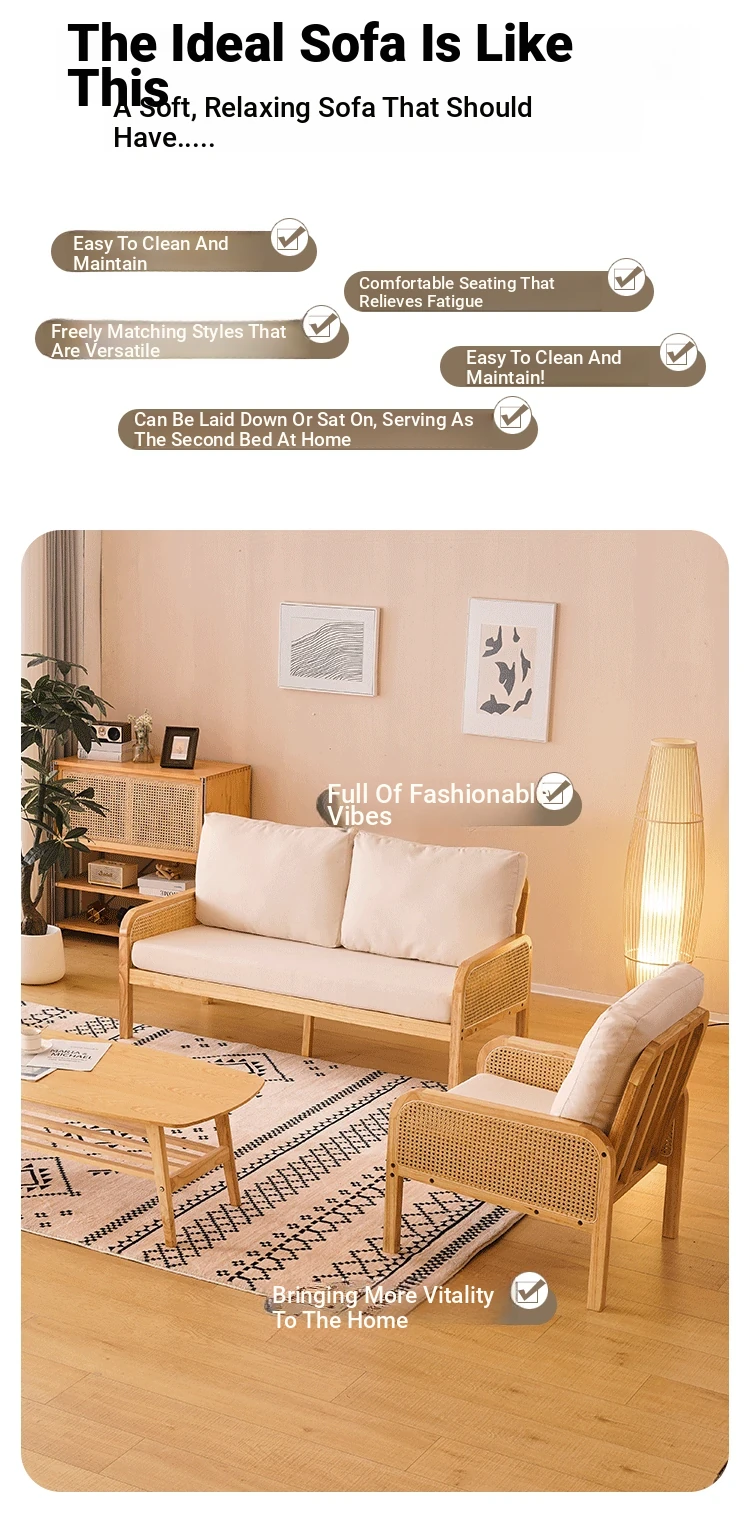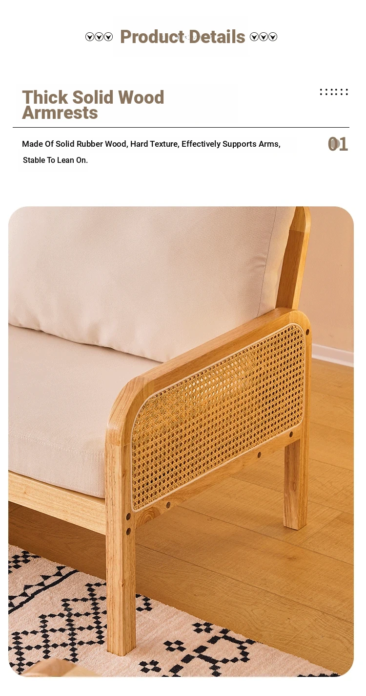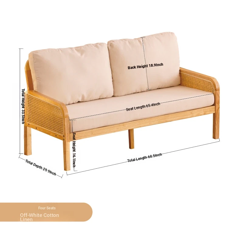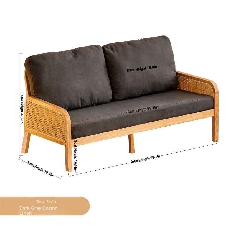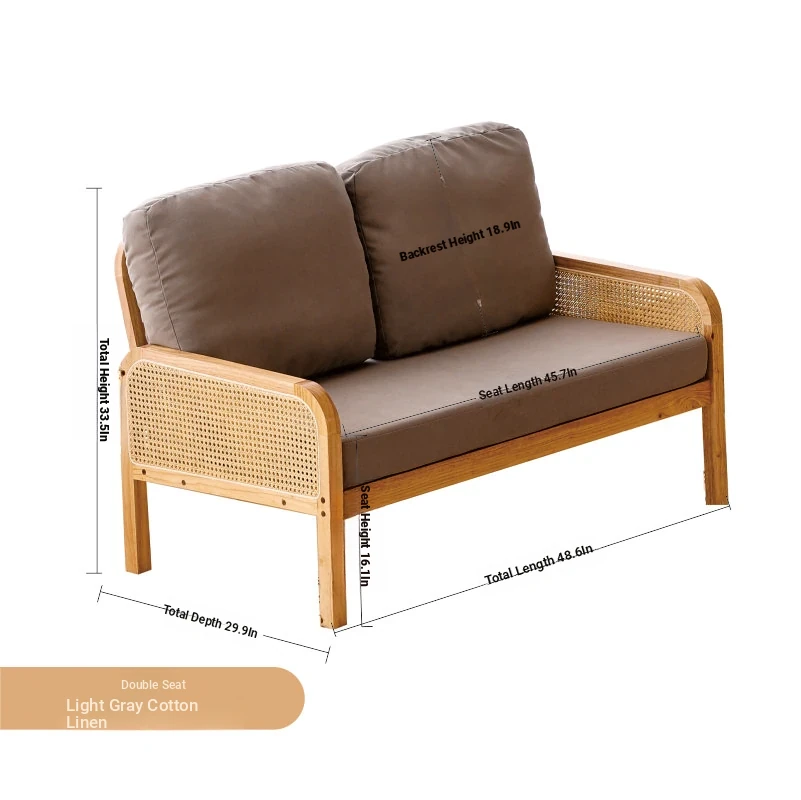 "Versatile Rattan Weave All-Season Solid Wood Sofa - Minimalist Fabric Small Space Design for Cozy Homes, Featuring Natural Wood Aesthetics and Spacious Double Three-Person Layout"