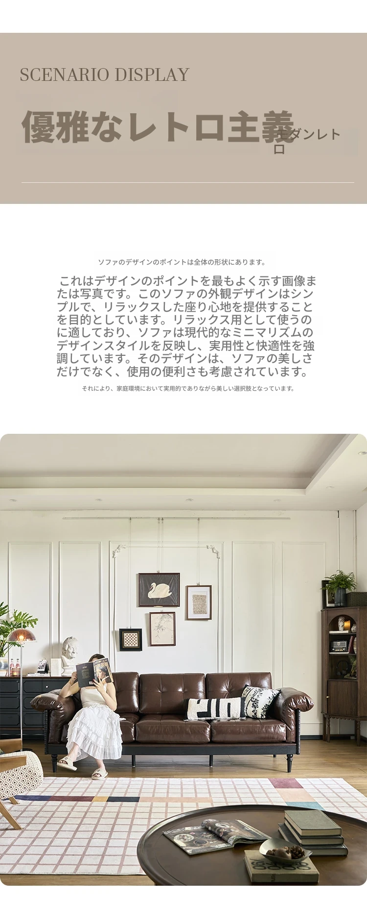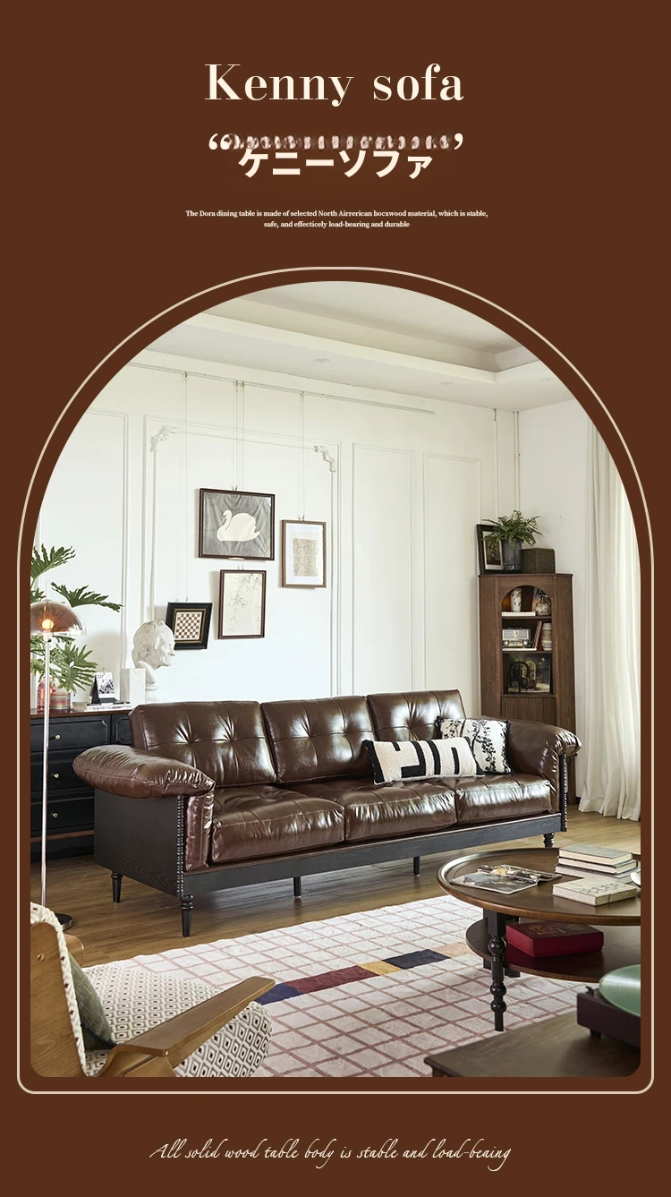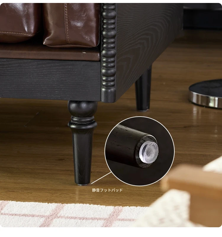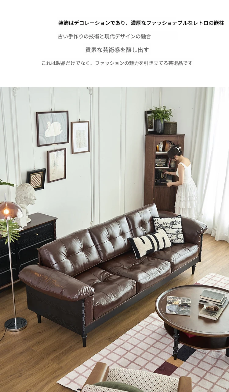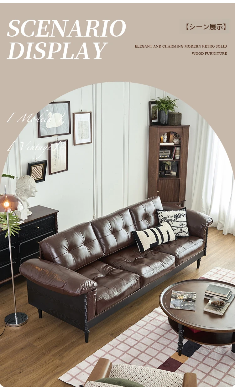 フランス風レトロ無垢材本革ソファ|和風ミニマルデザイン|ブラックで高級感漂う小型住宅向けリビング家具|おしゃれで快適な空間を演出!