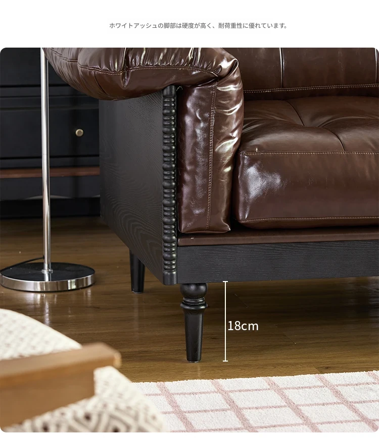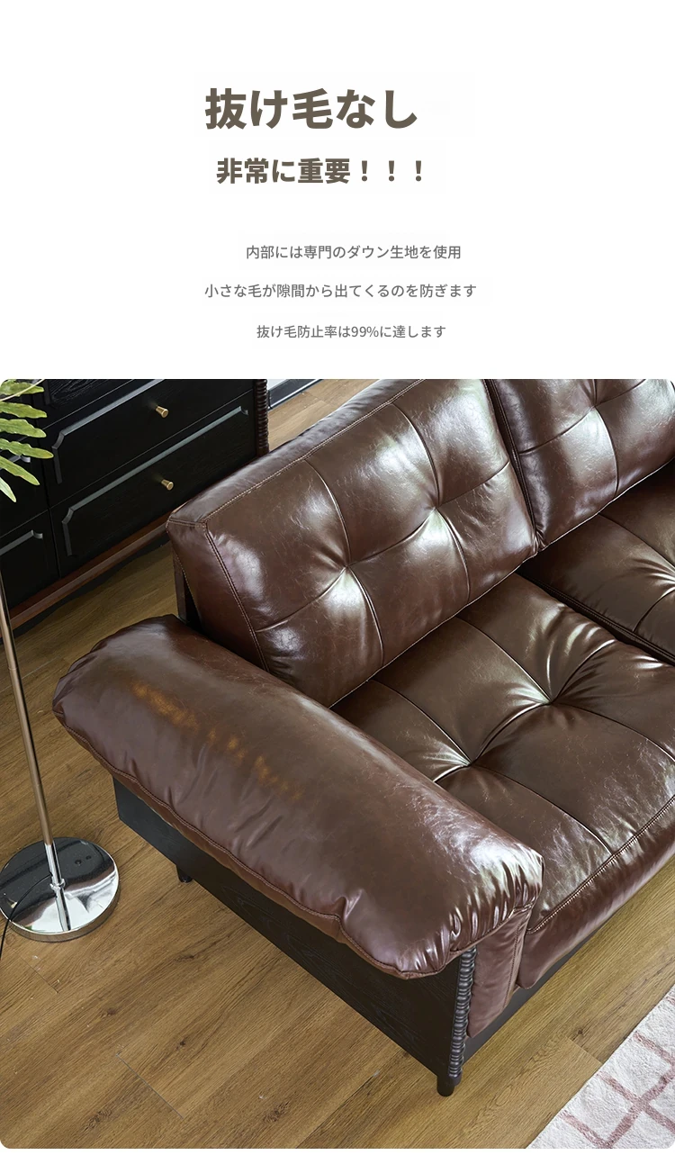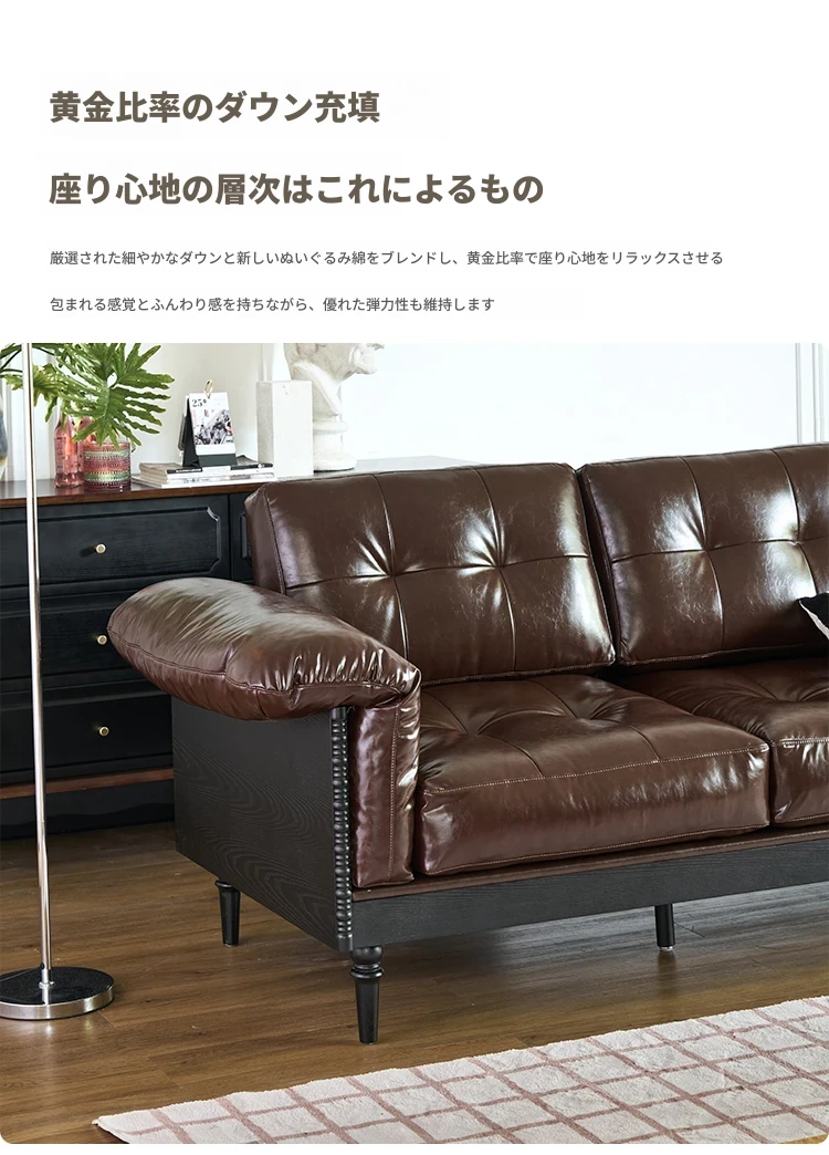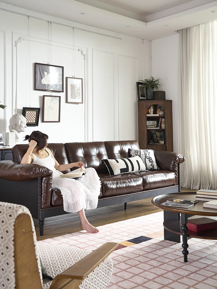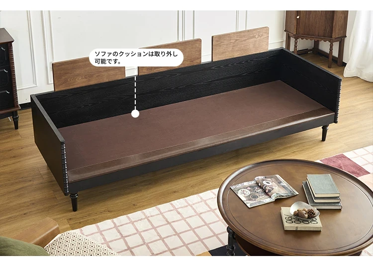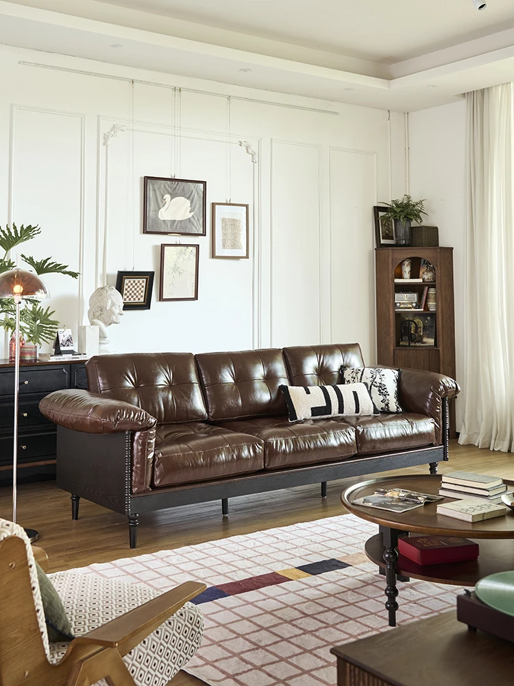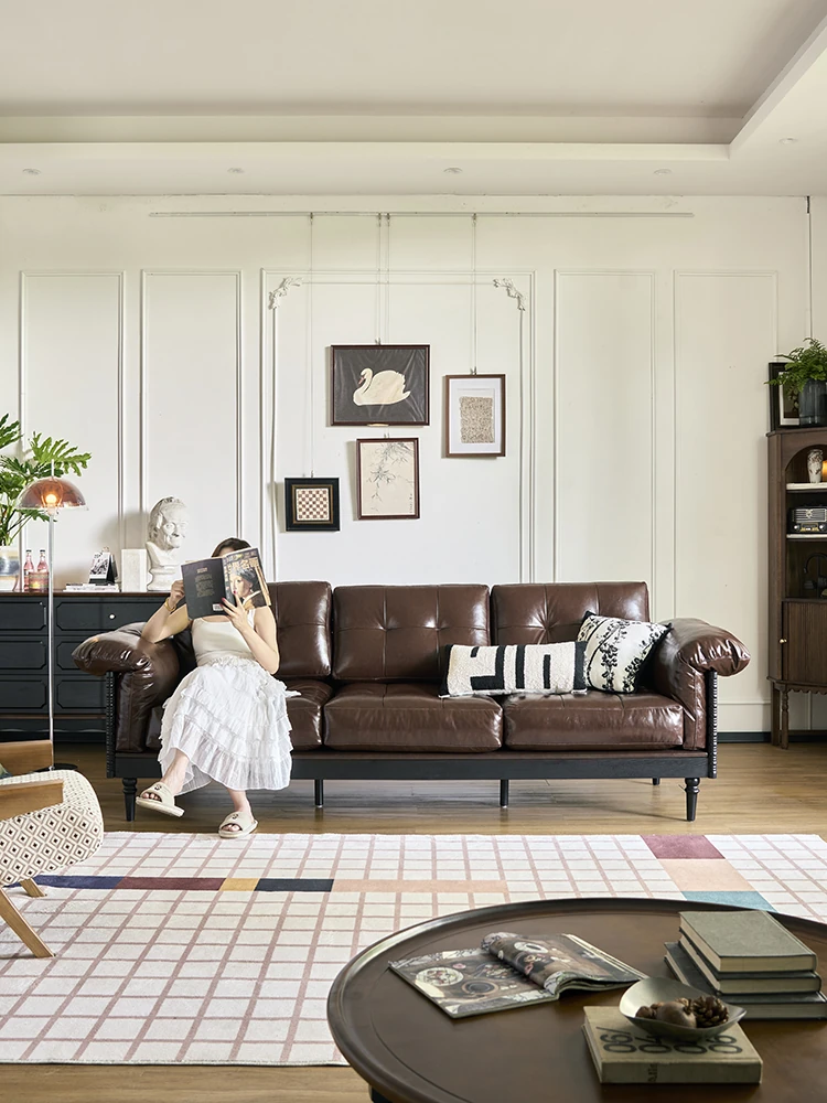フランス風レトロ無垢材本革ソファ|和風ミニマルデザイン|ブラックで高級感漂う小型住宅向けリビング家具|おしゃれで快適な空間を演出!