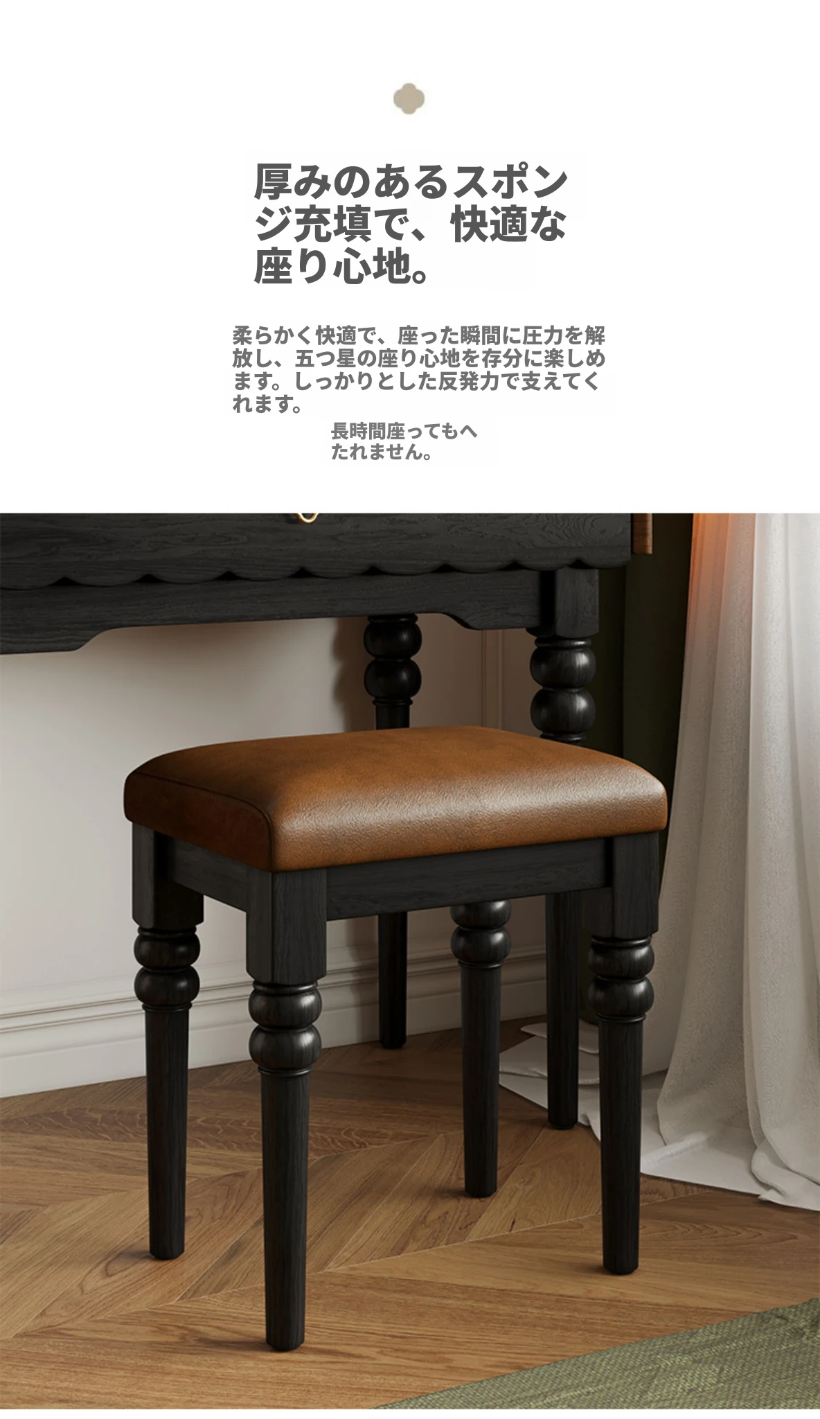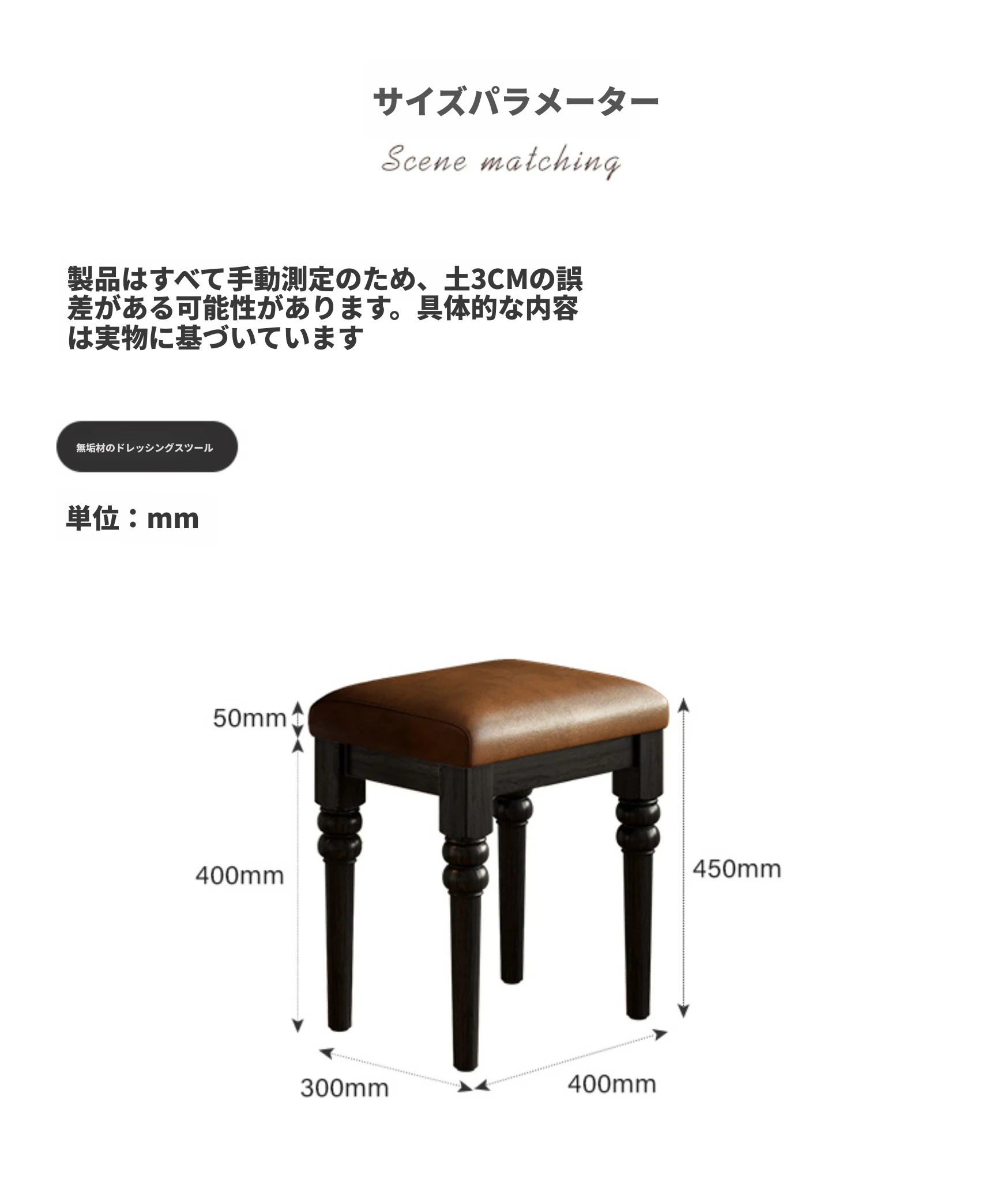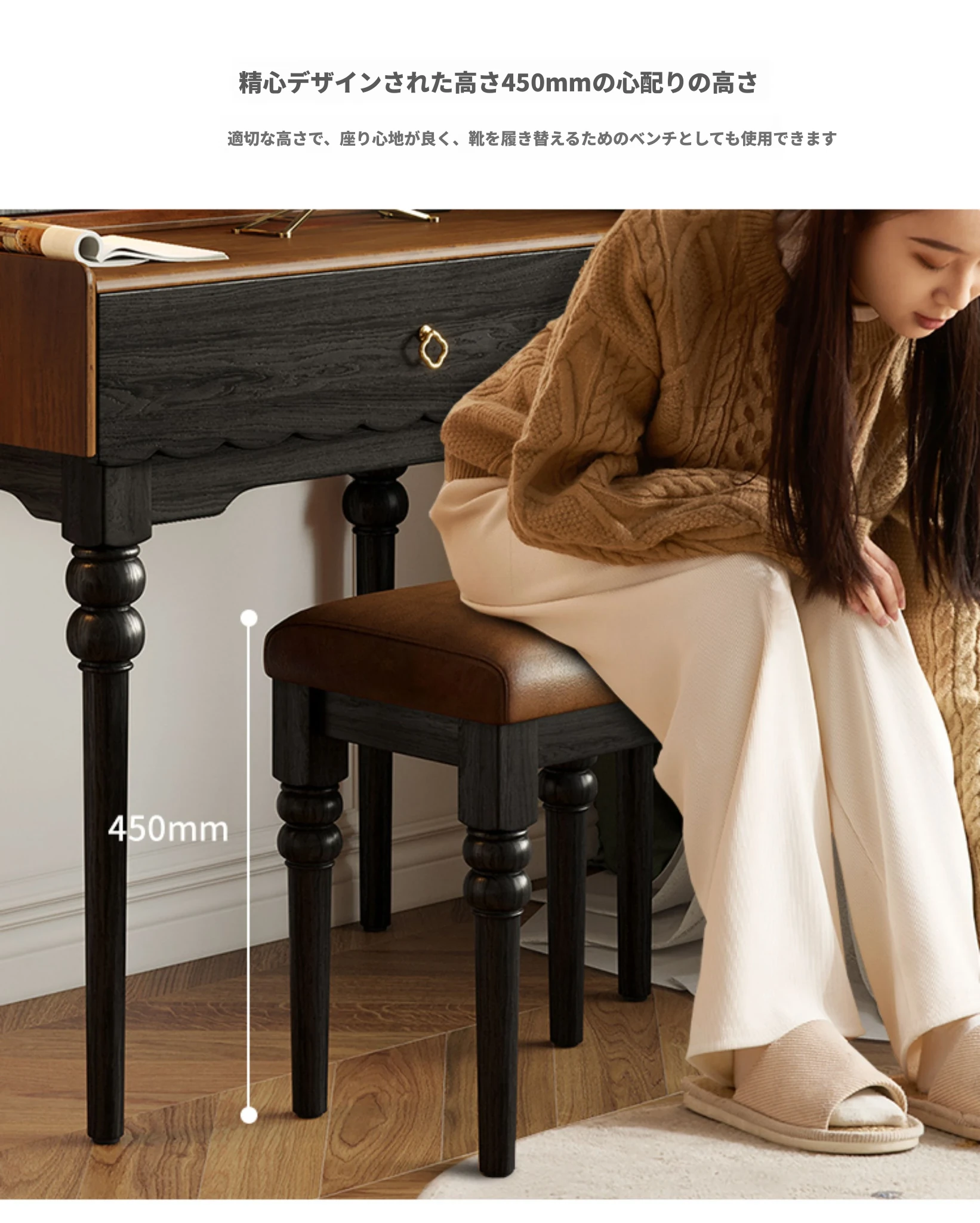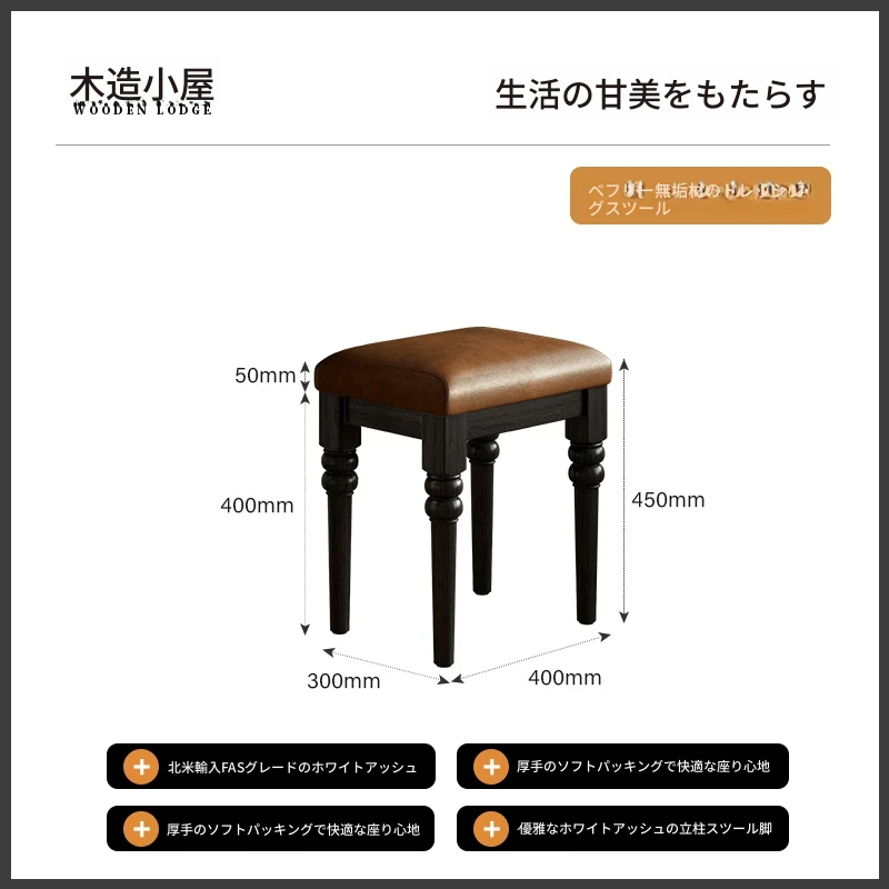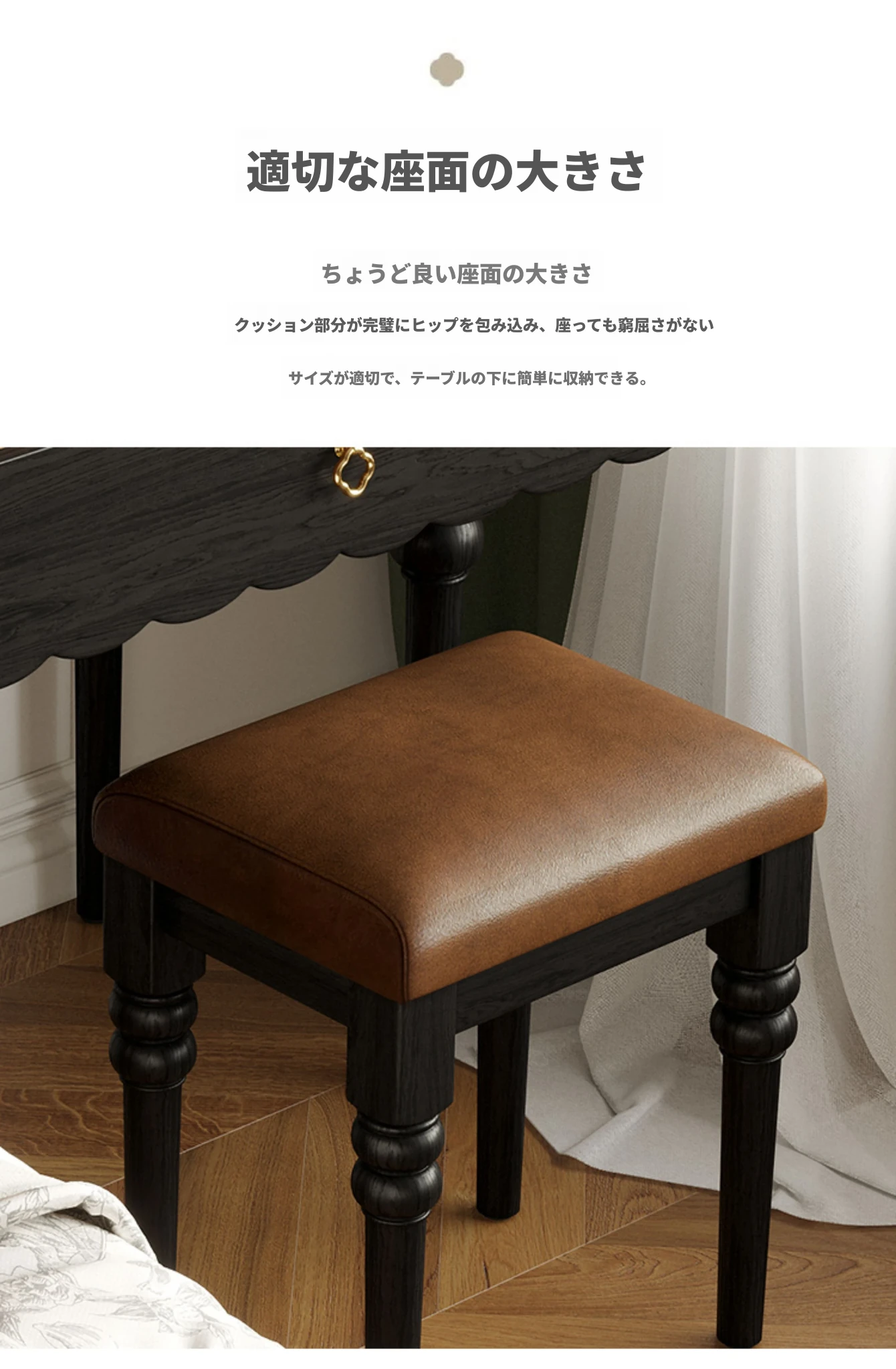 フレンチレトロ風の木製小屋スタイル!実木製の化粧台用スツール、コンパクトな寝室や小さいお部屋にもぴったり。おしゃれな化粧台に最適な、上品なデザインのスツールです。ピアノ用としてもおすすめ!