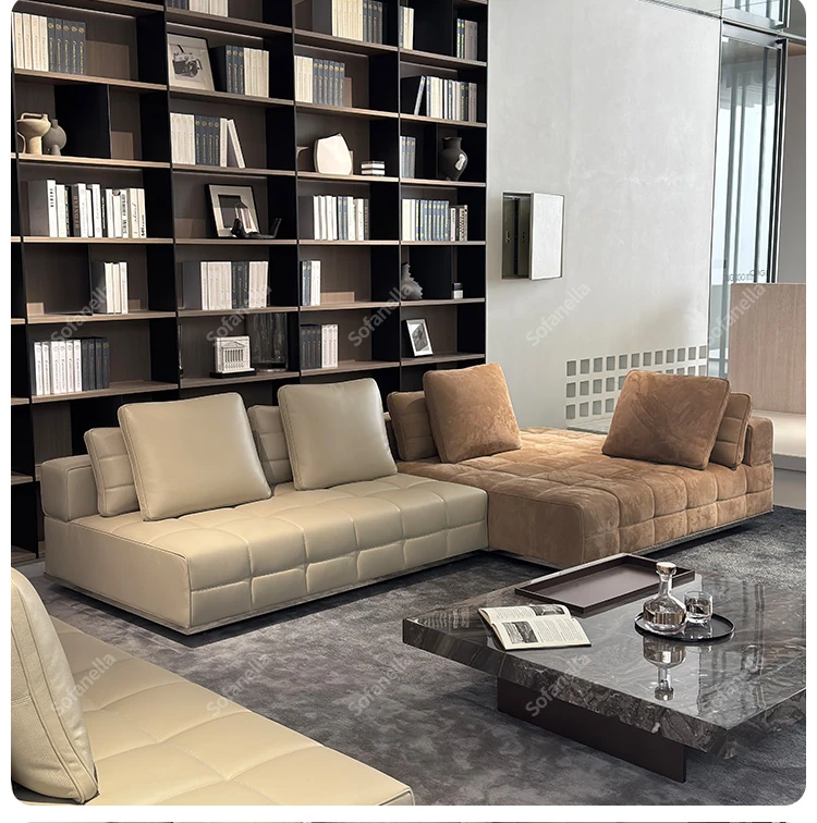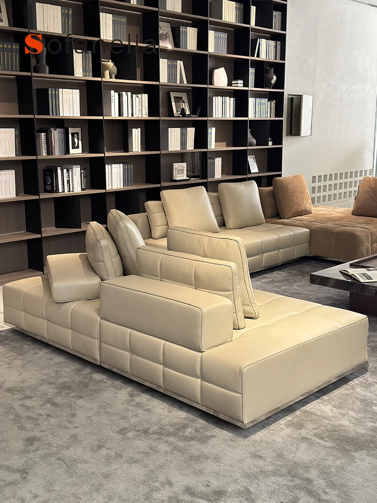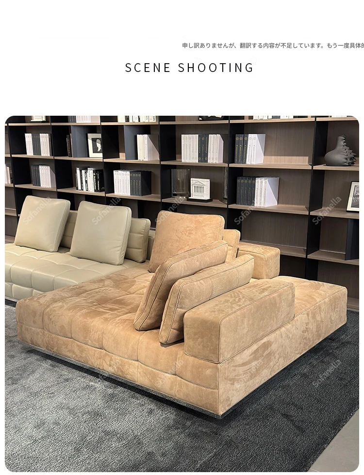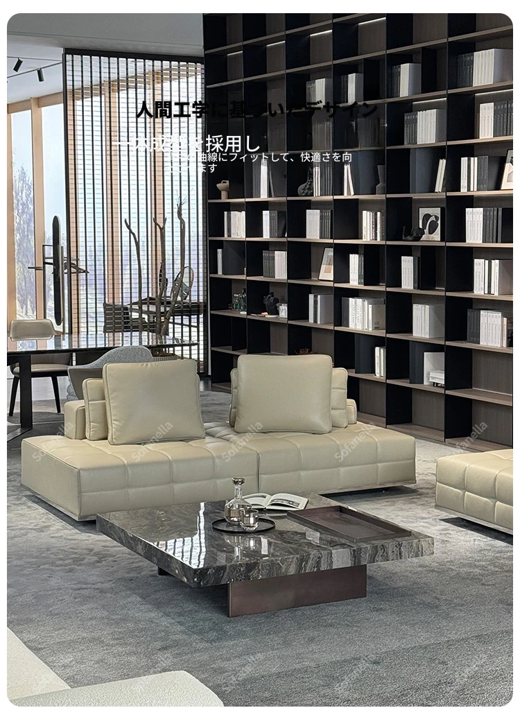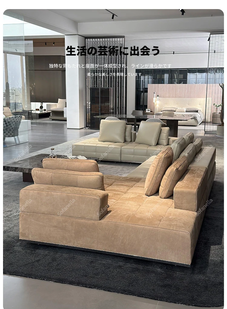 イタリアンミニマルデザインの本革ソファ|広々としたリビングにぴったり!高級感あふれるデザイナーヴィラ向けコットンリネンモジュールソファコンビネーション