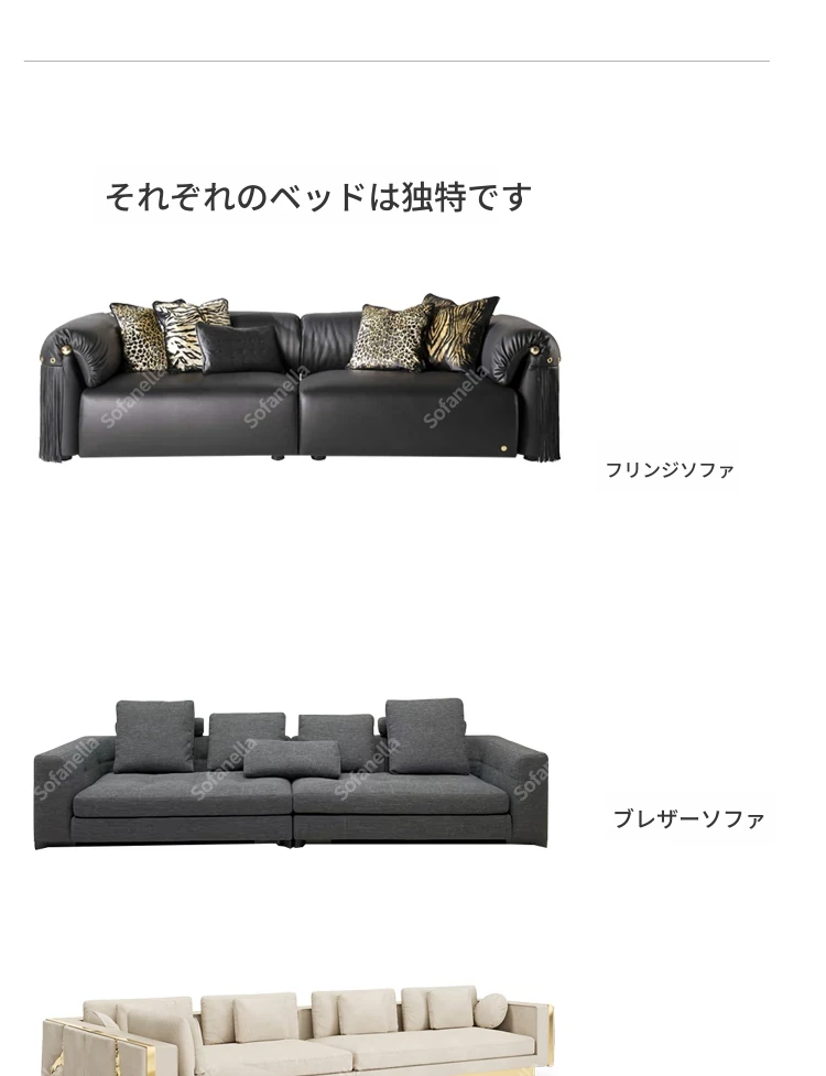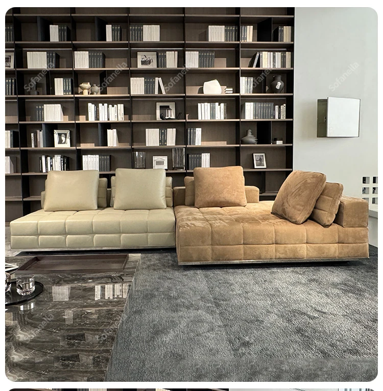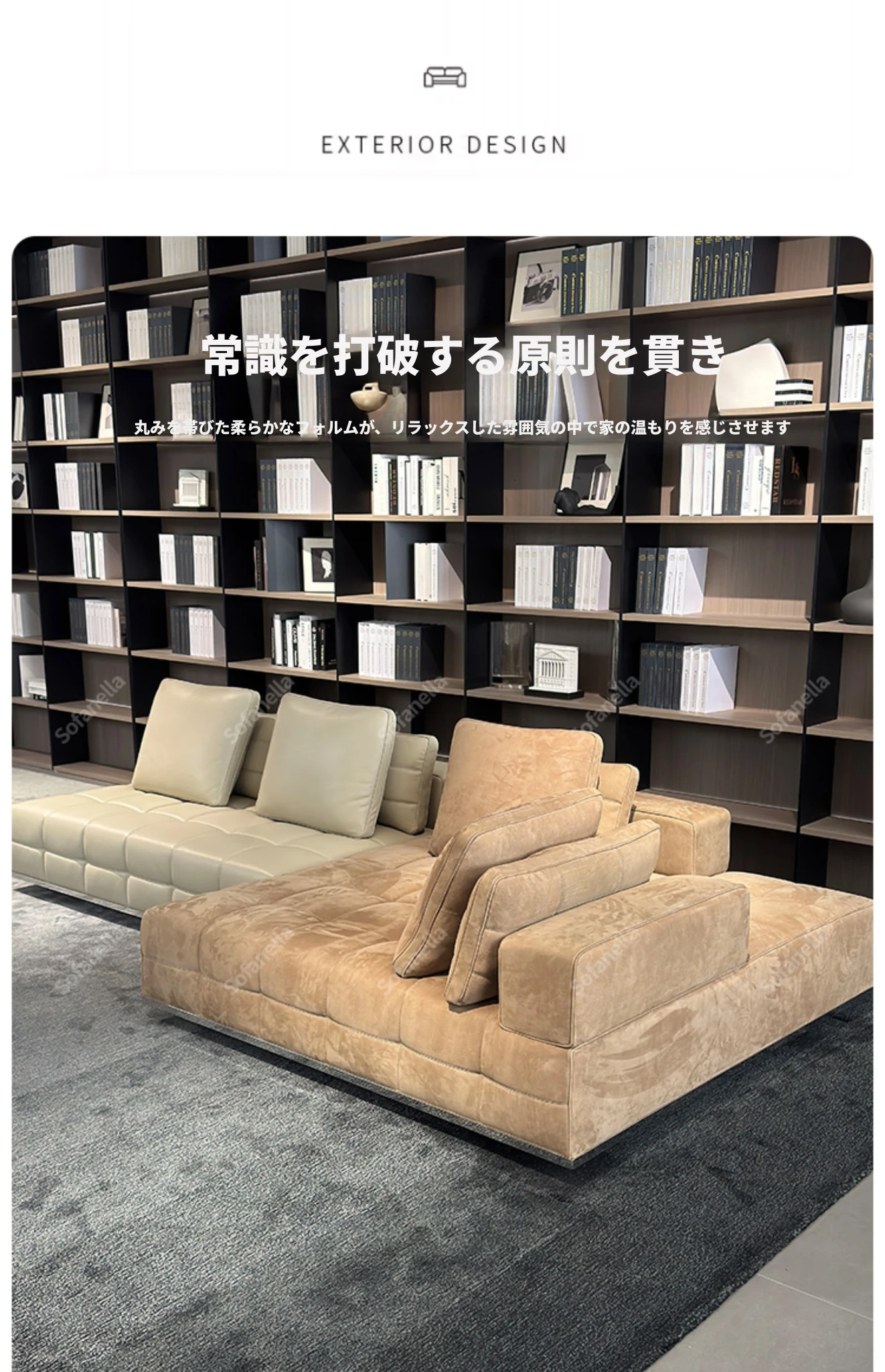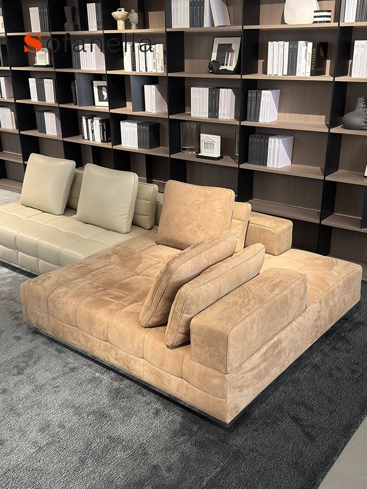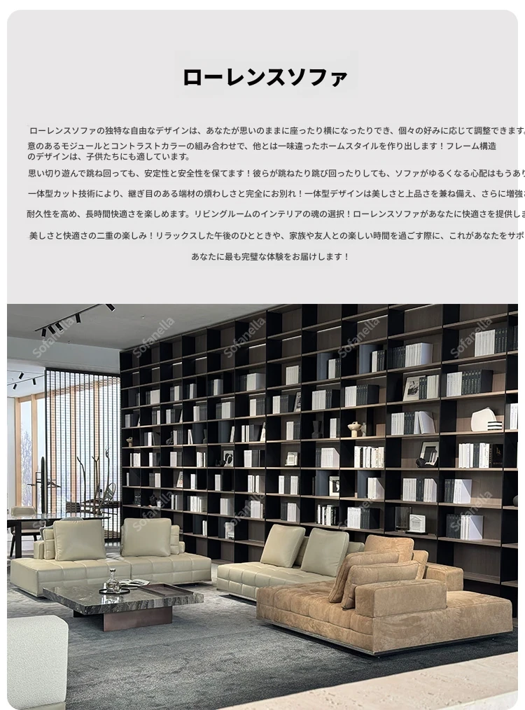 イタリアンミニマルデザインの本革ソファ|広々としたリビングにぴったり!高級感あふれるデザイナーヴィラ向けコットンリネンモジュールソファコンビネーション
