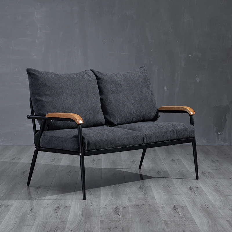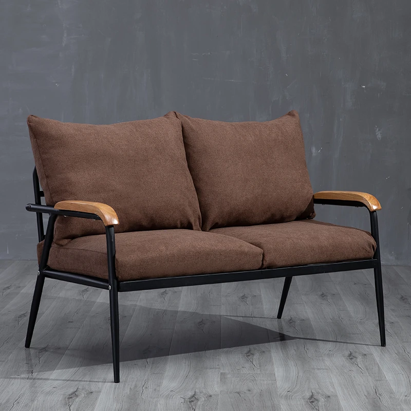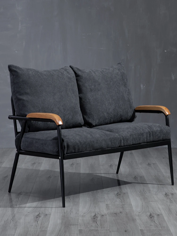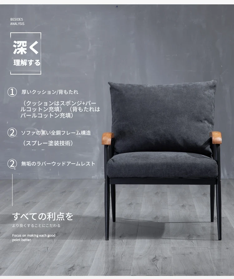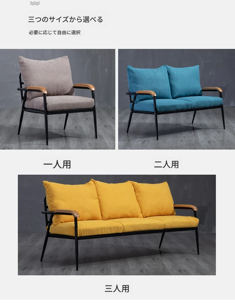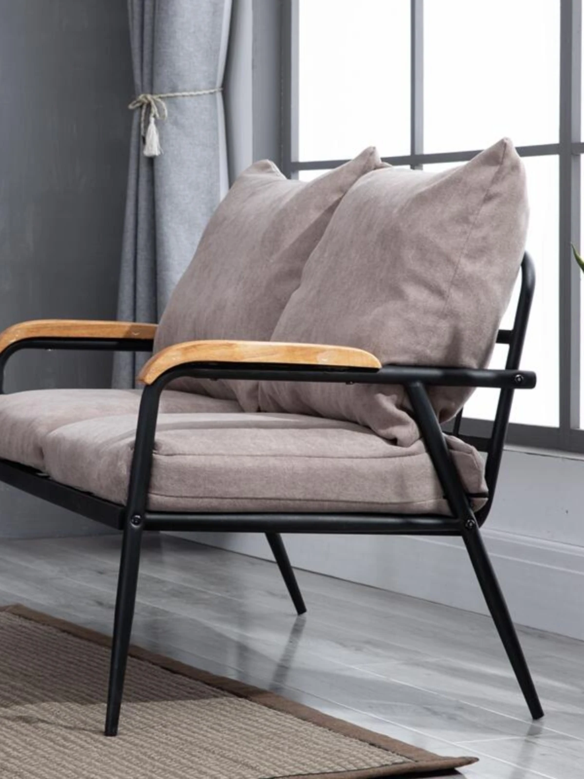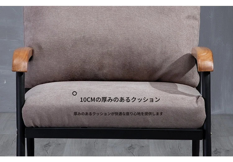 モダンシンプルな日本風ファブリックソファチェア - 小さなリビングやバルコニーに最適!天然木製とアイアンのコンビネーションで、スタイリッシュなインテリアを演出。リラックスしたひとときをお楽しみください。