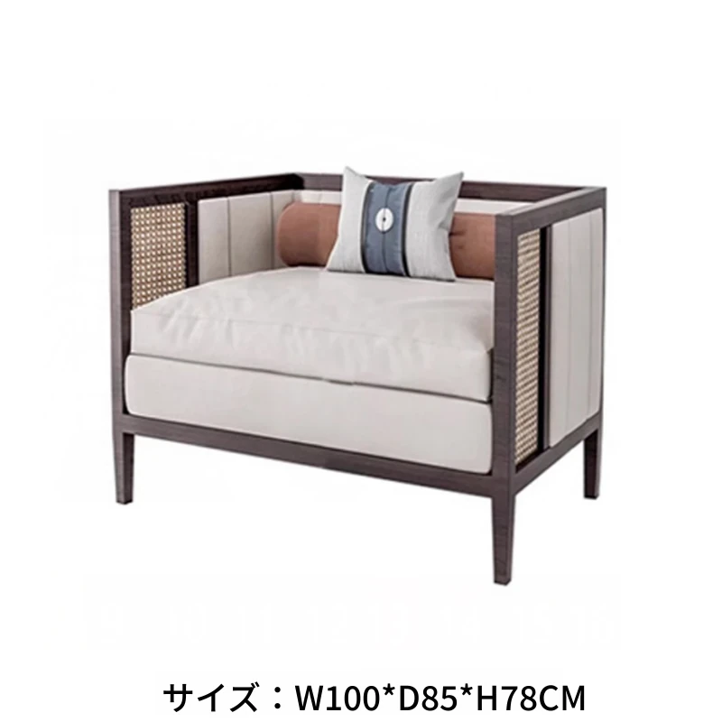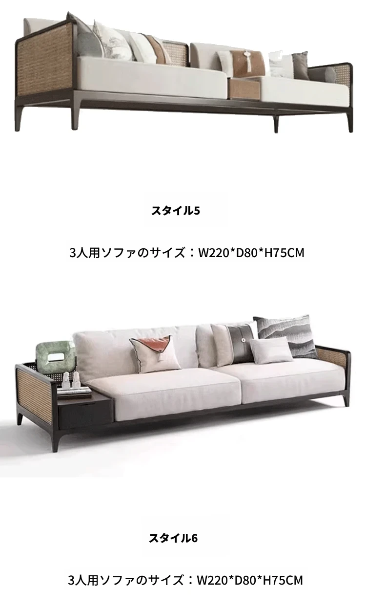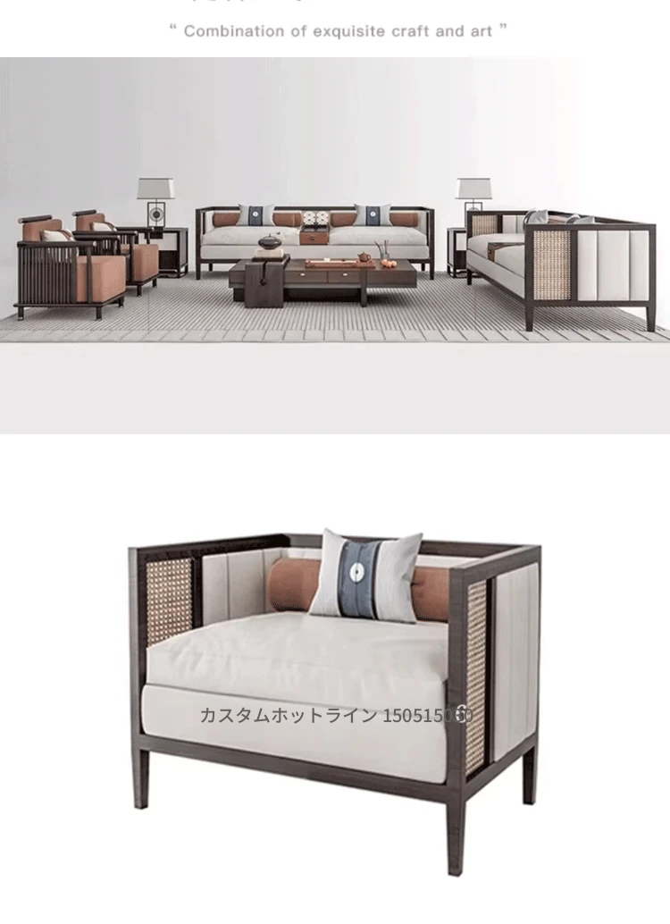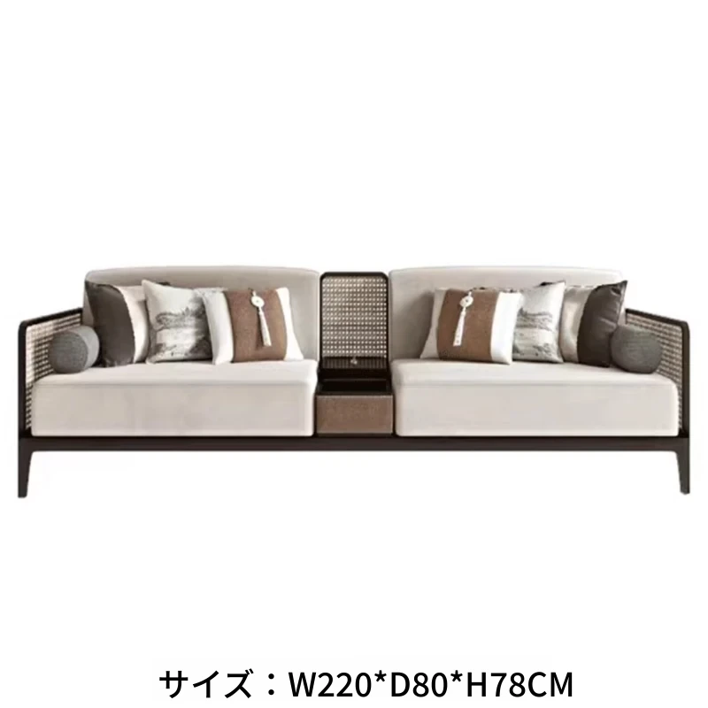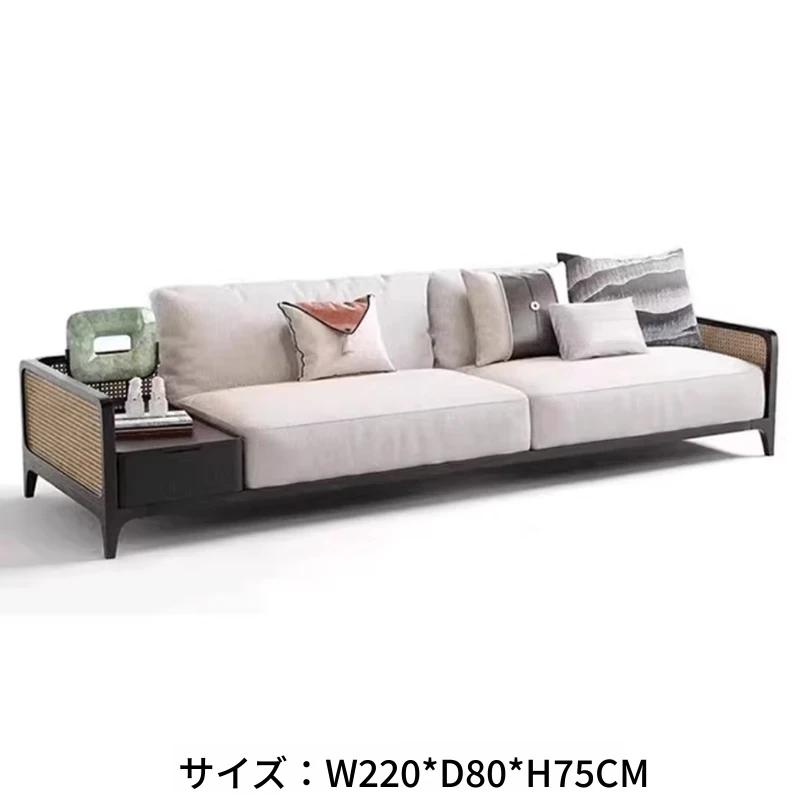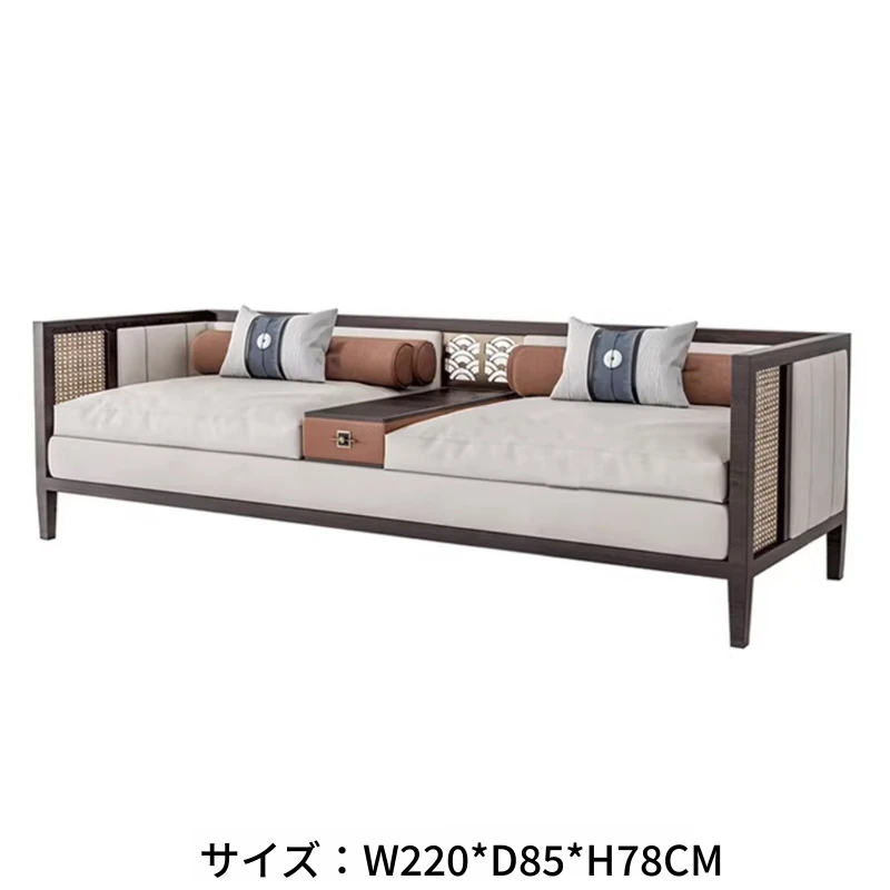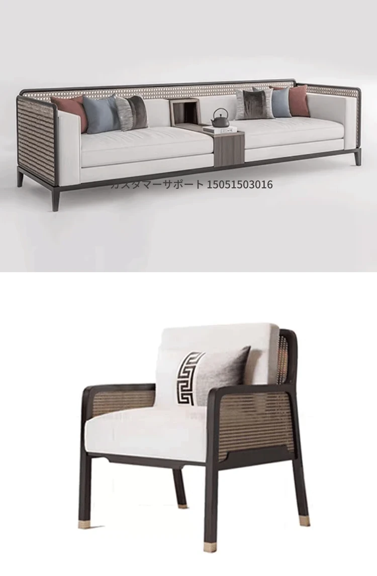 新中式スタイルの無垢材とラタン編みの3人掛けソファ - モダンな客室やホテルロビーにぴったりの北欧風リラックス接客ブース。洗練されたデザインで、居心地の良い空間を演出します!
