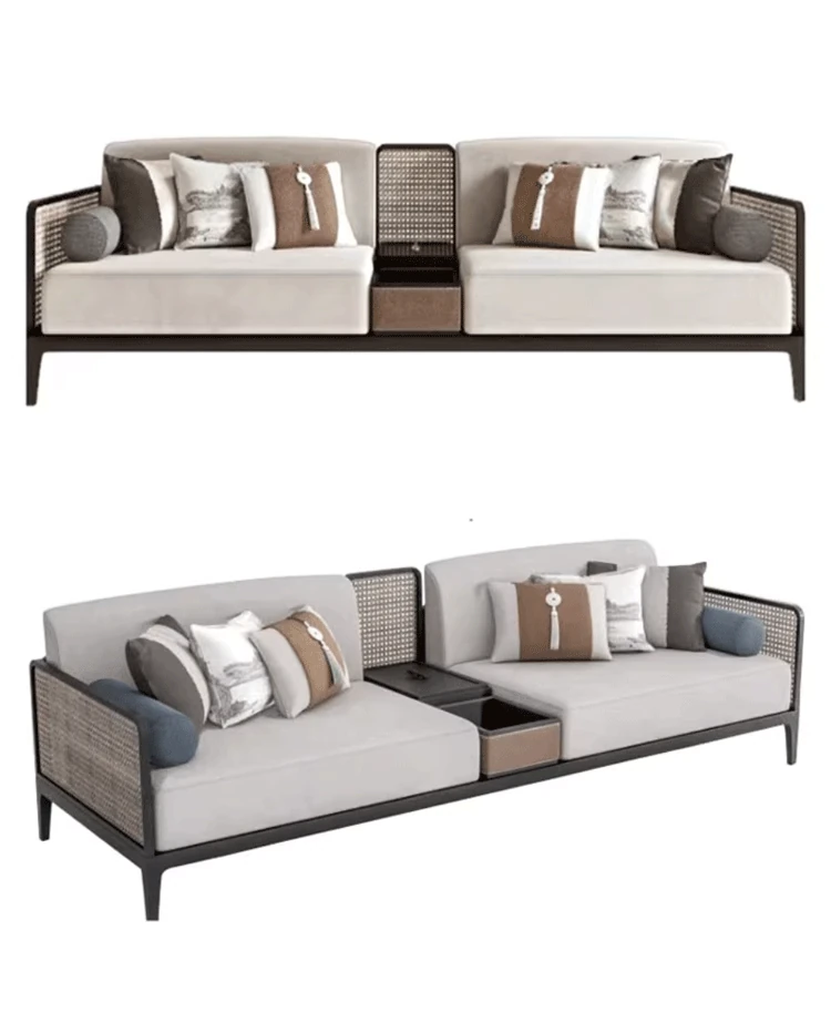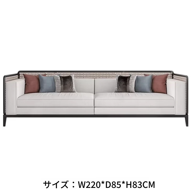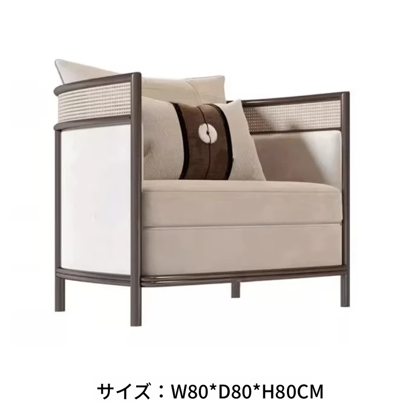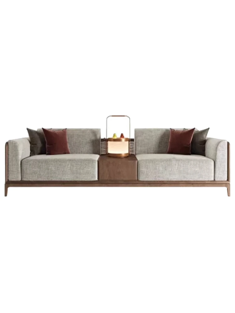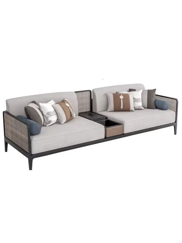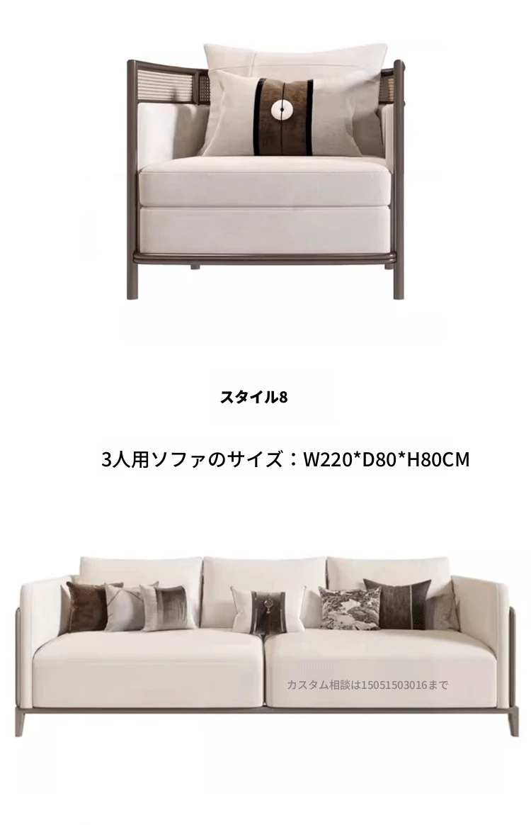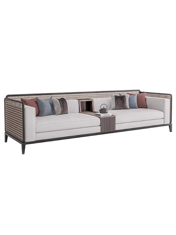 新中式スタイルの無垢材とラタン編みの3人掛けソファ - モダンな客室やホテルロビーにぴったりの北欧風リラックス接客ブース。洗練されたデザインで、居心地の良い空間を演出します!