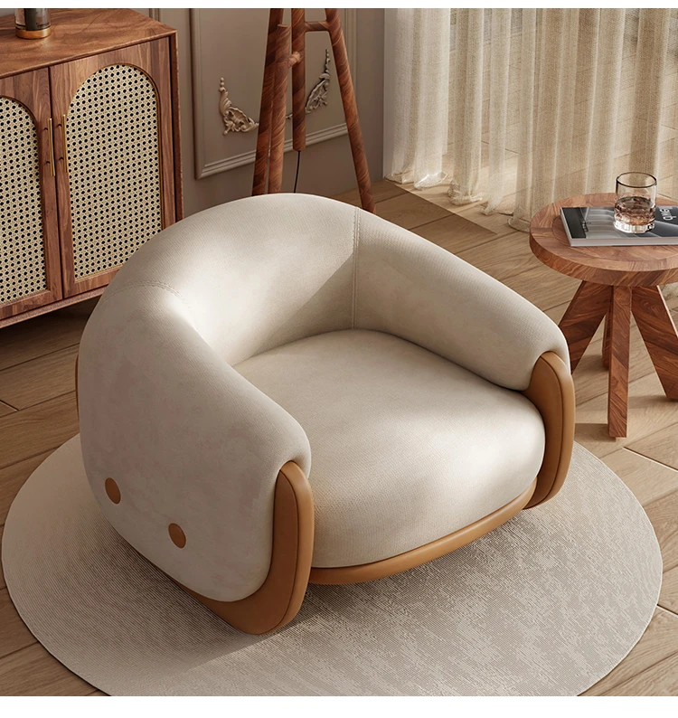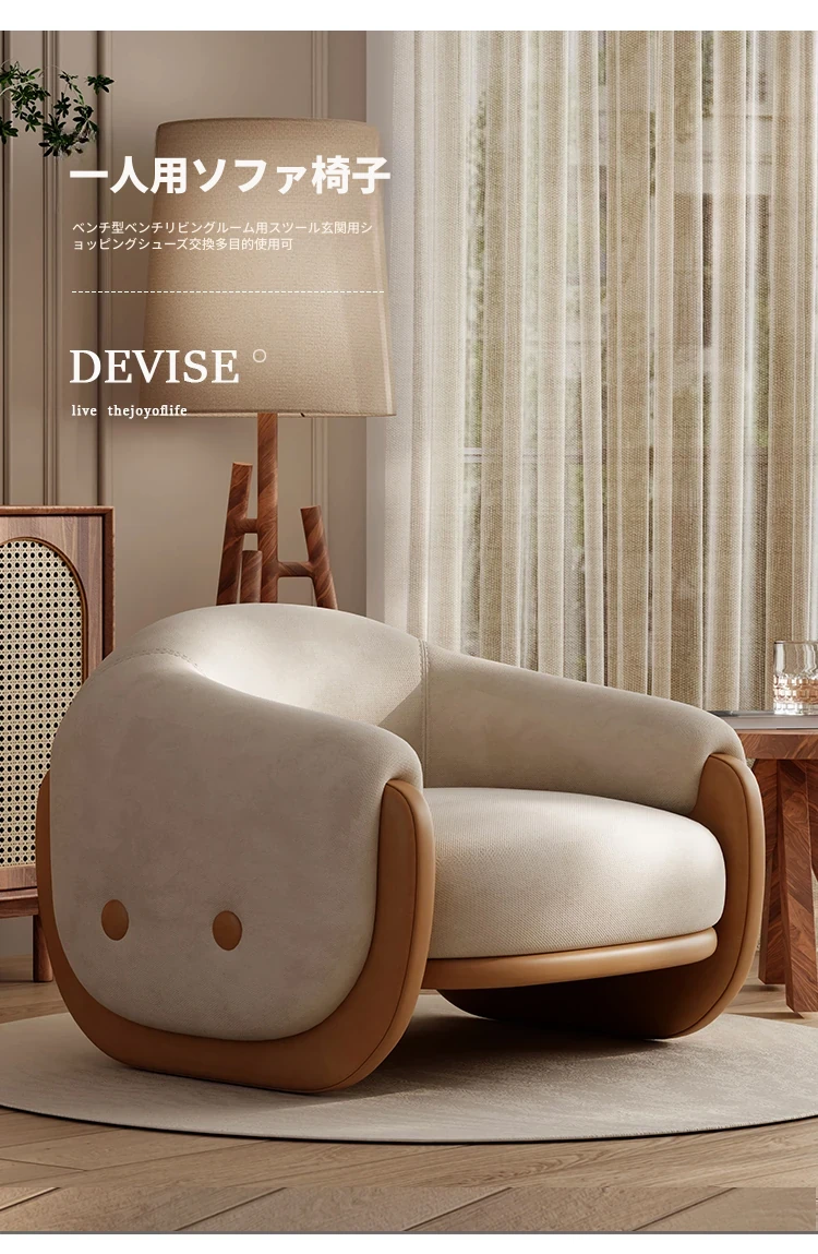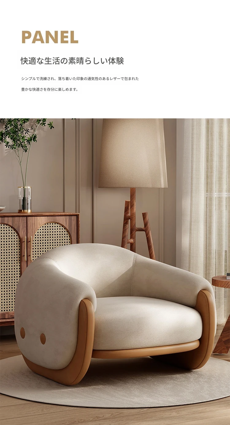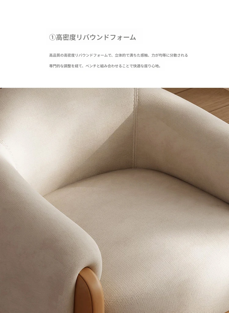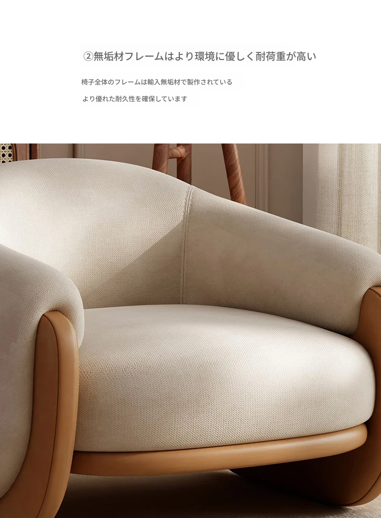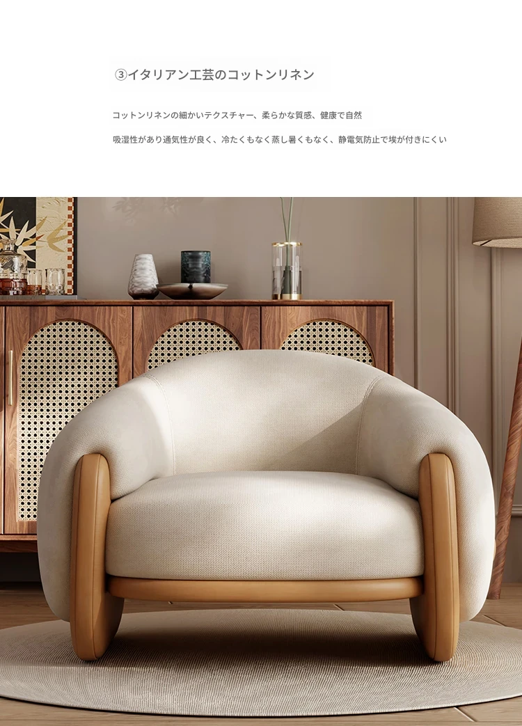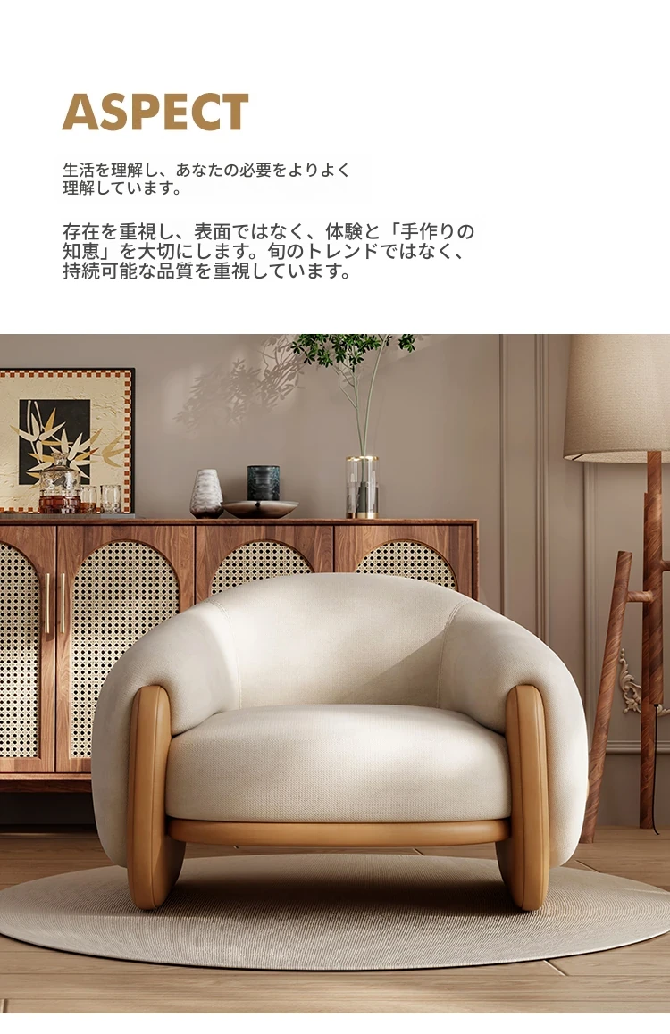 クリーミーな風合いの北欧スタイル一人掛けソファチェア。リビングやバルコニーにぴったりのリラックスチェア!小さなスペースにも最適な布製の快適な寝椅子で、心地よいひとときをお楽しみください。