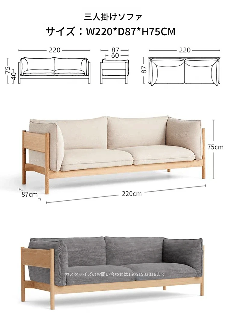 3人用ソファ(ナチュラルウッド+クリーム布)