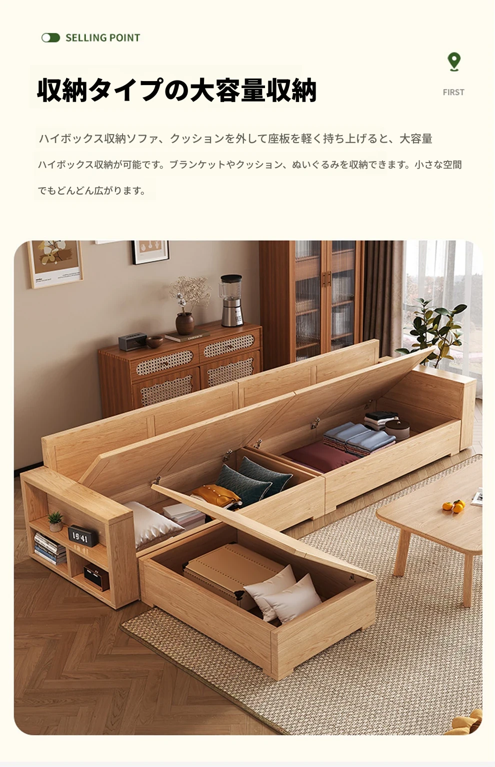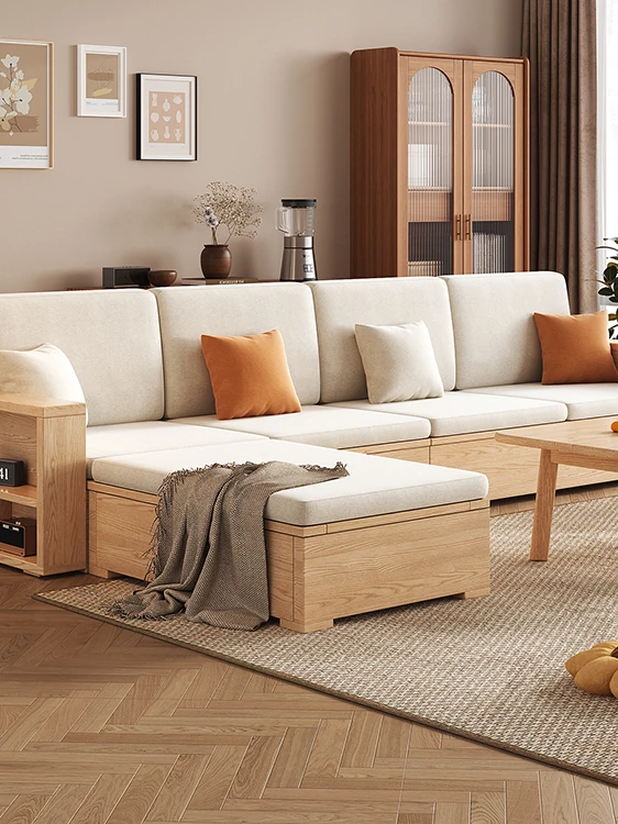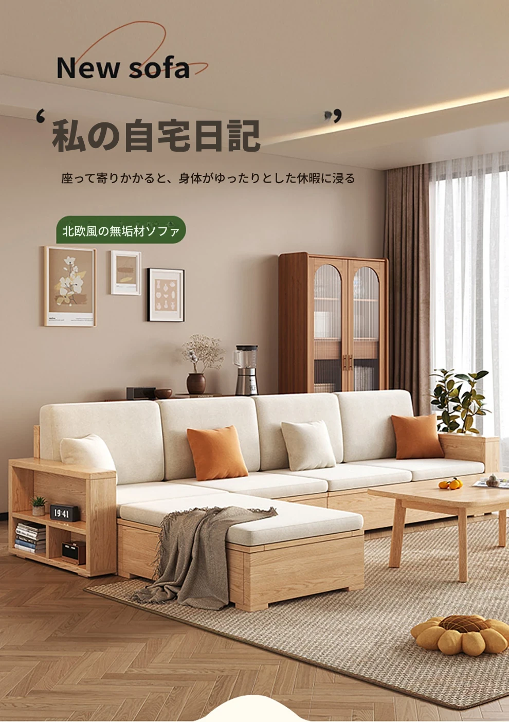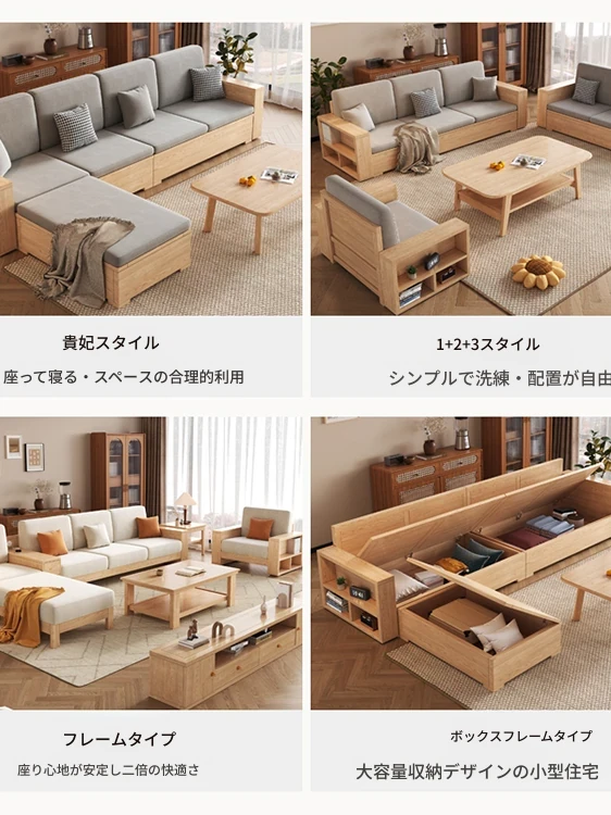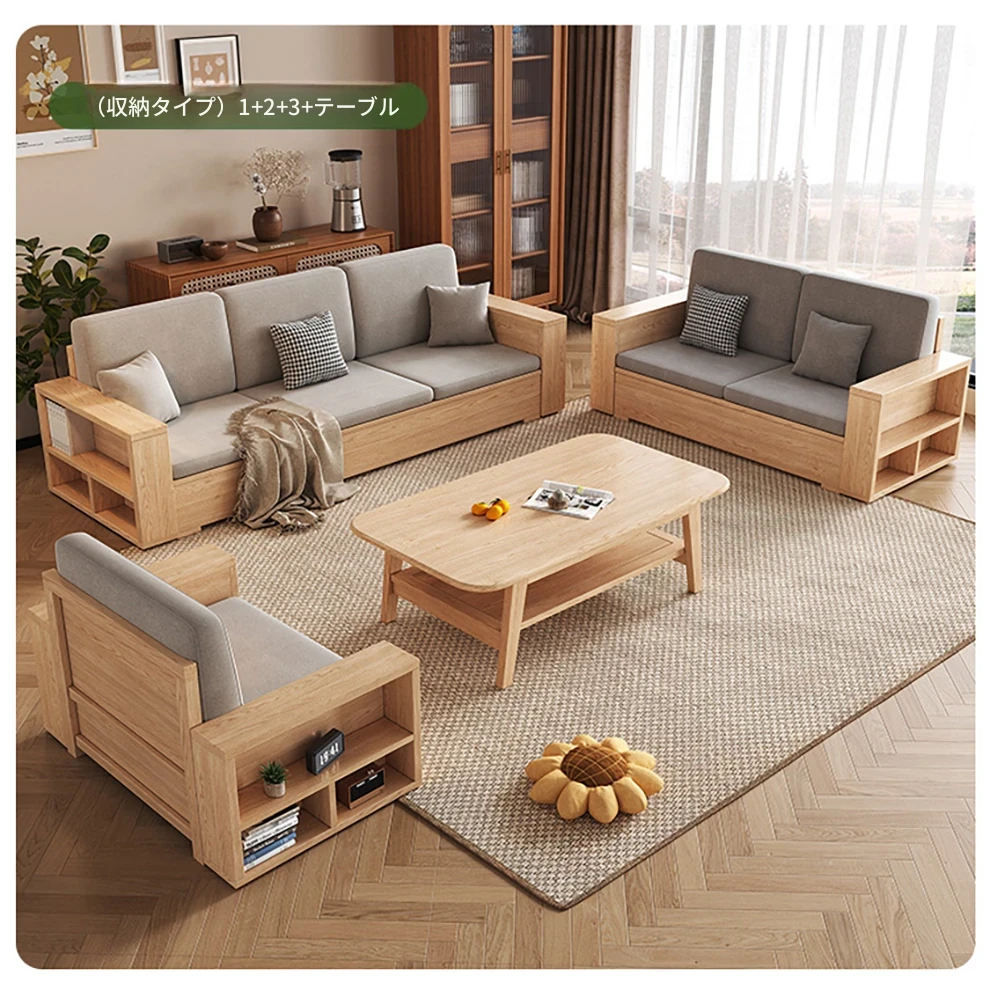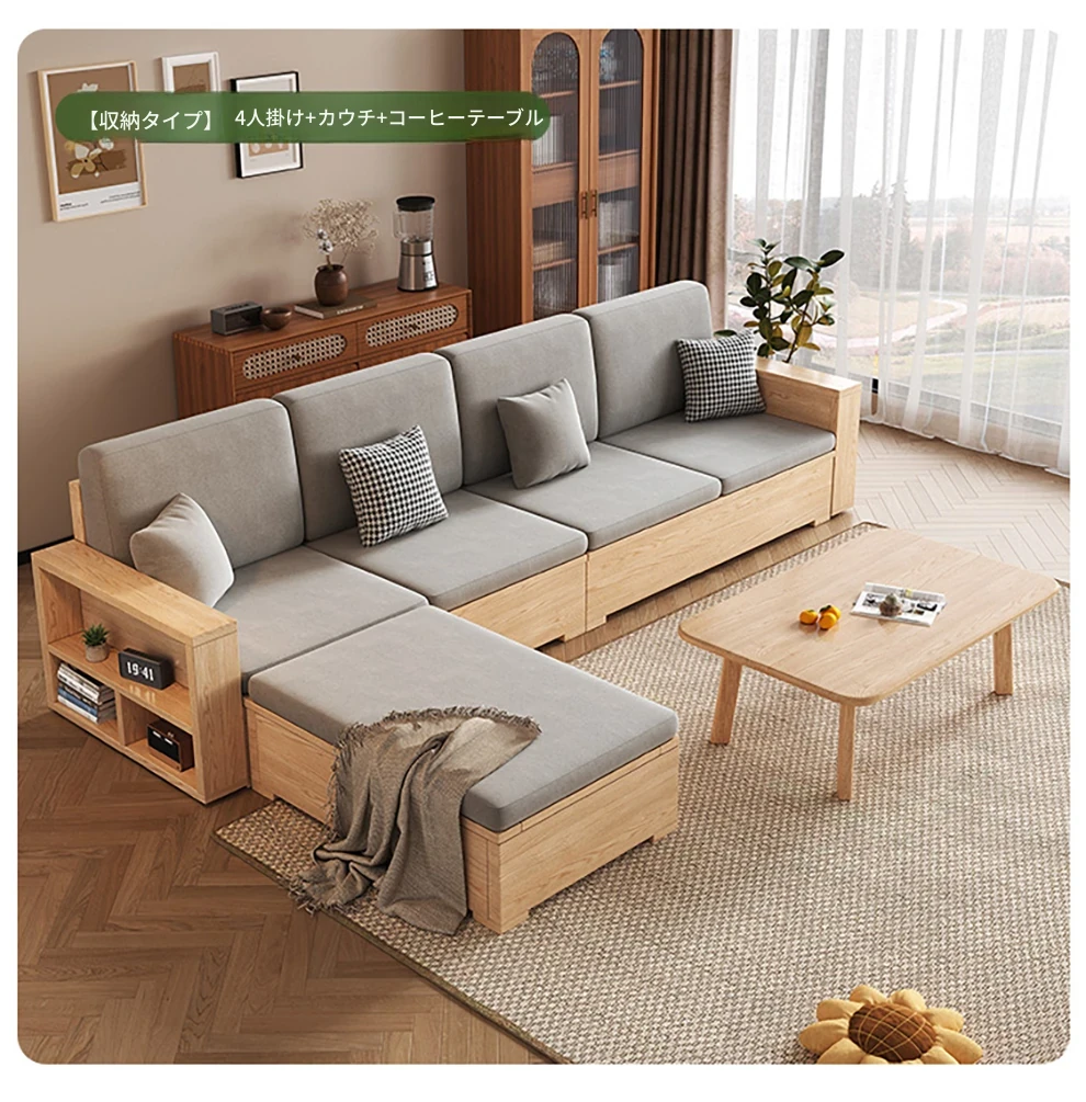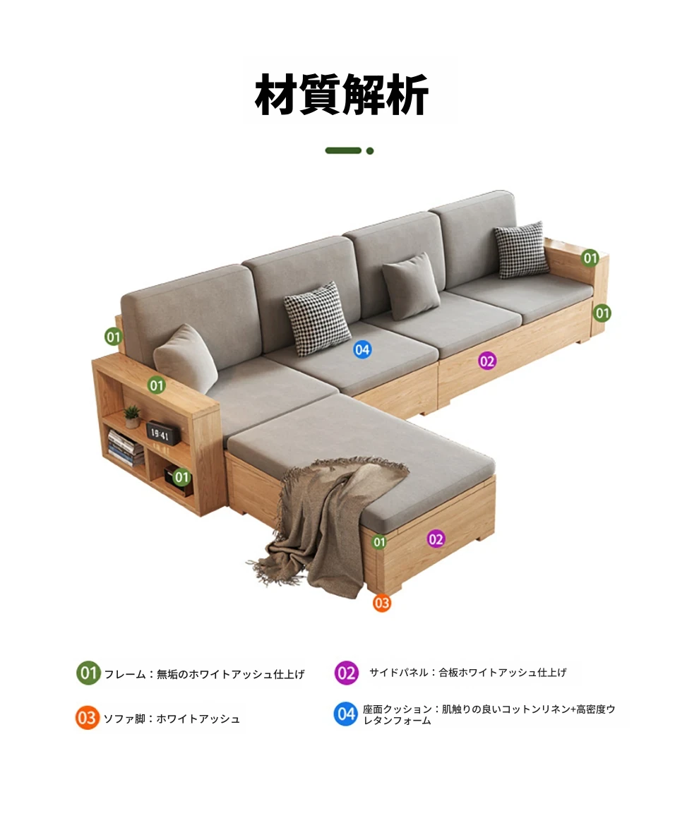 北欧スタイルの木製ソファ - 小さなリビングに最適なモダンでシンプルなデザイン!高収納ボックス付きのホワイトアッシュフレームで、スペースを有効活用しながら快適さを提供します。おしゃれで機能的なこのソファで、心地よい空間を演出しましょう!