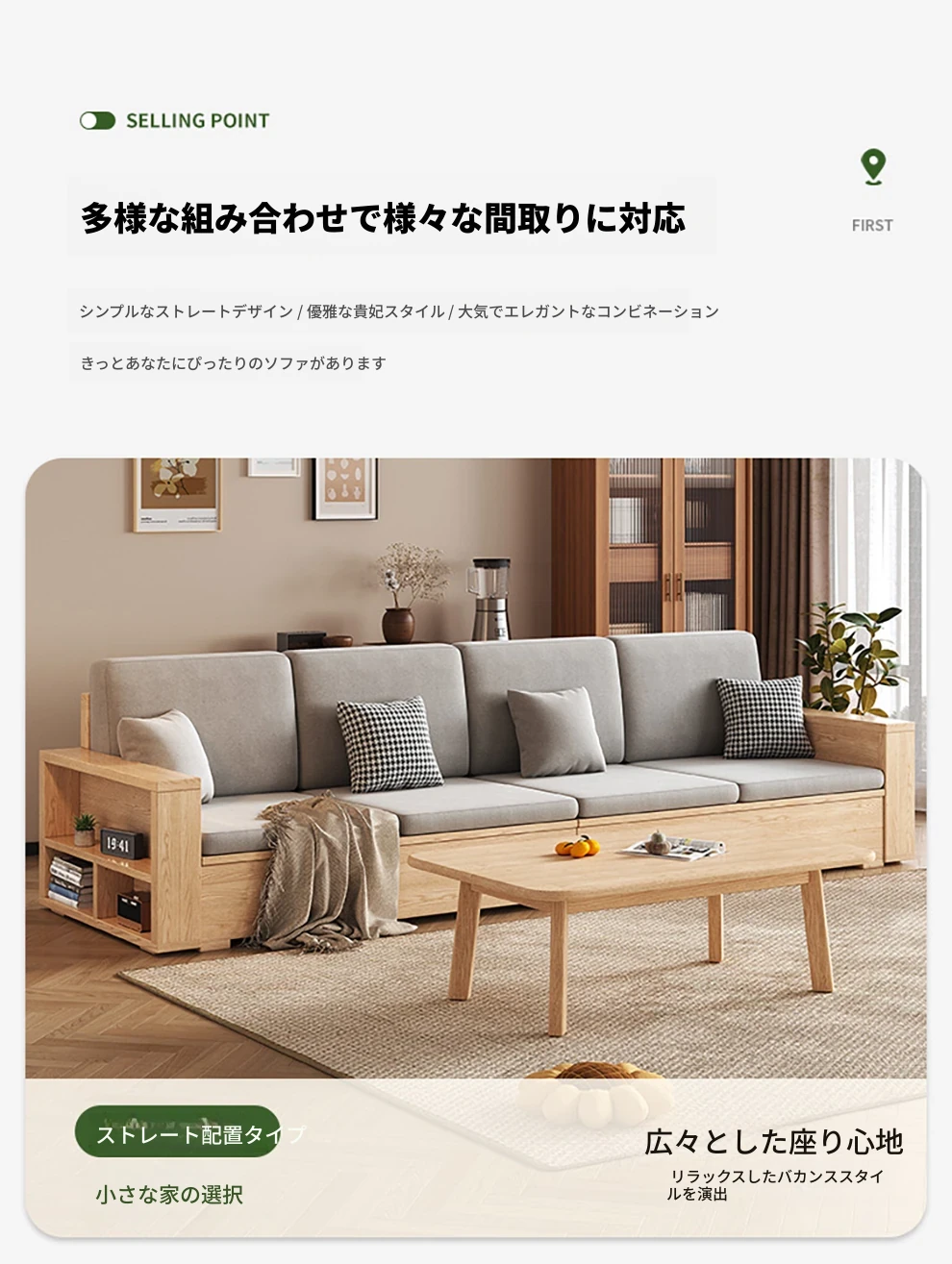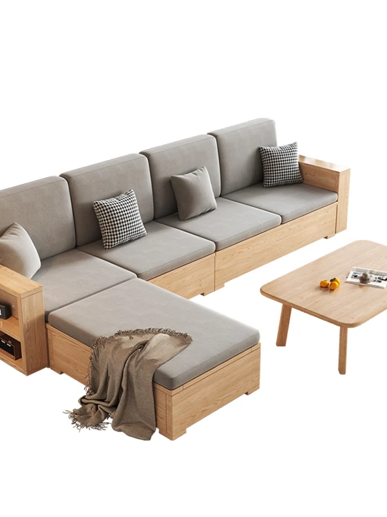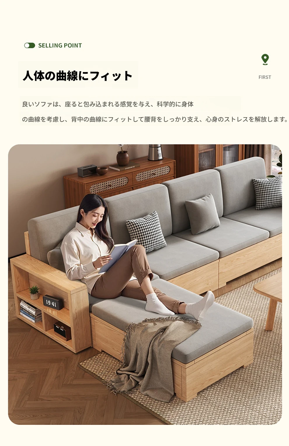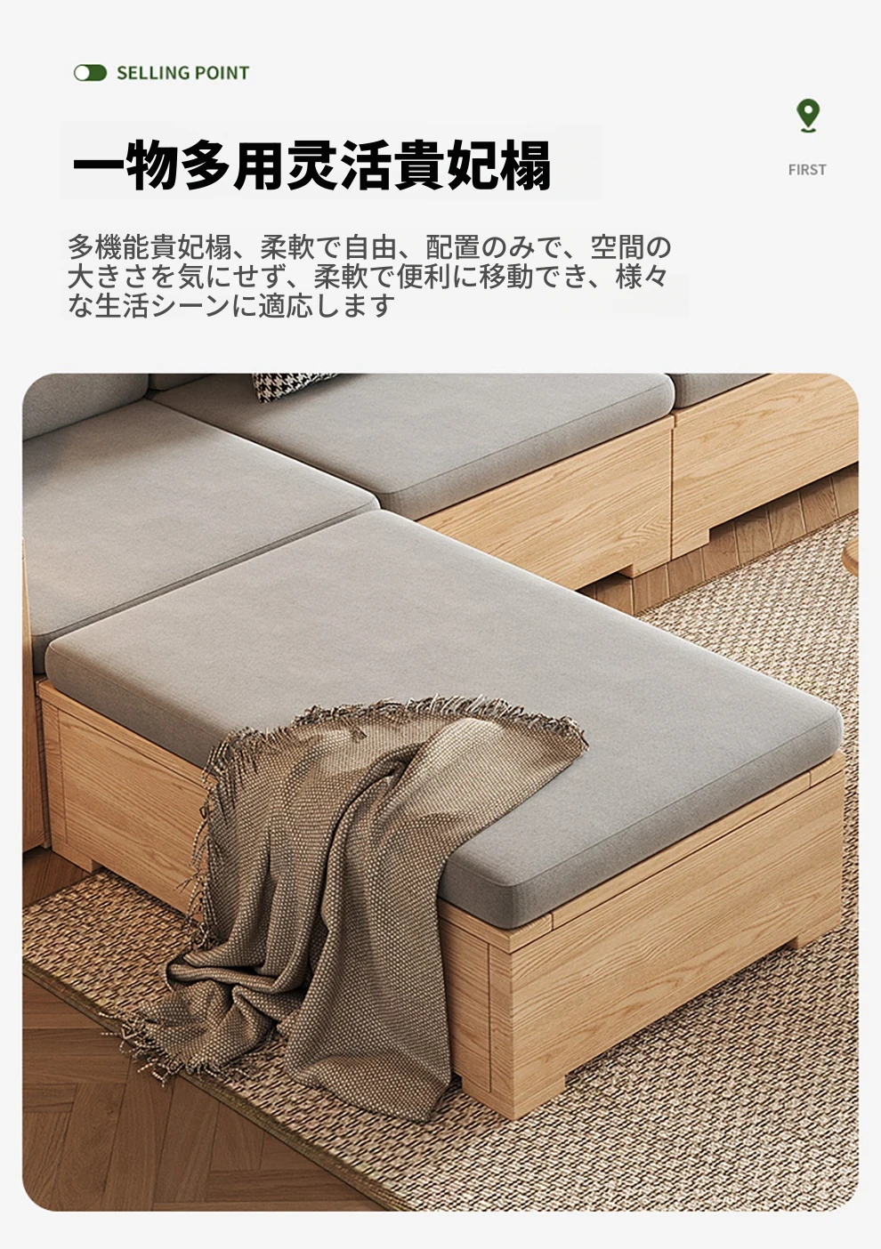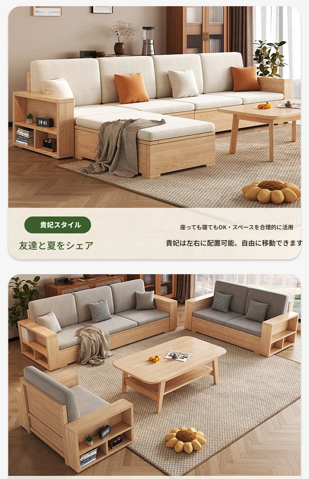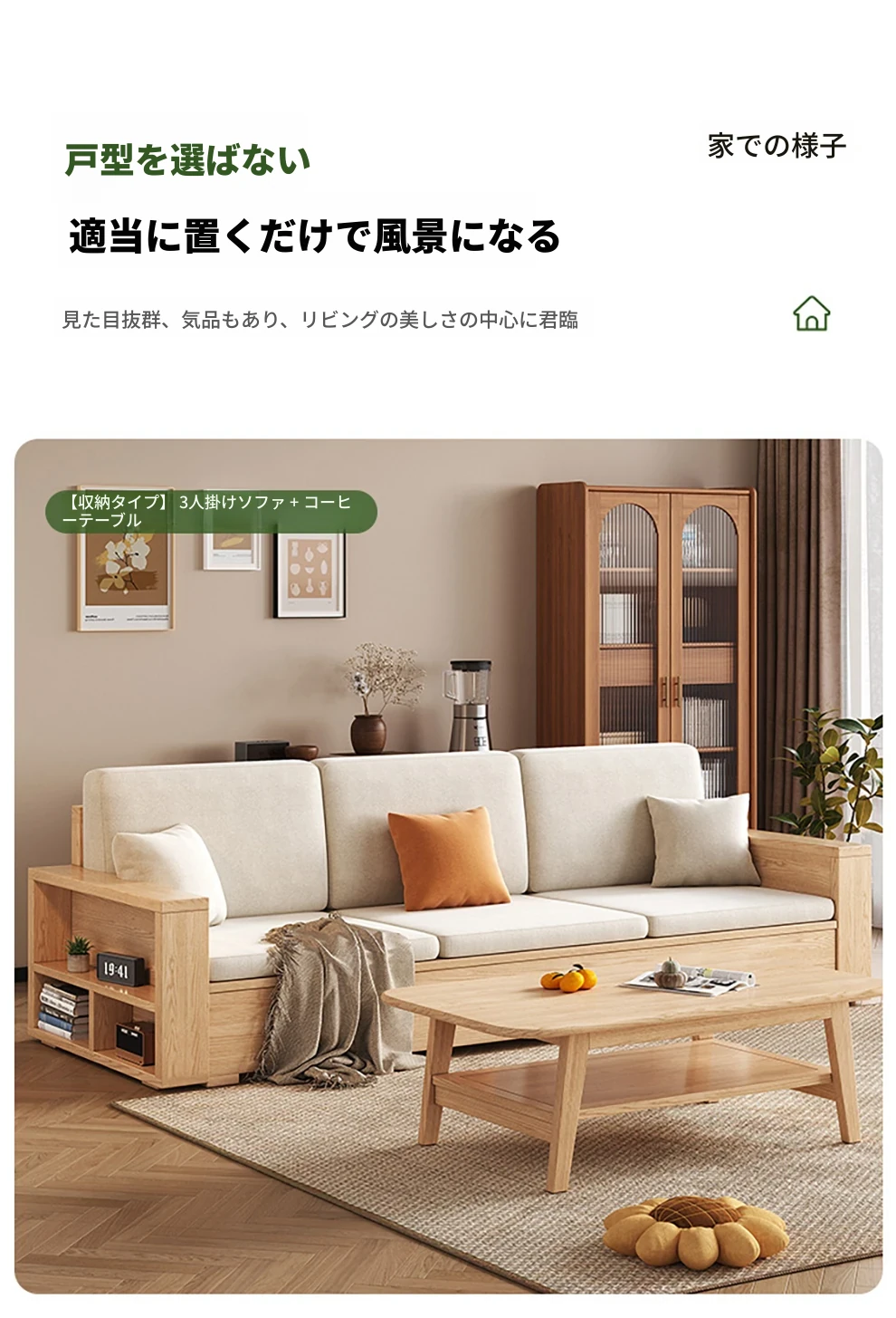 北欧スタイルの木製ソファ - 小さなリビングに最適なモダンでシンプルなデザイン!高収納ボックス付きのホワイトアッシュフレームで、スペースを有効活用しながら快適さを提供します。おしゃれで機能的なこのソファで、心地よい空間を演出しましょう!
