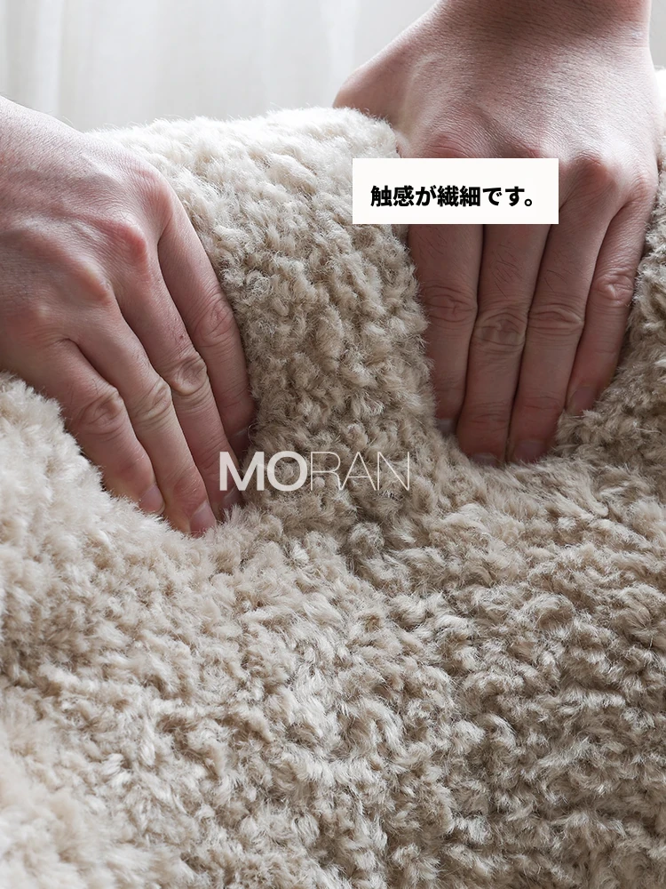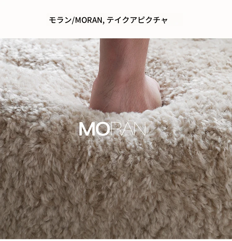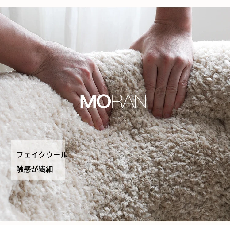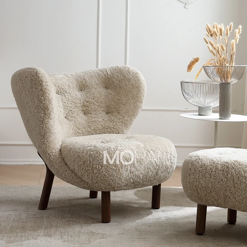 アイボリー色のロングファー材木色の脚付きアームチェア+フットスツール「ホワイトオーク」