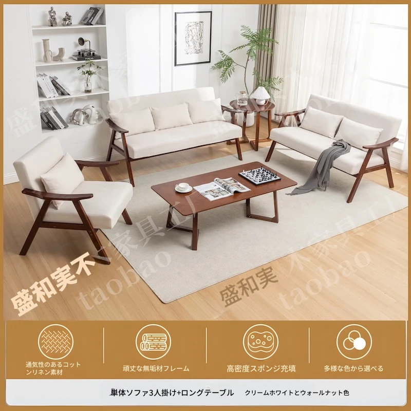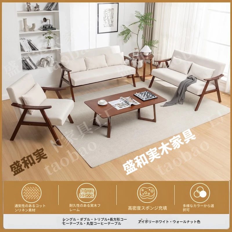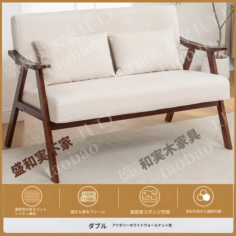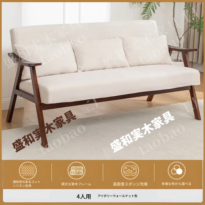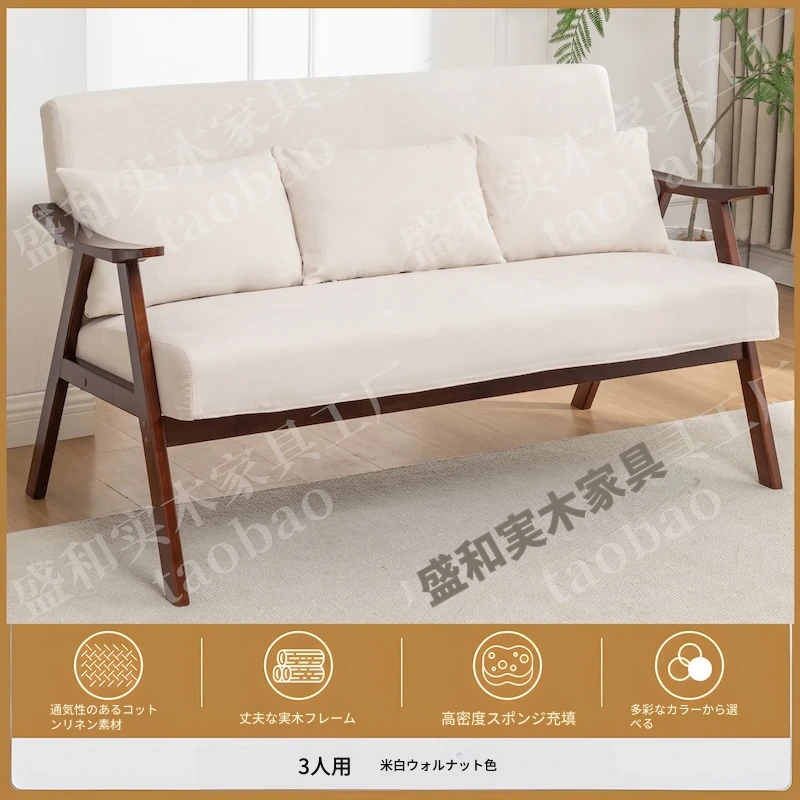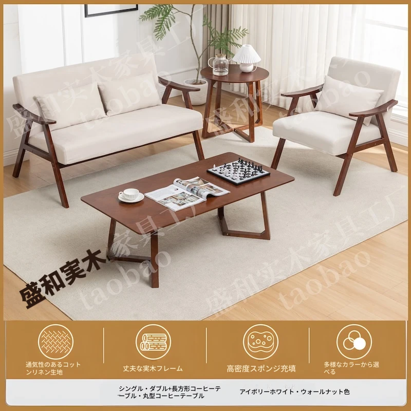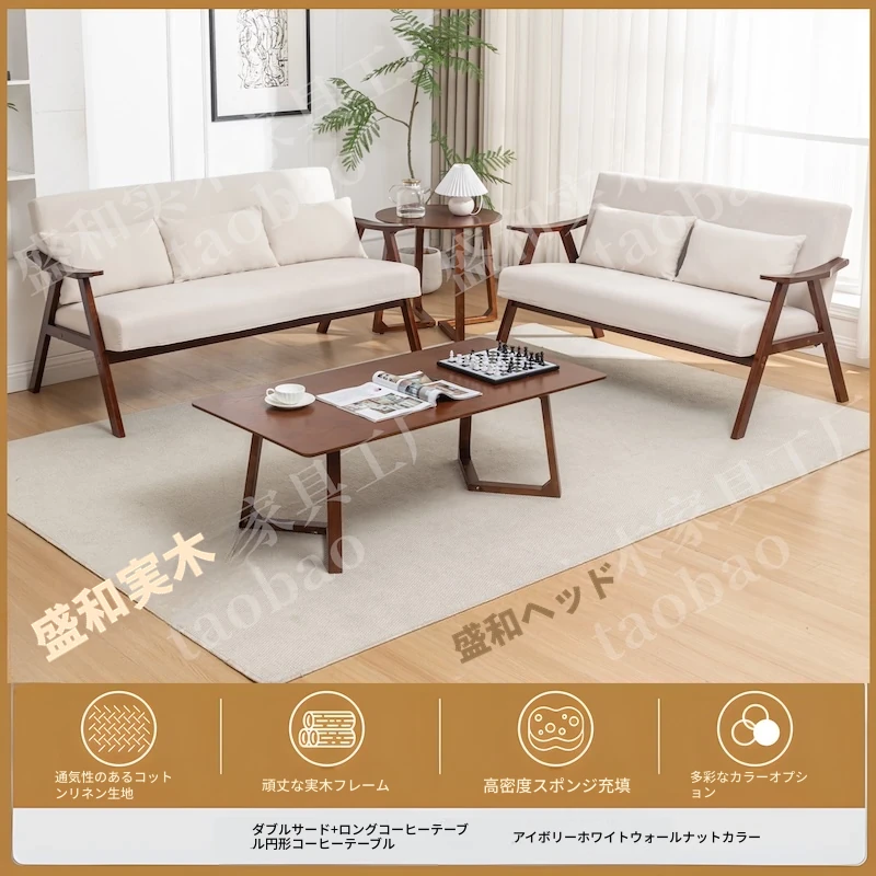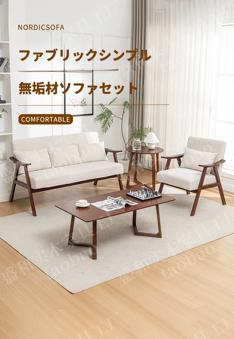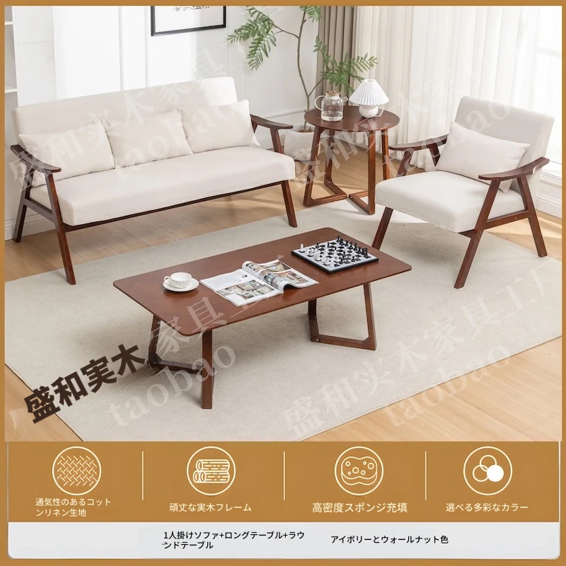 【レトロデザインの無垢材ソファセット】ウォールナット色の小型ファブリックソファ、オフィスや小さな部屋に最適!おしゃれで居心地の良い空間を演出します。会議やお客様を迎えるのにぴったりです!