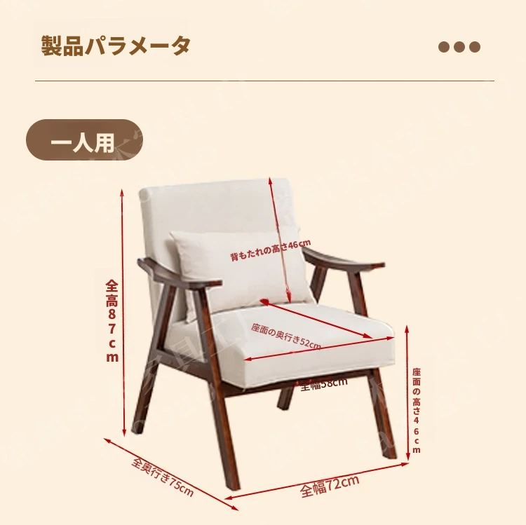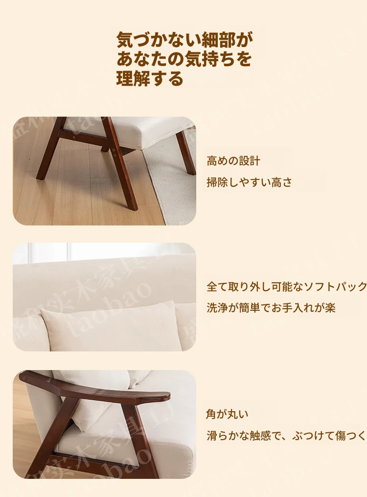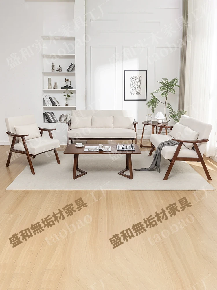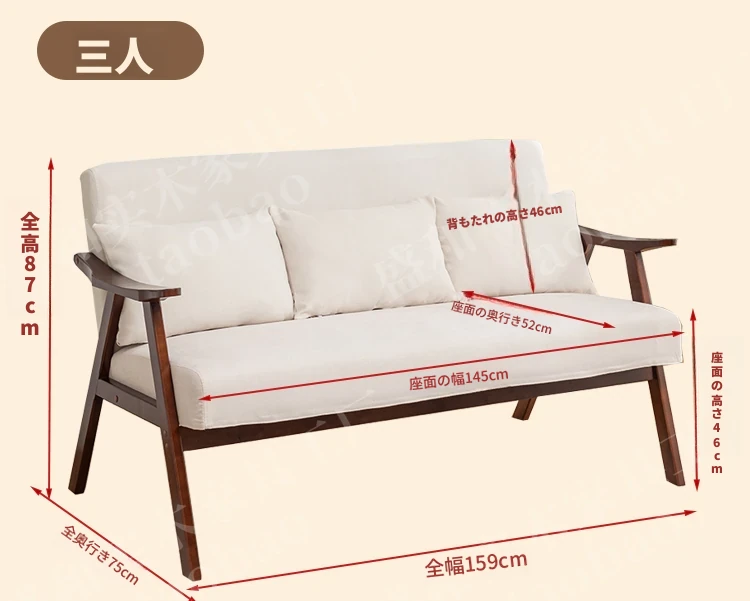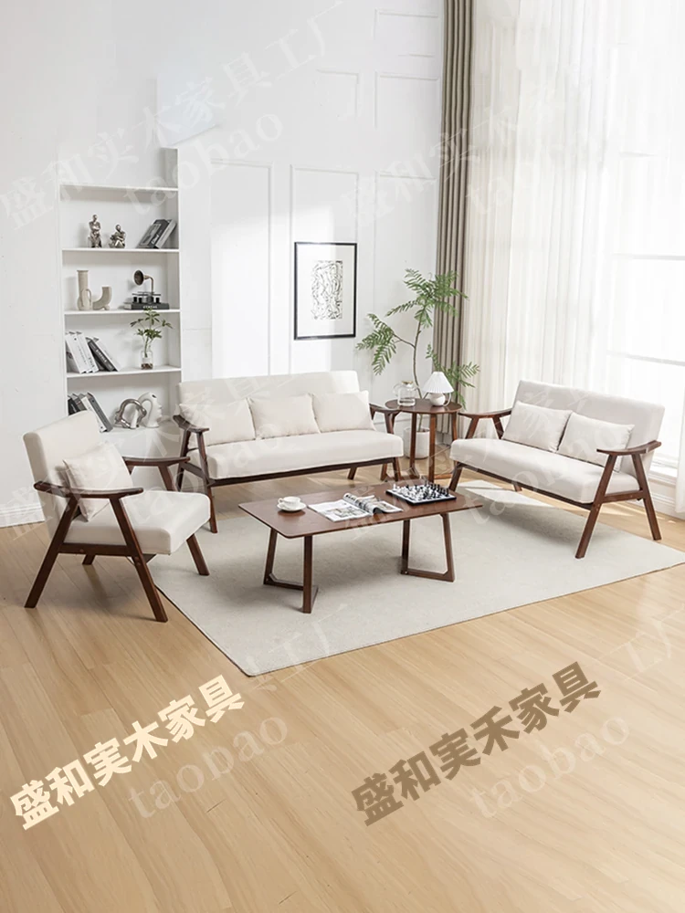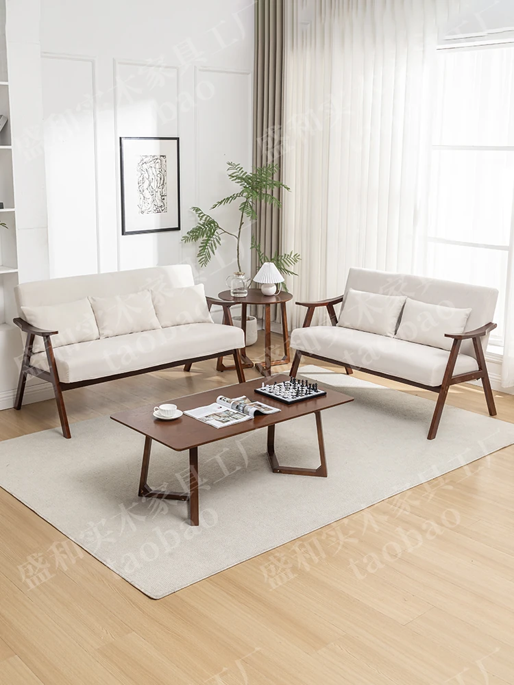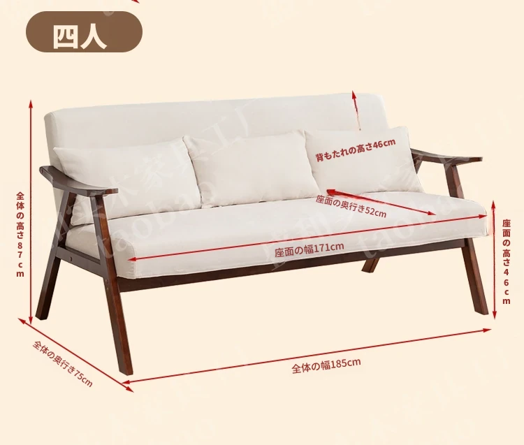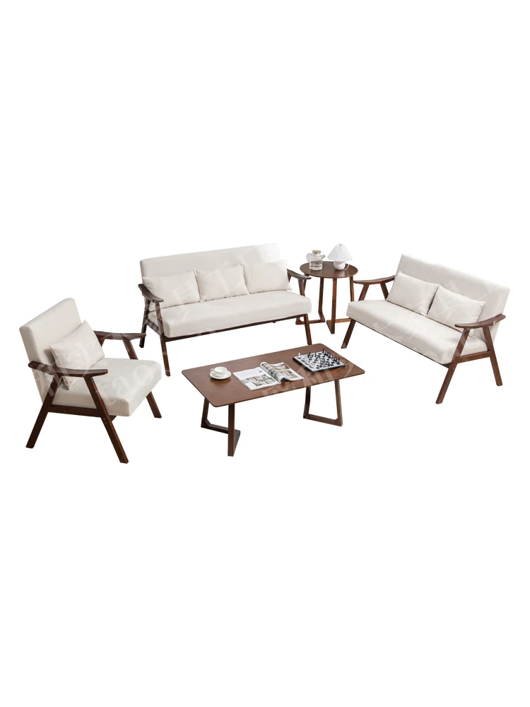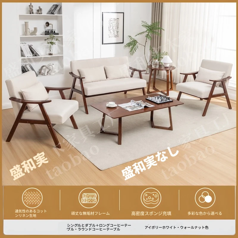 【レトロデザインの無垢材ソファセット】ウォールナット色の小型ファブリックソファ、オフィスや小さな部屋に最適!おしゃれで居心地の良い空間を演出します。会議やお客様を迎えるのにぴったりです!