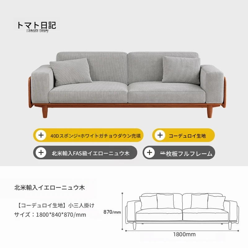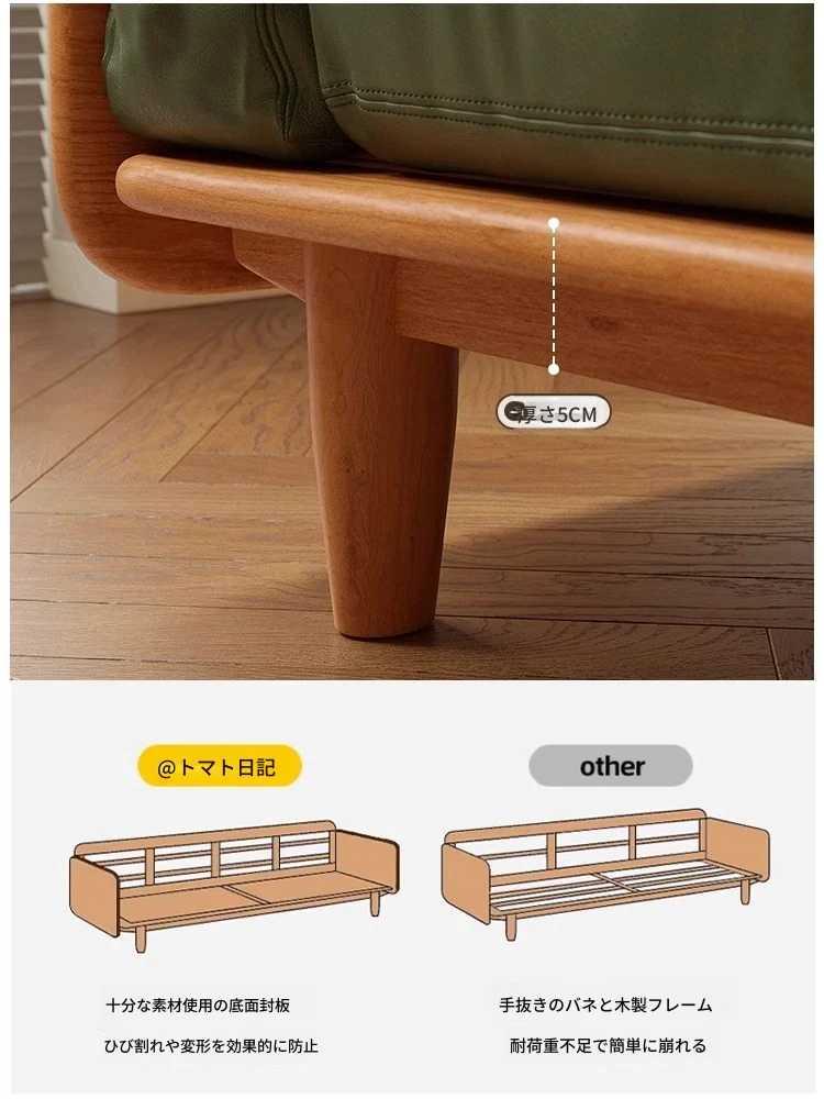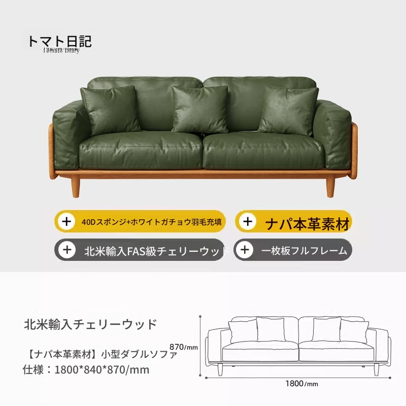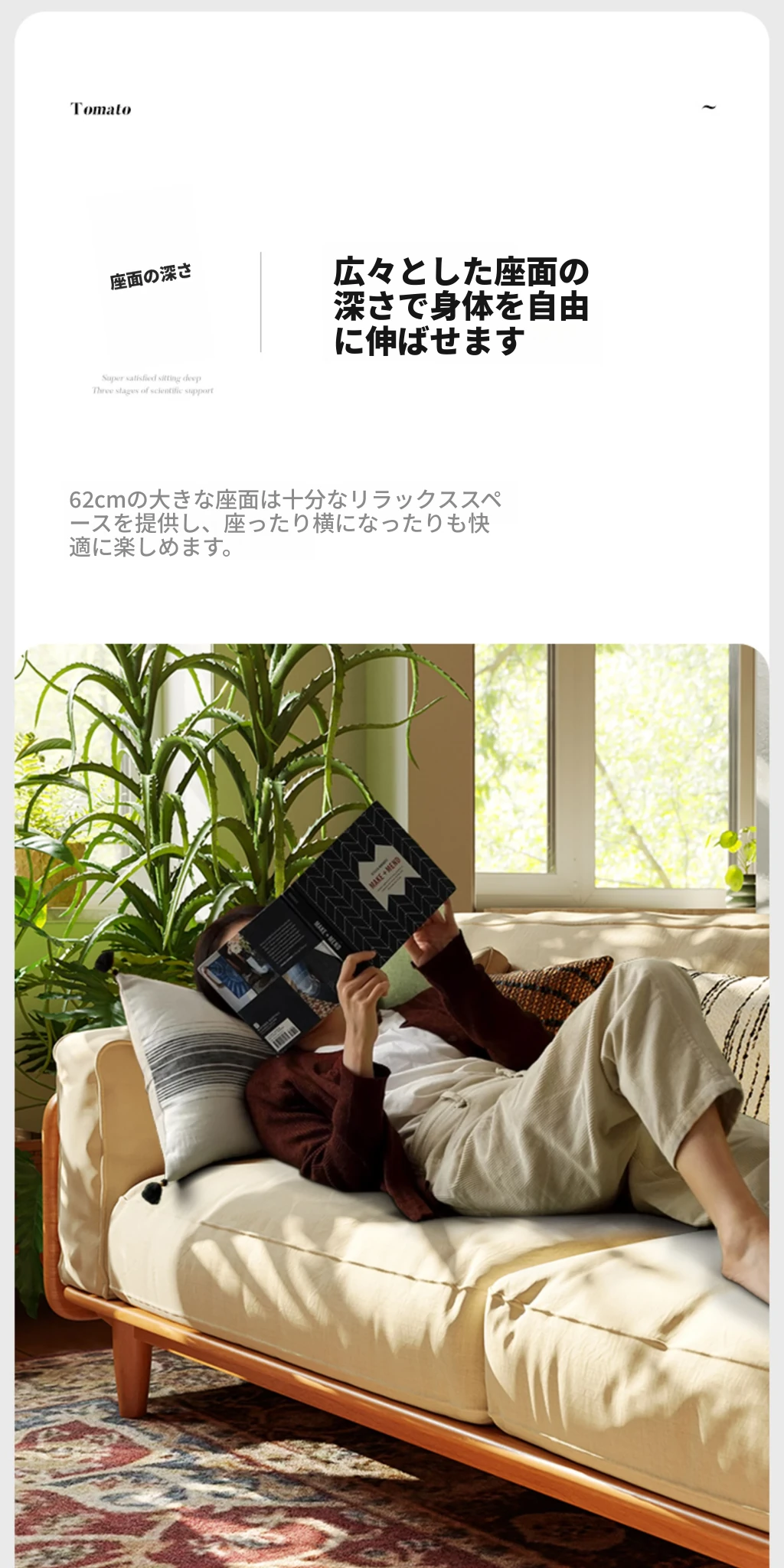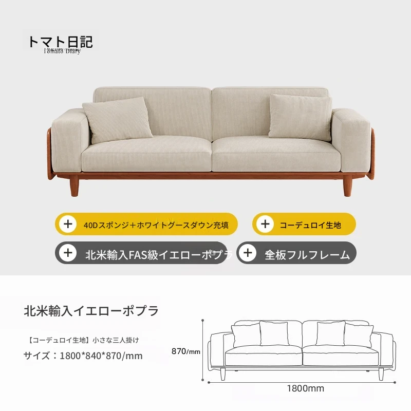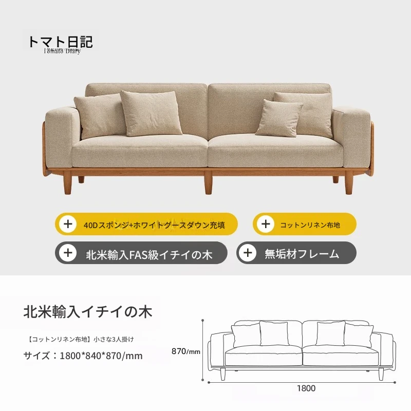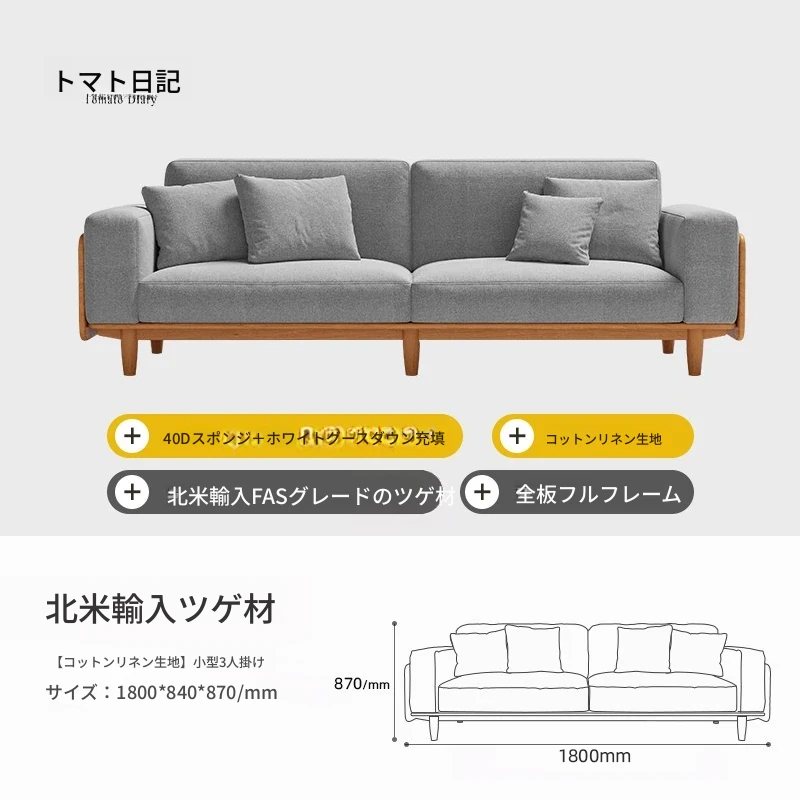 トマト日記 オシャレな北欧スタイルの本革&麻混合ソファ 小型住宅に最適な実木製リビングソファ 自然素材の温もりを感じる、快適な空間を演出!