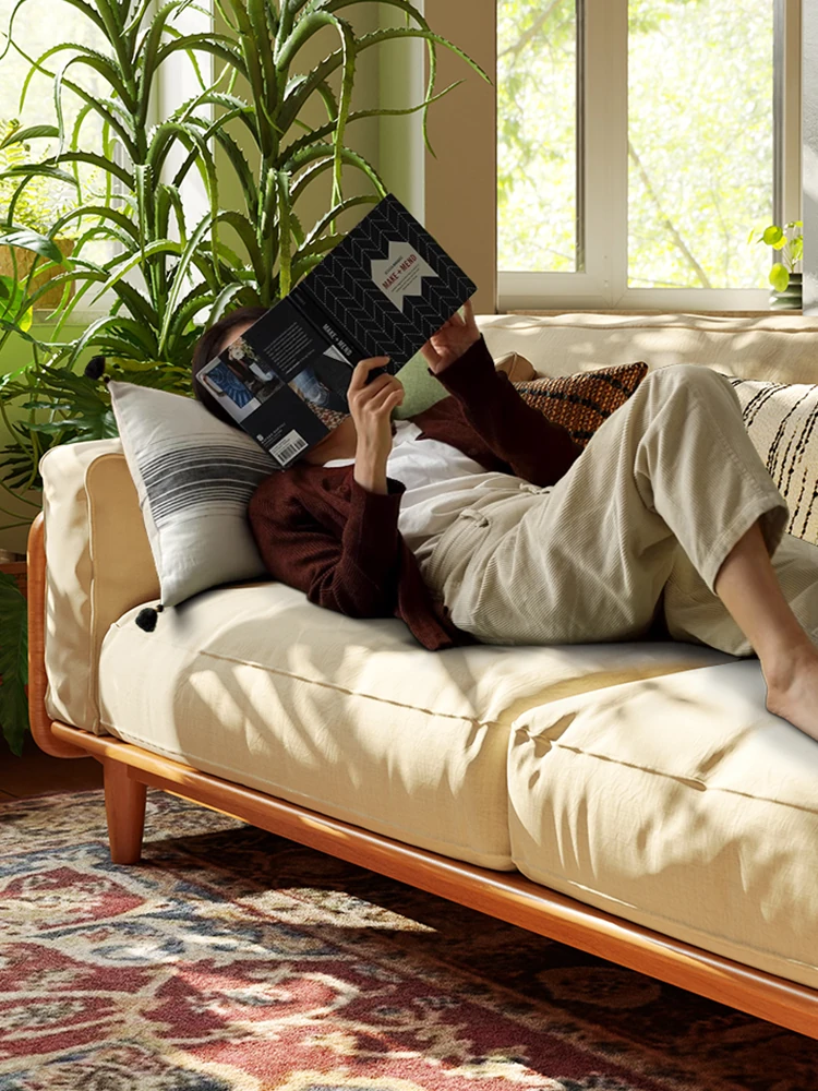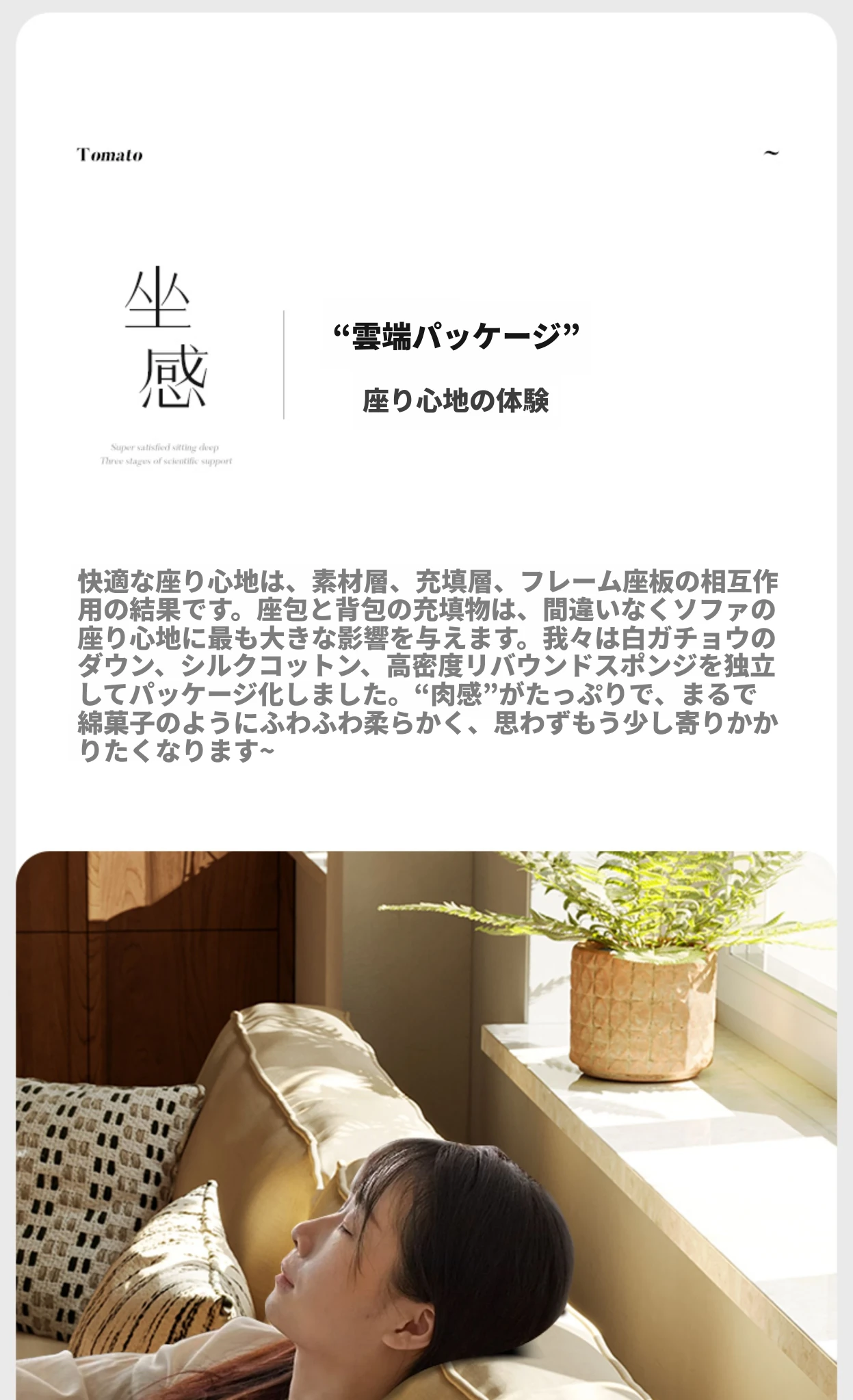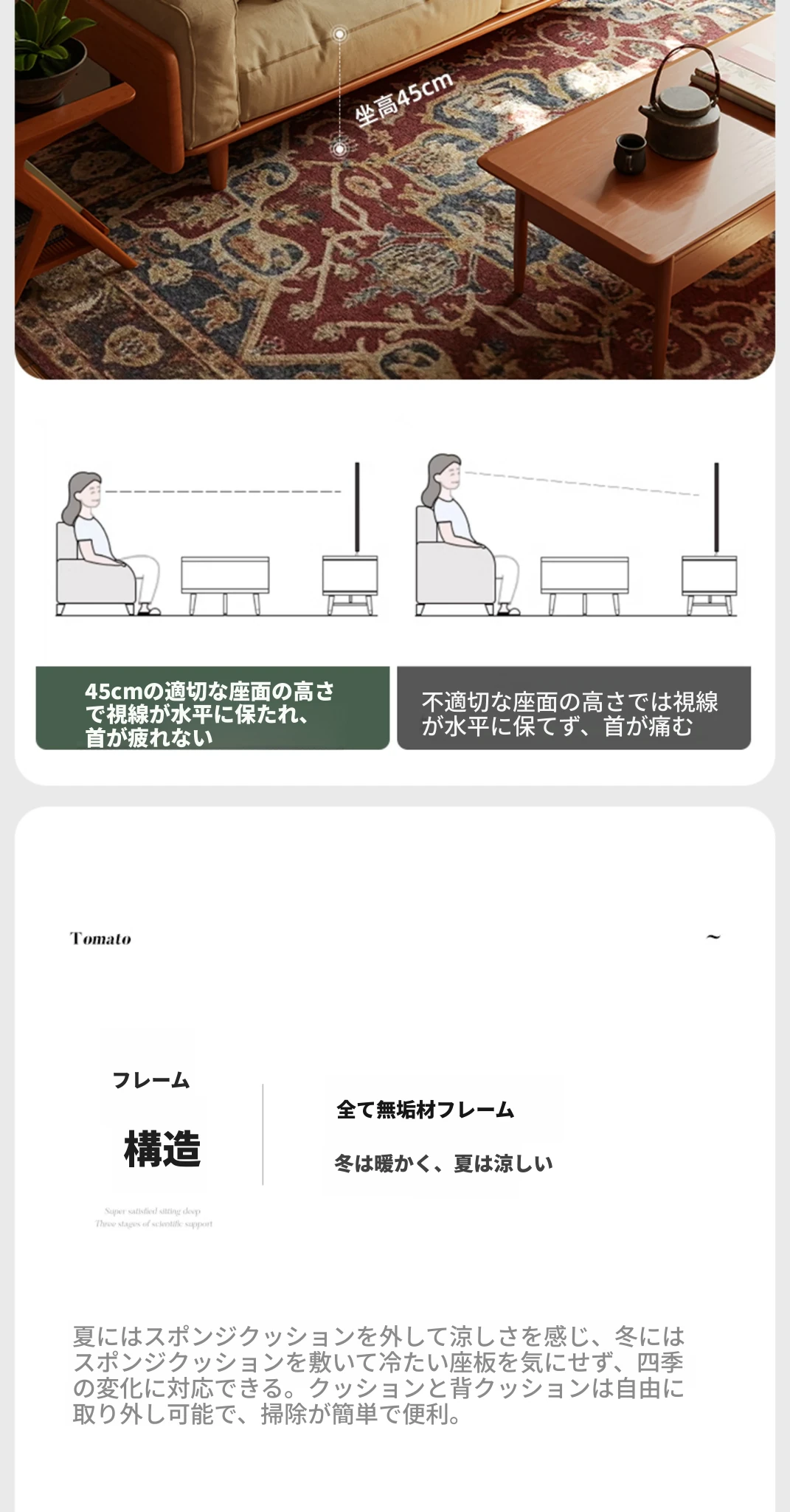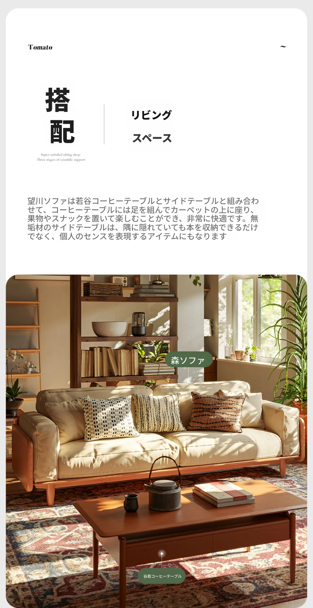 トマト日記 オシャレな北欧スタイルの本革&麻混合ソファ 小型住宅に最適な実木製リビングソファ 自然素材の温もりを感じる、快適な空間を演出!