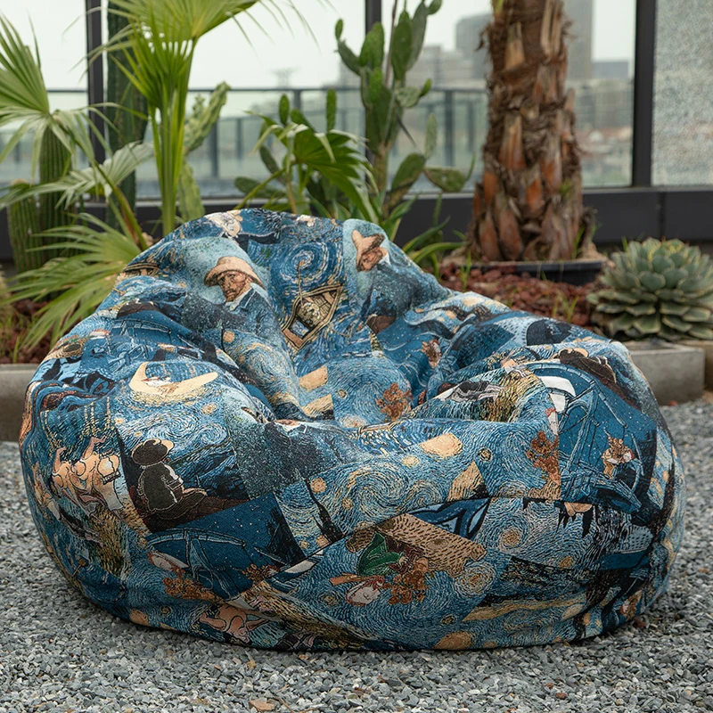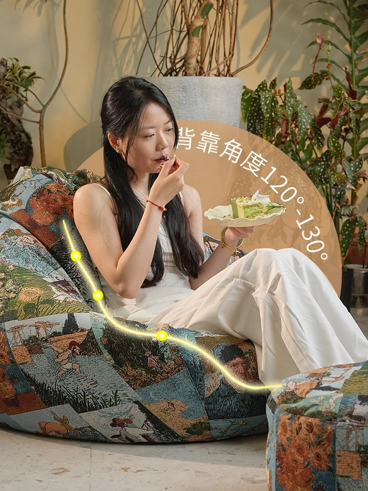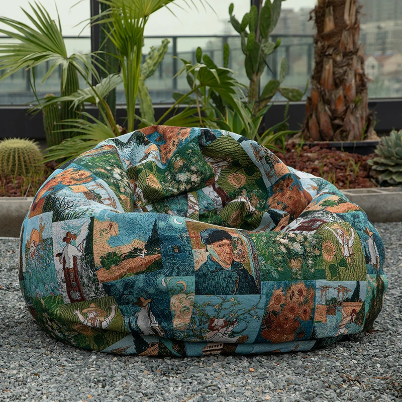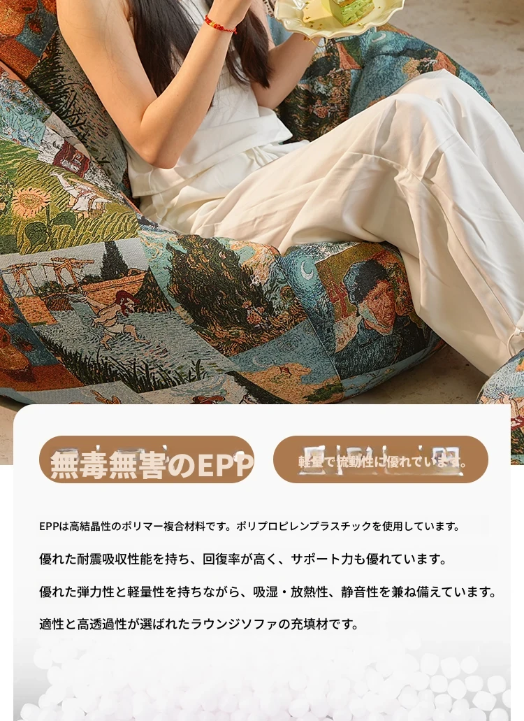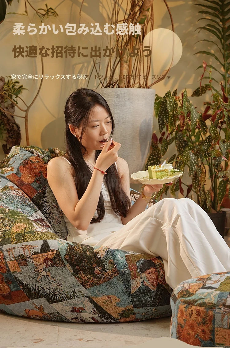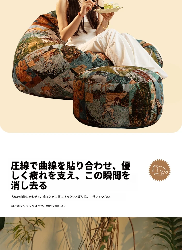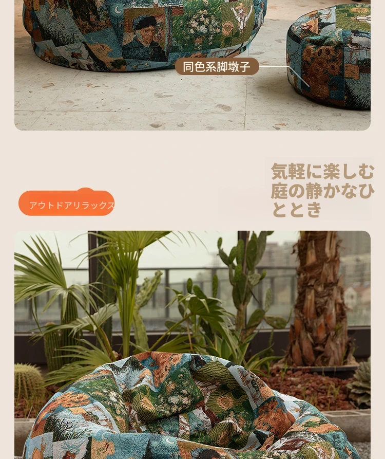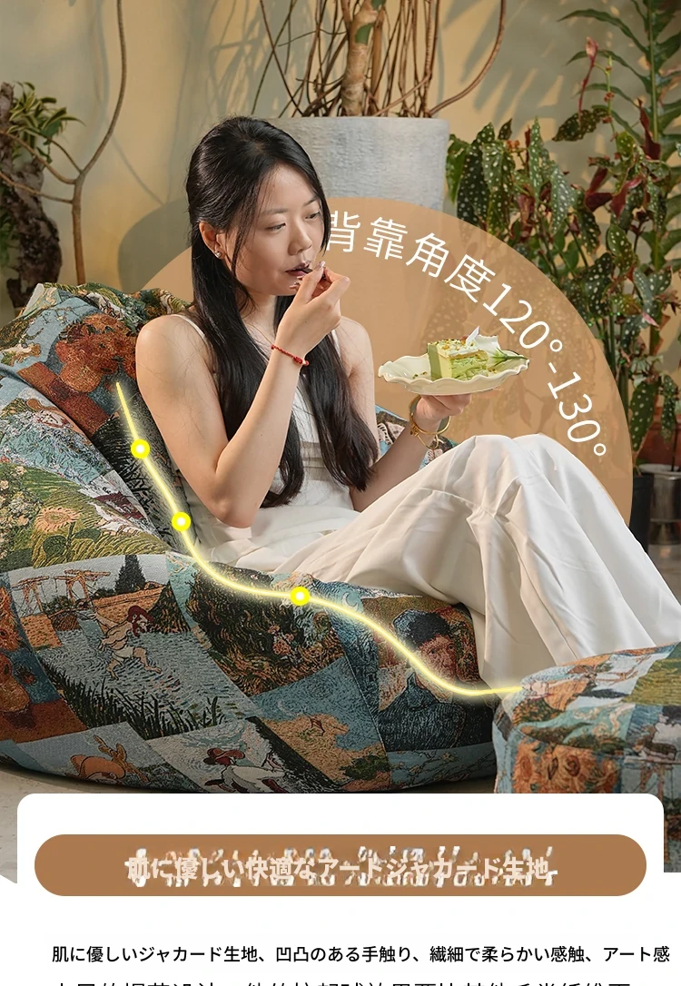 ヴァンゴー風リクライニングソファ、寝転びながらくつろげる一人用、民族風デザインのゲストハウスにぴったり!粒状充填の布製ビーズクッションで、快適さとスタイルを両立。