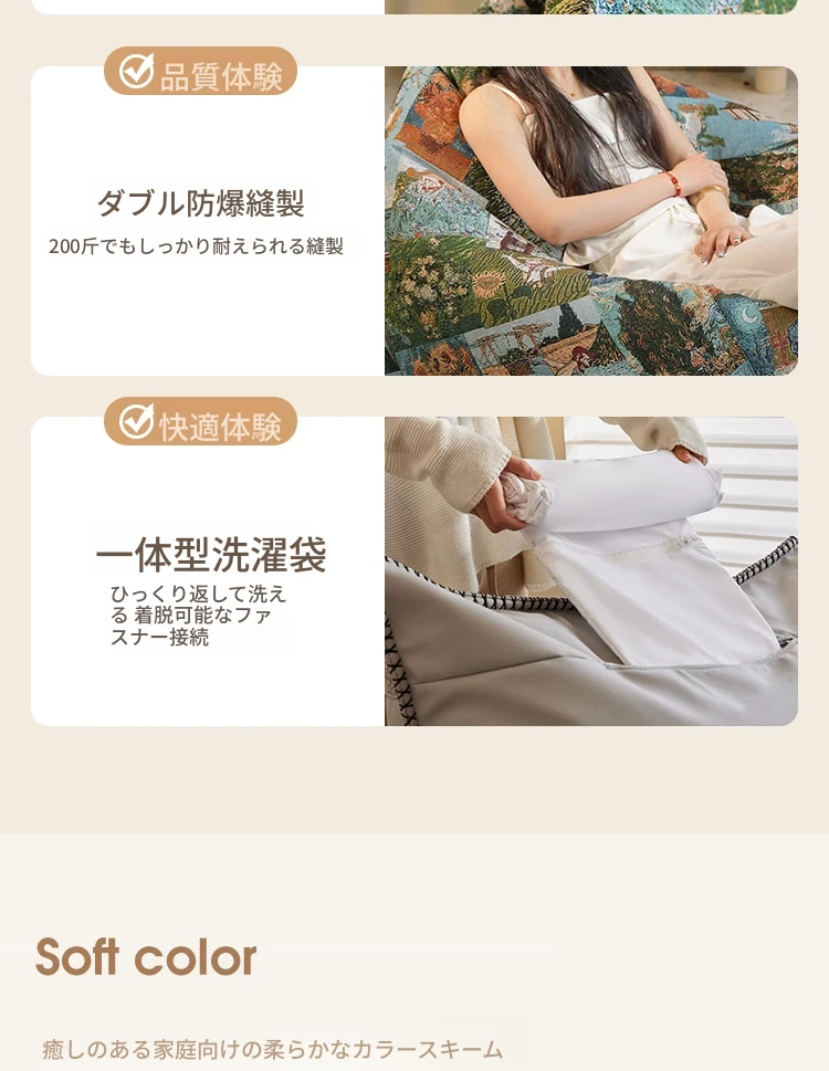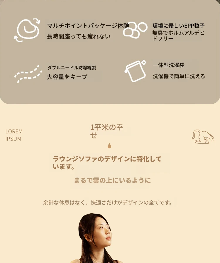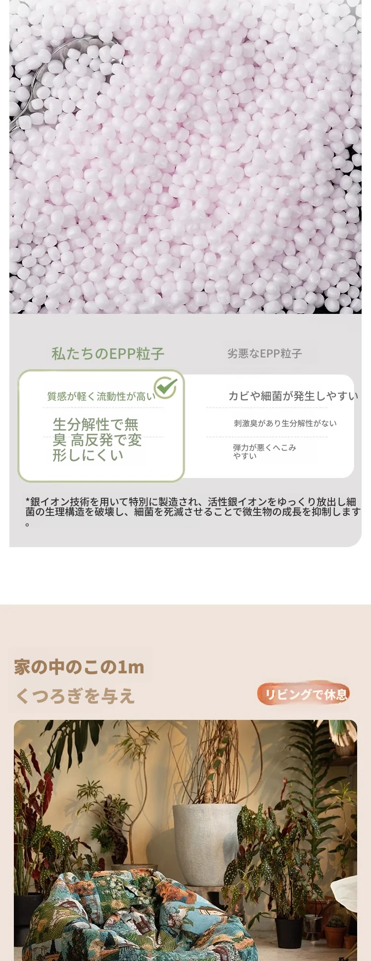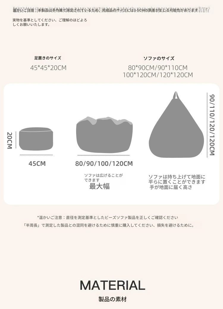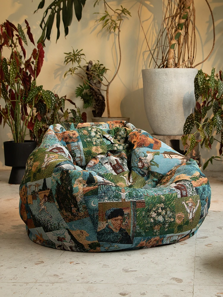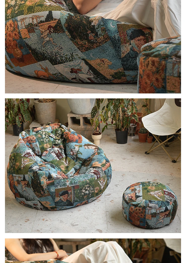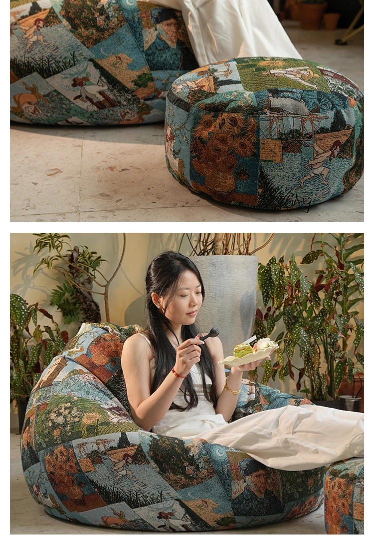 ヴァンゴー風リクライニングソファ、寝転びながらくつろげる一人用、民族風デザインのゲストハウスにぴったり!粒状充填の布製ビーズクッションで、快適さとスタイルを両立。