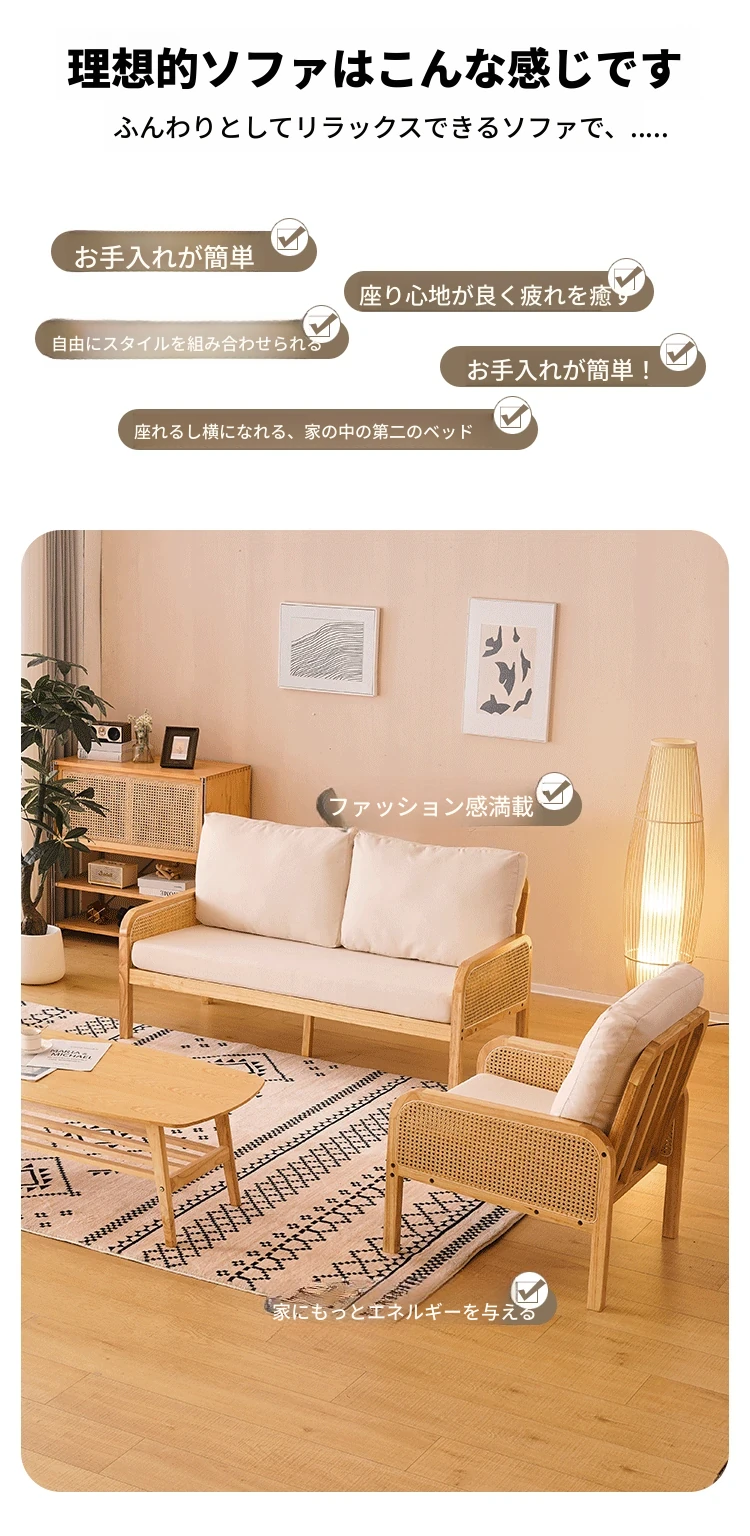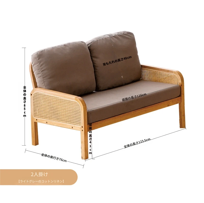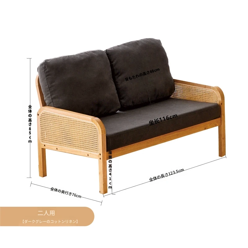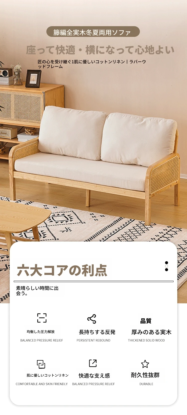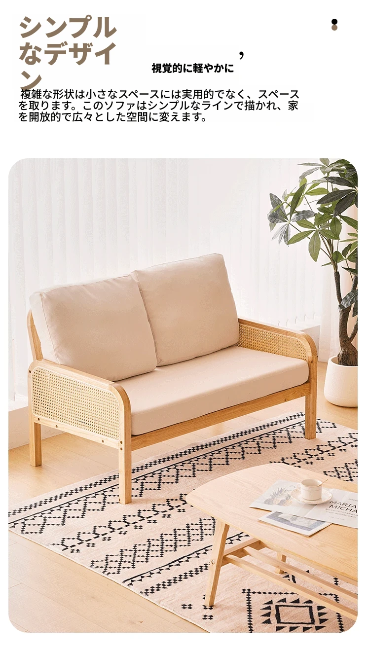 【天然木材使用】藤編み冬夏両用!シンプルでおしゃれな布張り小型ソファ、民宿風のナチュラルデザイン、ダブルスリーピース直置きタイプ。快適なリビング空間を演出します!