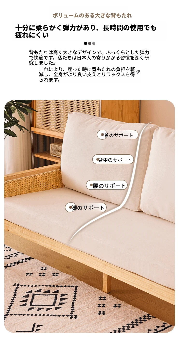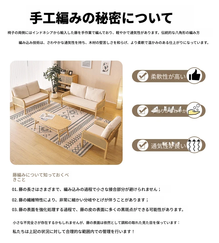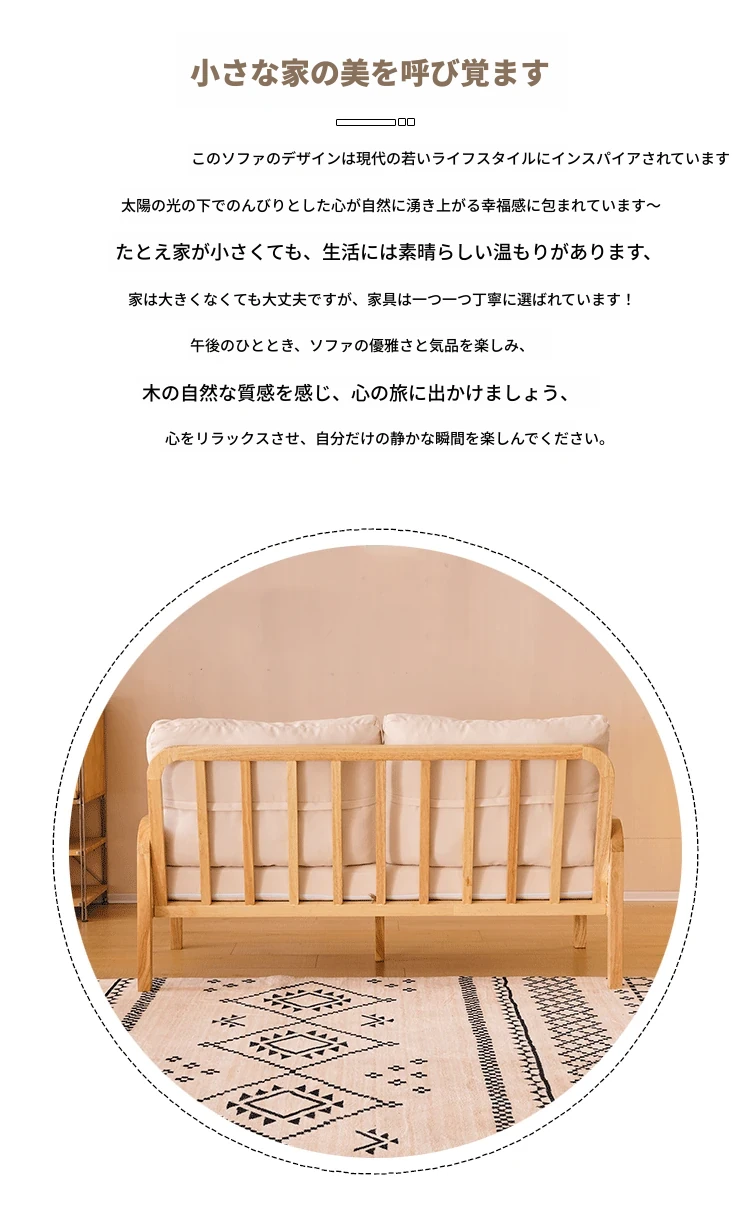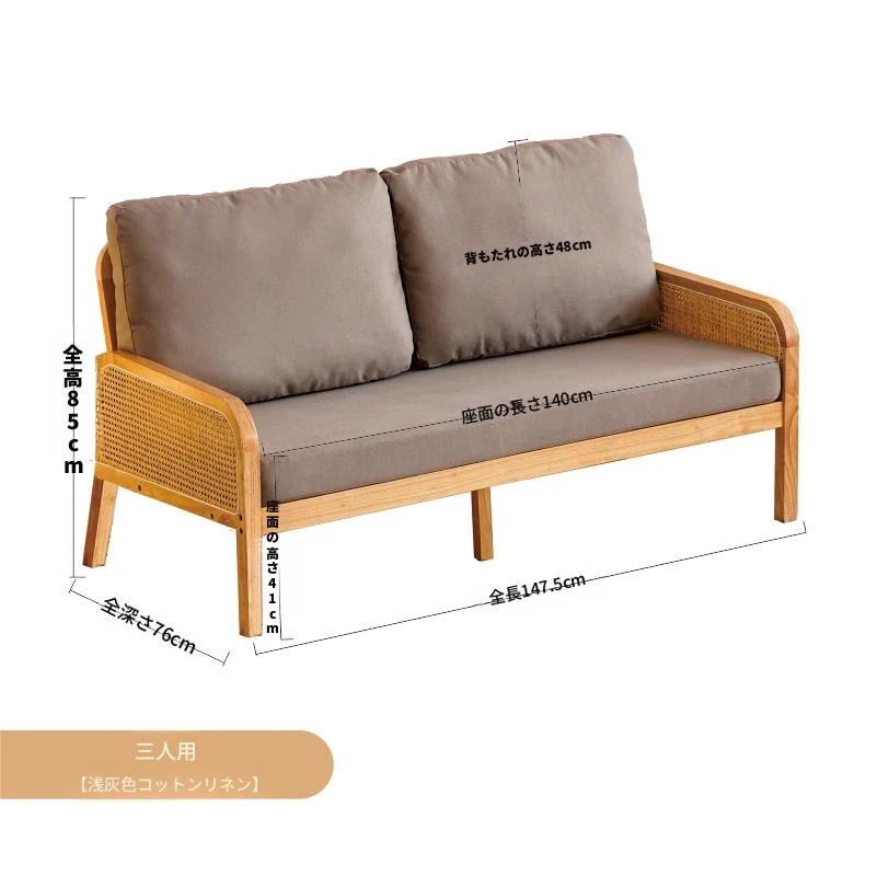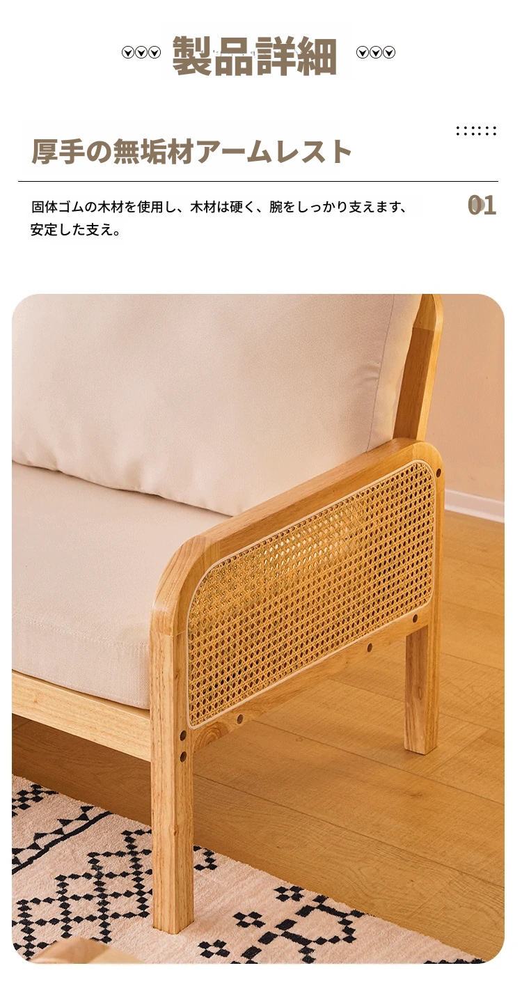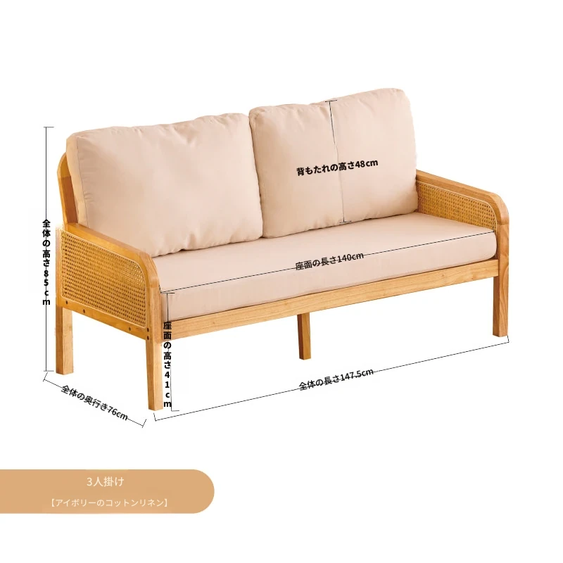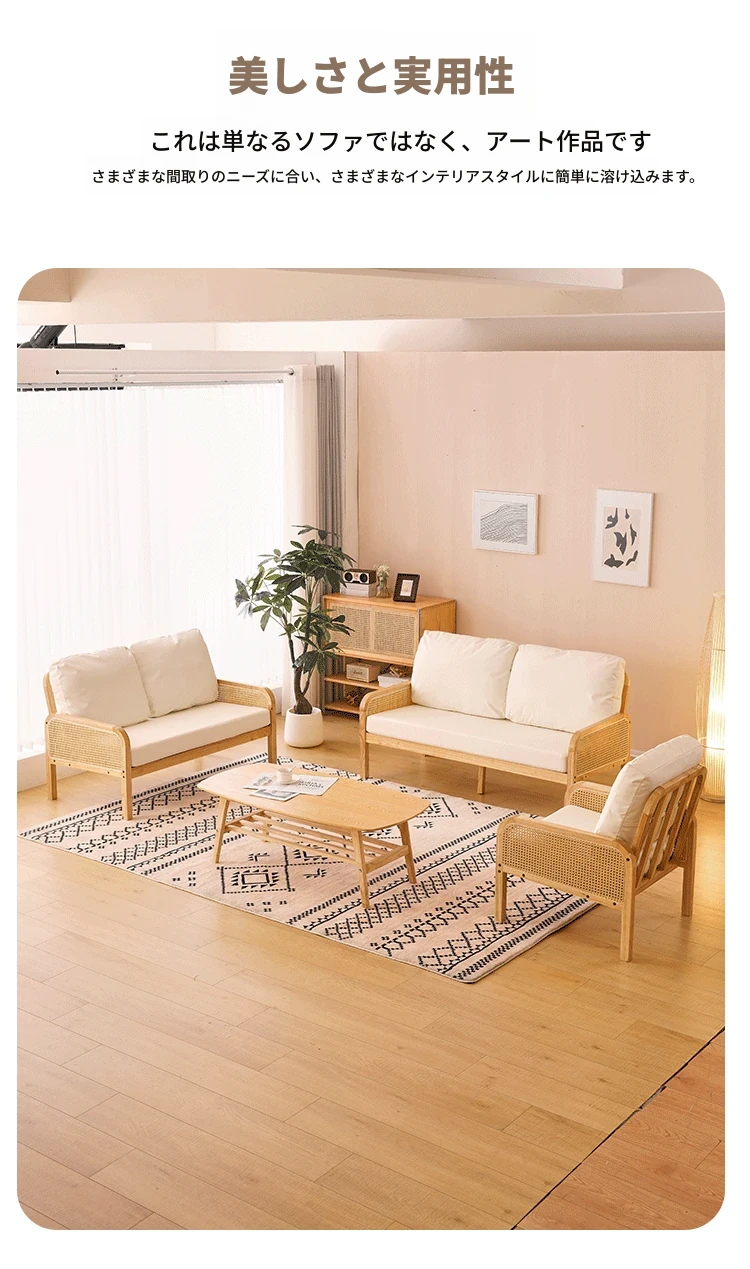 【天然木材使用】藤編み冬夏両用!シンプルでおしゃれな布張り小型ソファ、民宿風のナチュラルデザイン、ダブルスリーピース直置きタイプ。快適なリビング空間を演出します!