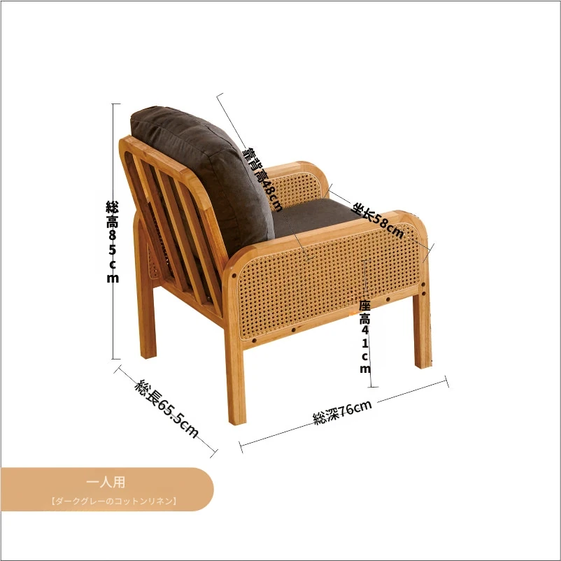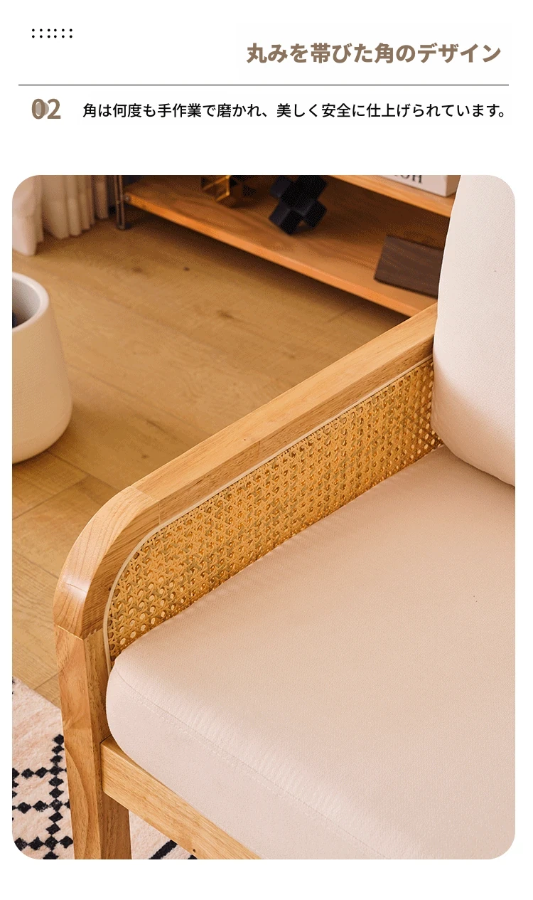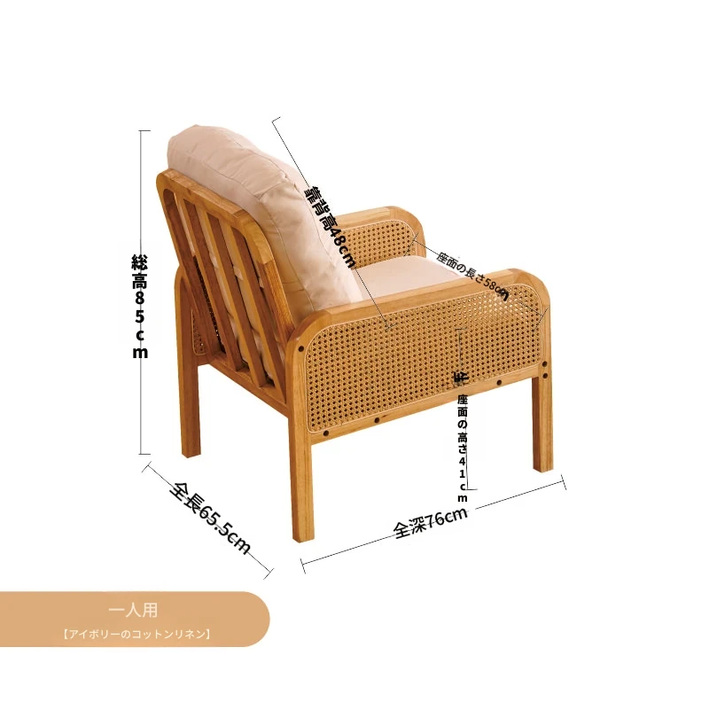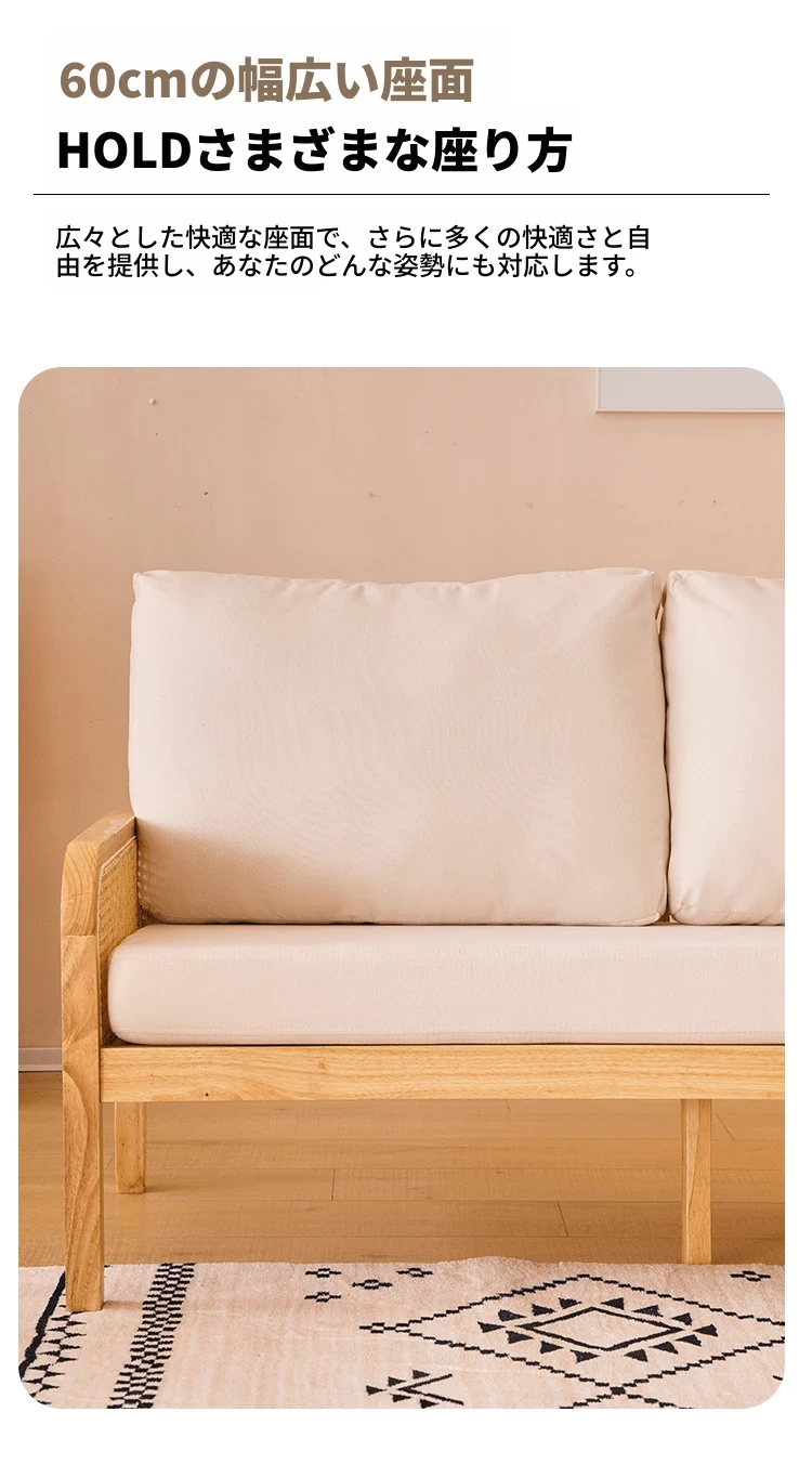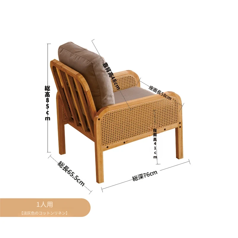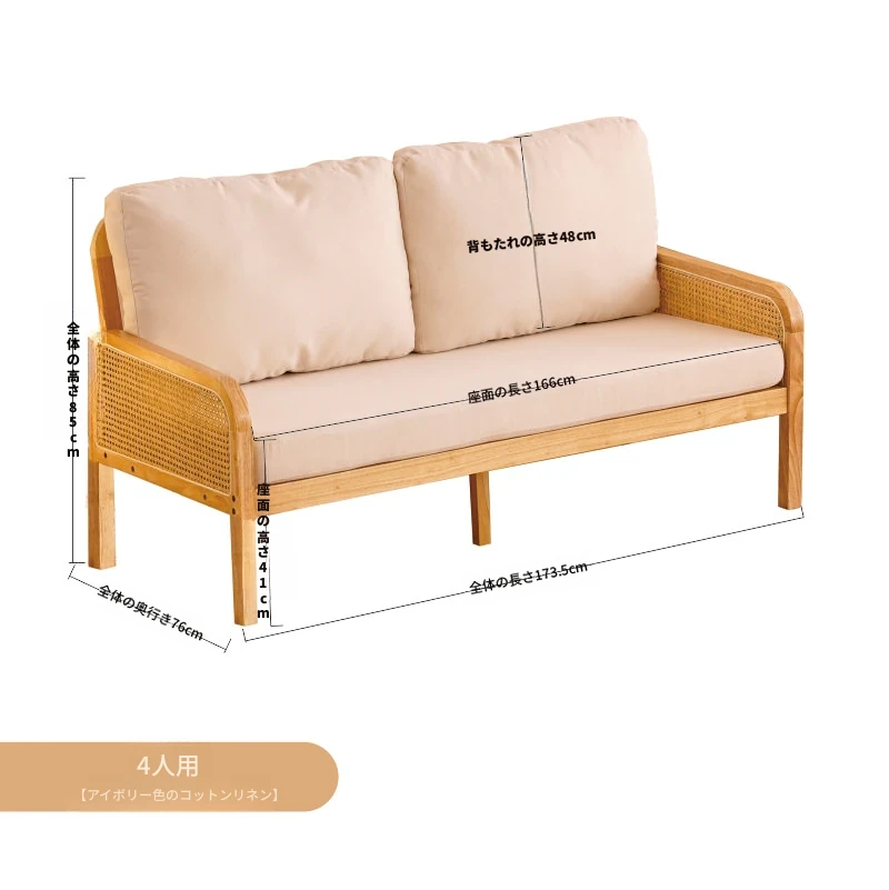 【天然木材使用】藤編み冬夏両用!シンプルでおしゃれな布張り小型ソファ、民宿風のナチュラルデザイン、ダブルスリーピース直置きタイプ。快適なリビング空間を演出します!