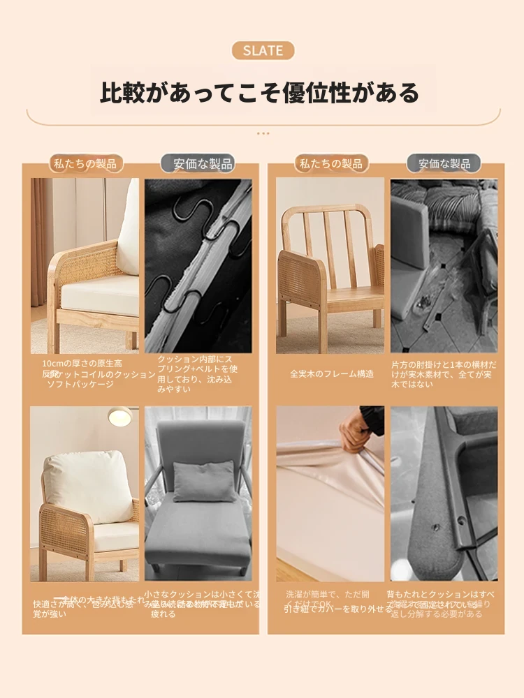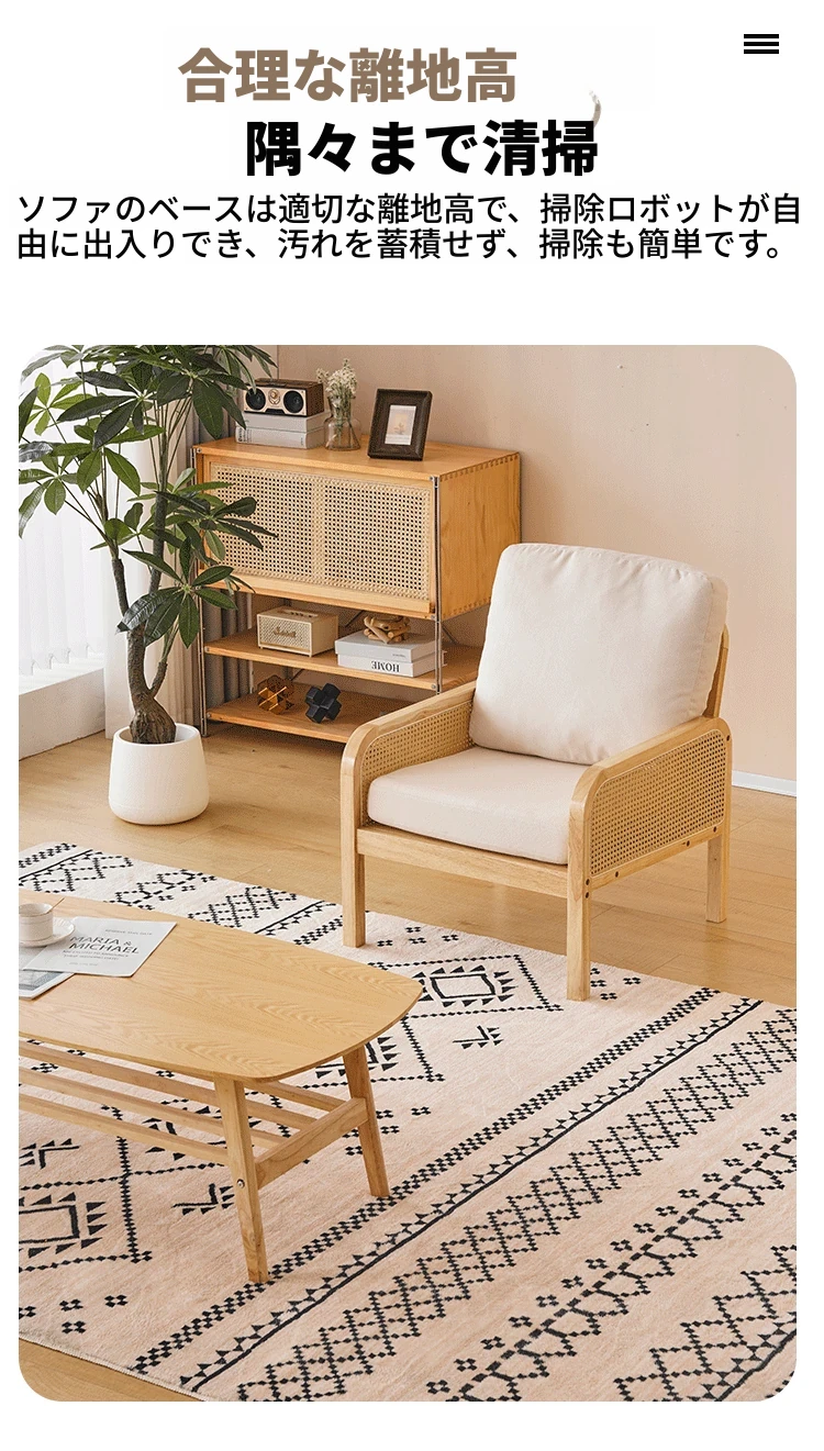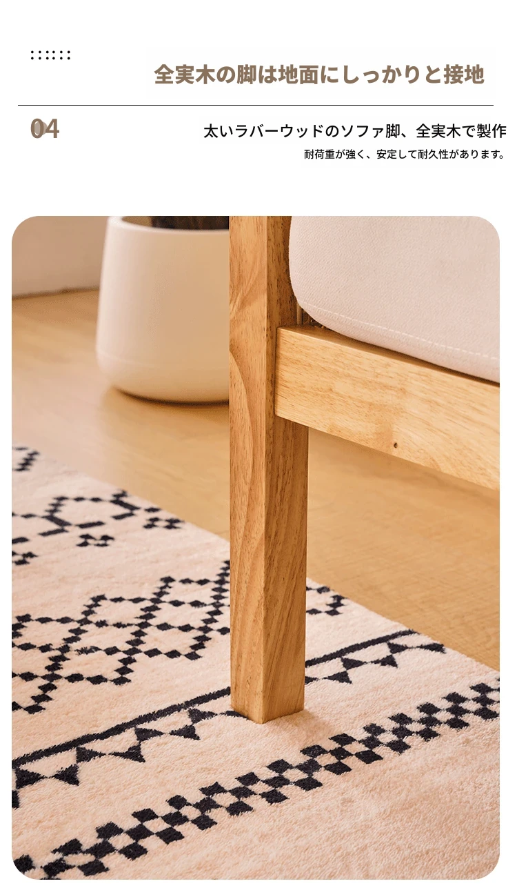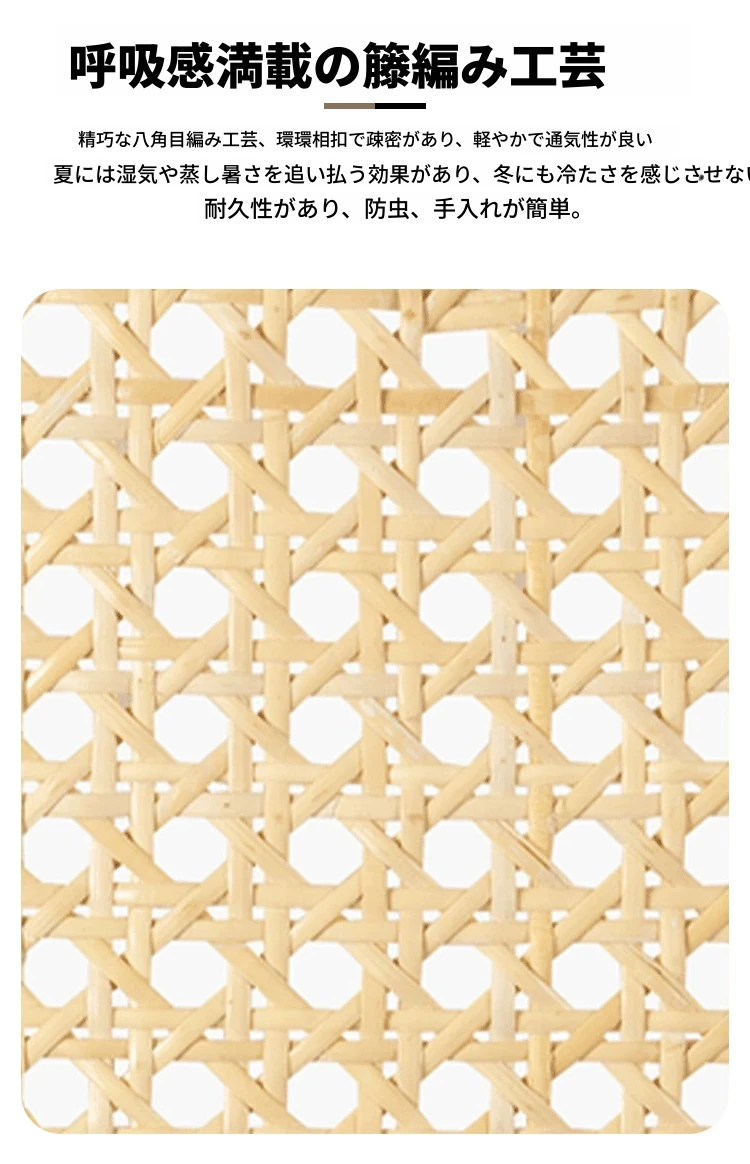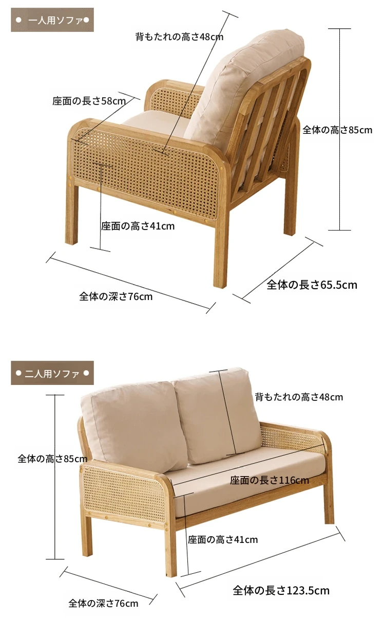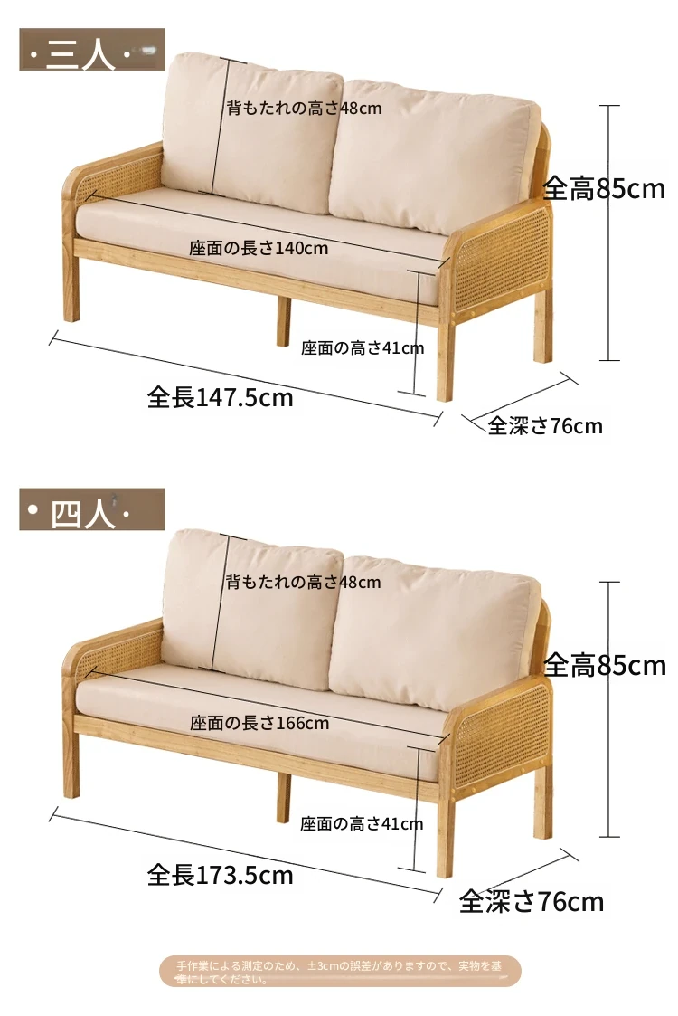 【天然木材使用】藤編み冬夏両用!シンプルでおしゃれな布張り小型ソファ、民宿風のナチュラルデザイン、ダブルスリーピース直置きタイプ。快適なリビング空間を演出します!
