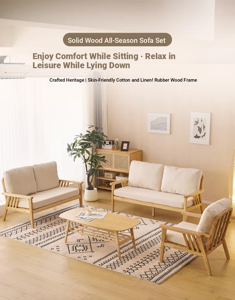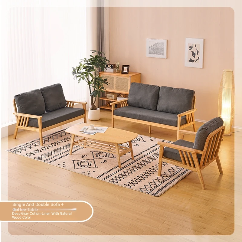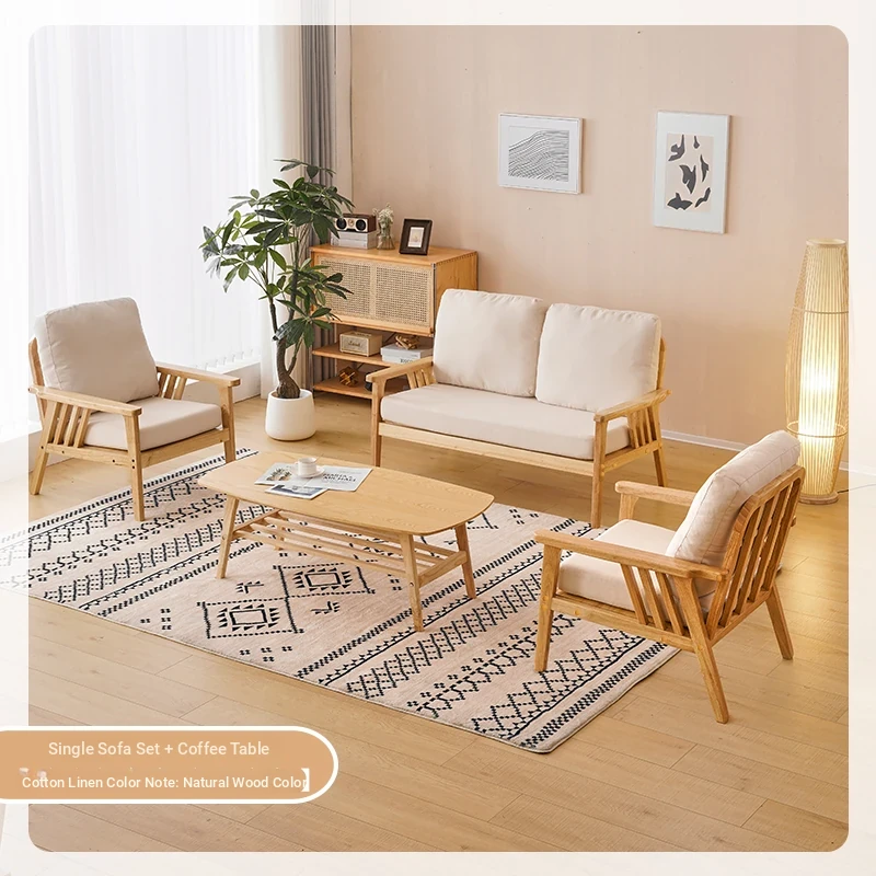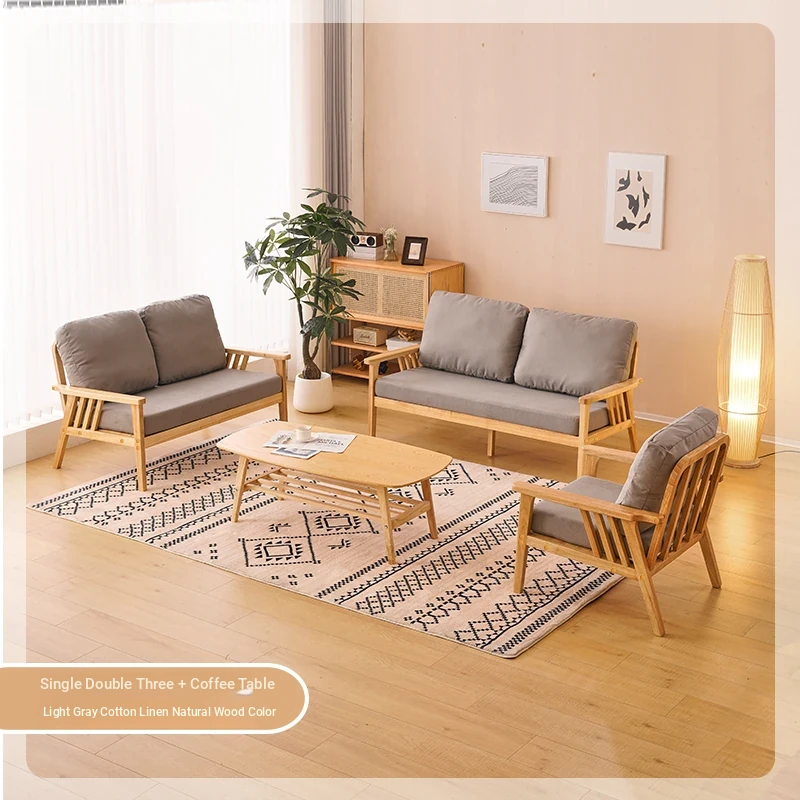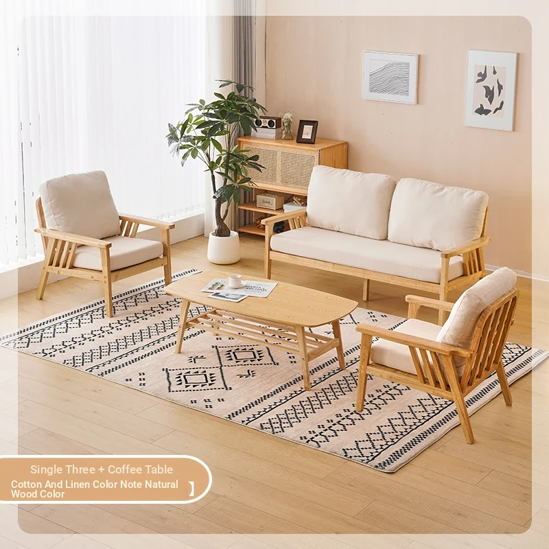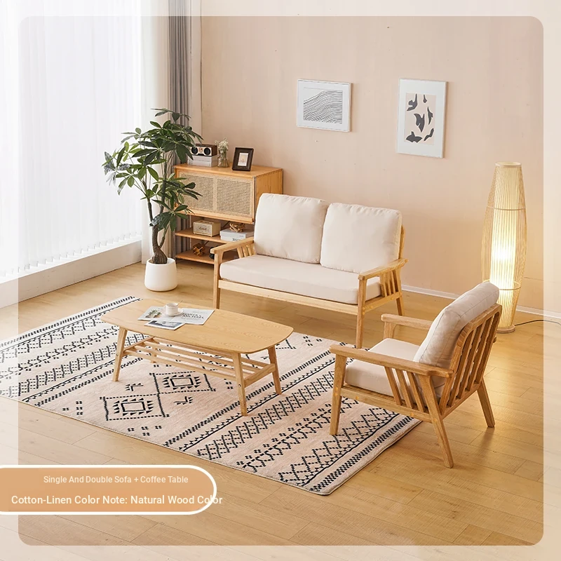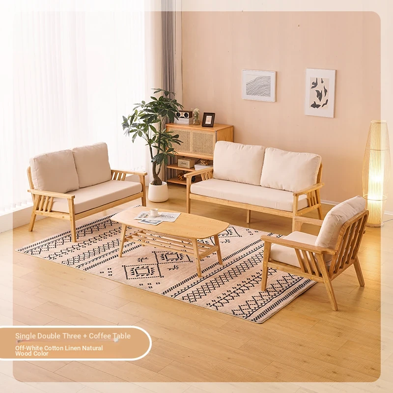 "Versatile Solid Wood Fabric Sofa Set for Small Living Rooms - Double Three-Person Combination, Washable, in Natural Wood Color for Year-Round Comfort"