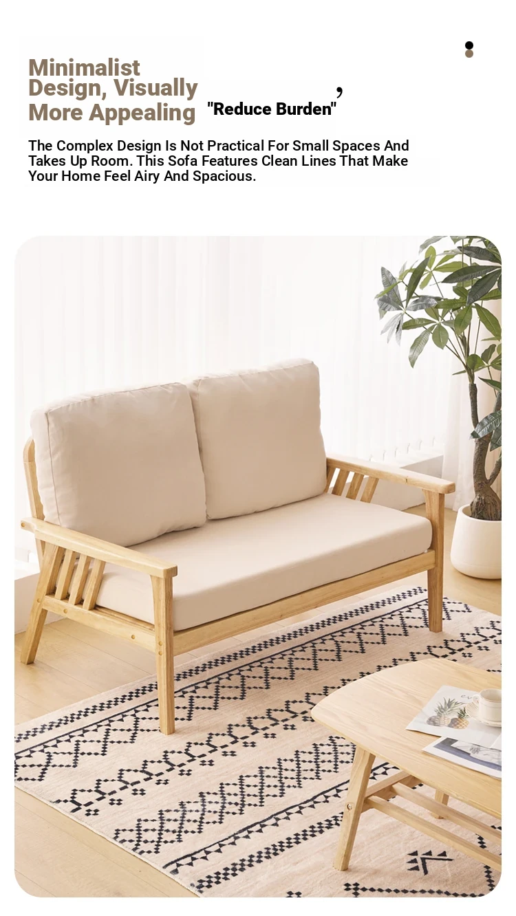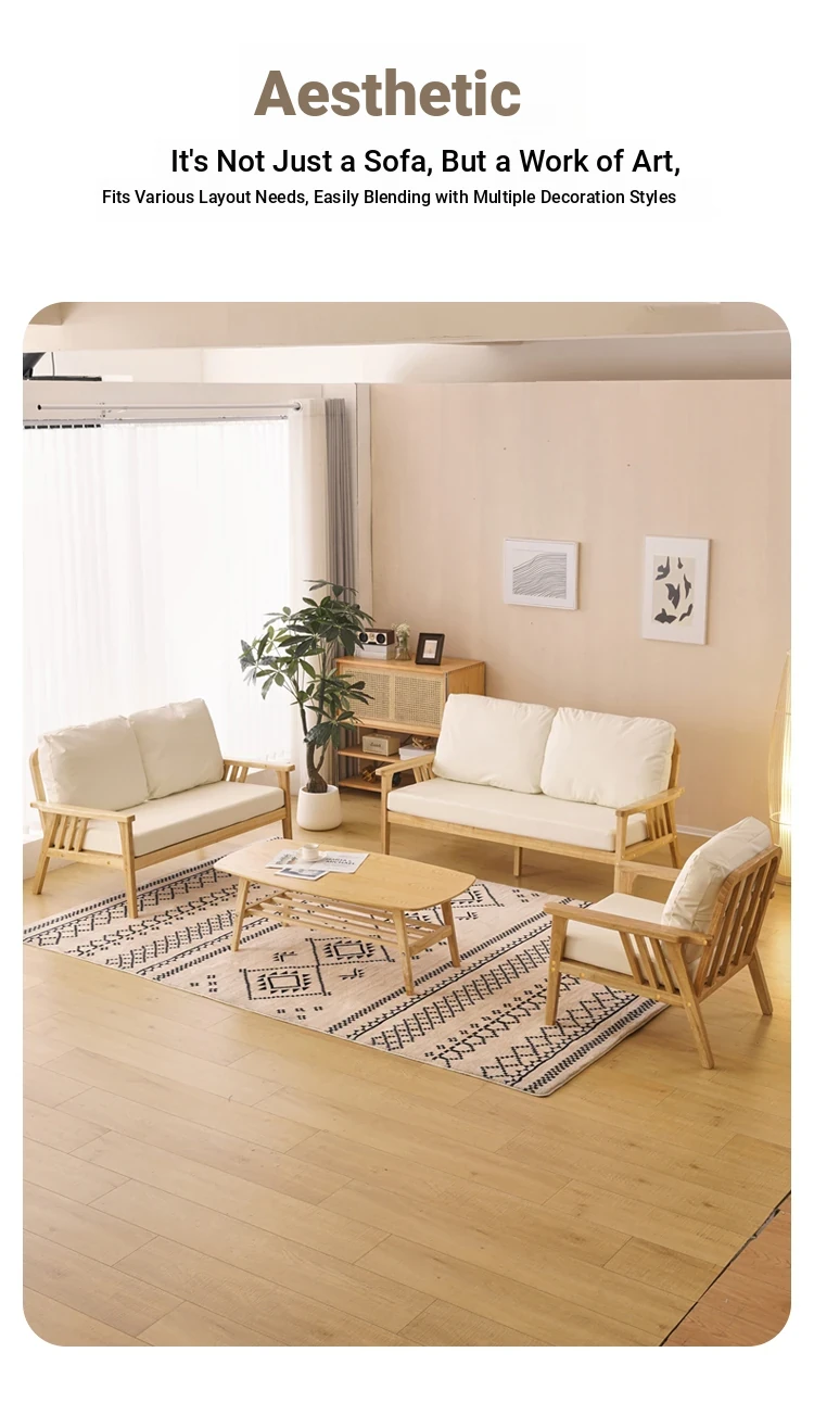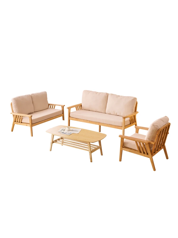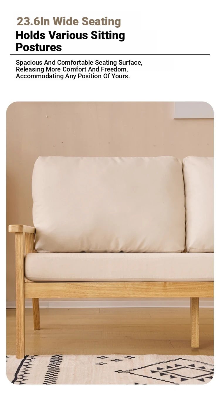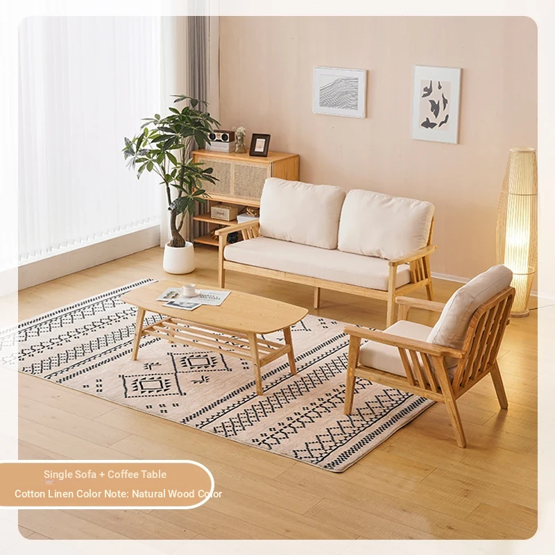 "Versatile Solid Wood Fabric Sofa Set for Small Living Rooms - Double Three-Person Combination, Washable, in Natural Wood Color for Year-Round Comfort"