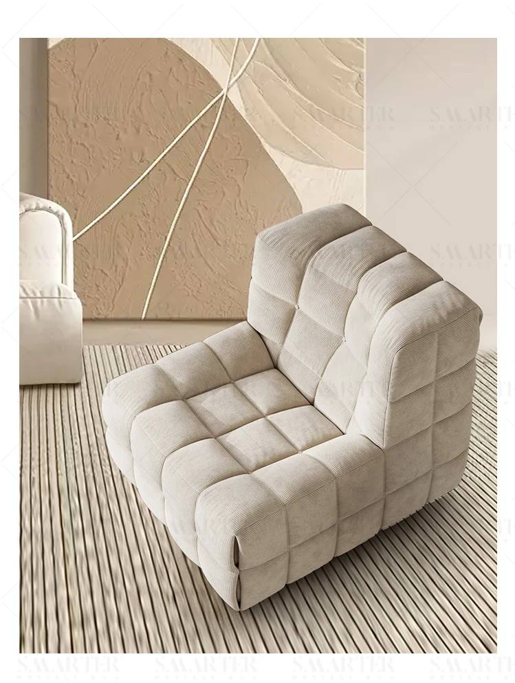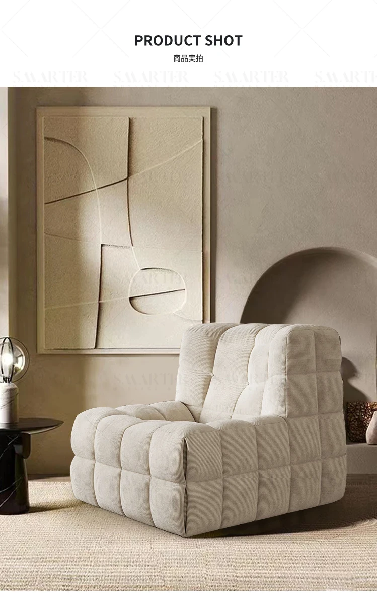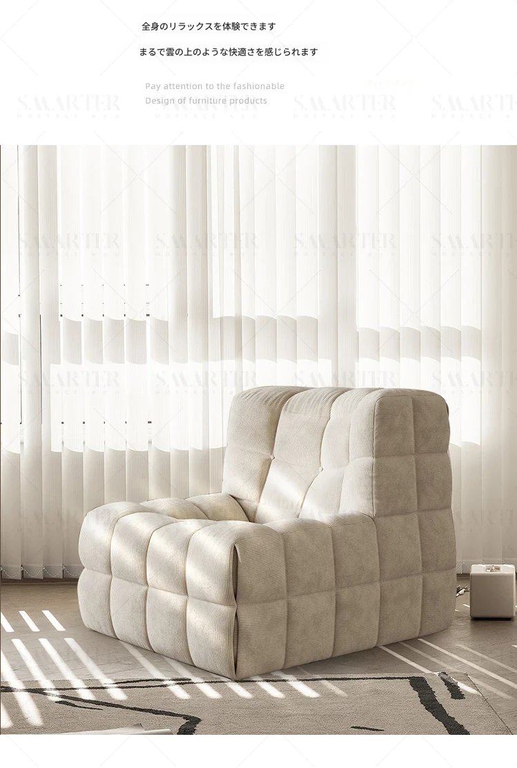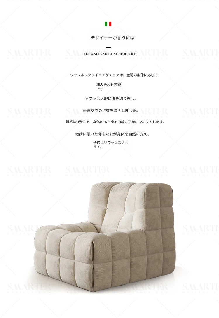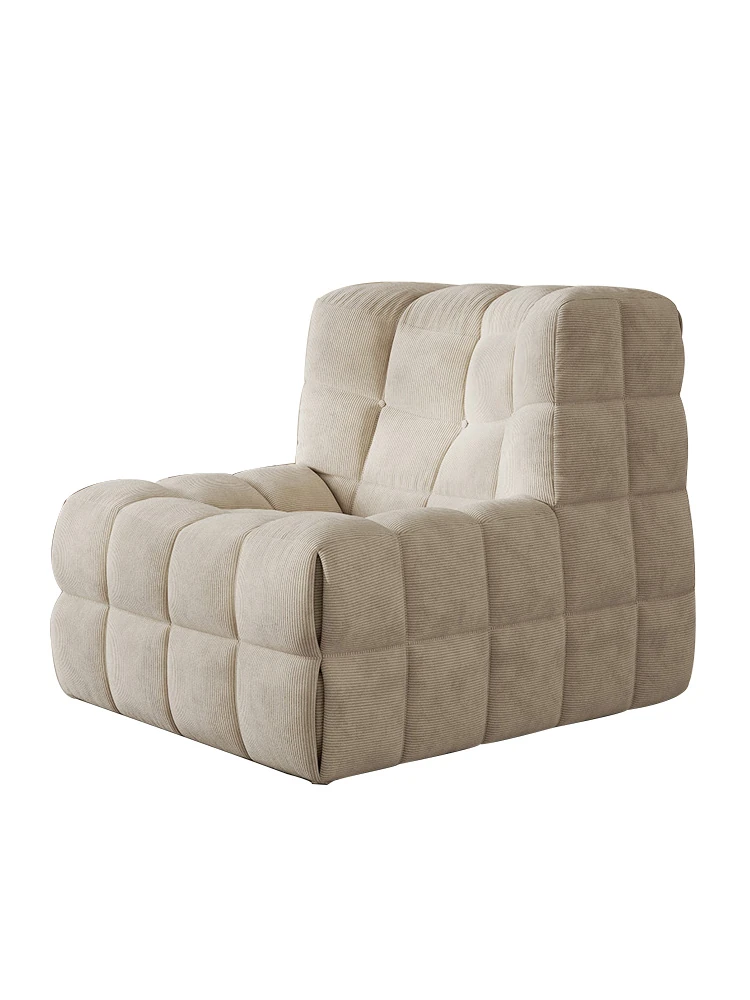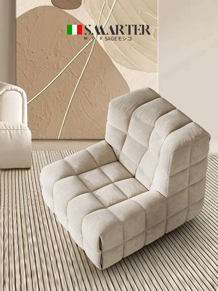 ワッフル鹿島ソファチェア - イタリアンミニマリズムデザインのリラックスチェア、くつろぎのひとときを提供する豆腐ブロックスタイルのクリーム風単独椅子。あなたのリビングルームにぴったりのデザインです!