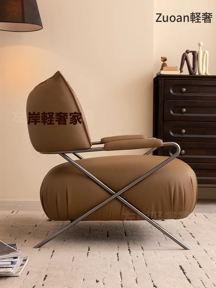 睿瑾匠鑫デザイナーの一人用レザーソファチェア - シンプルでスタイリッシュなリビングルーム用リラックスチェア、バルコニーにも最適なモダン北欧スタイルの談話椅子!